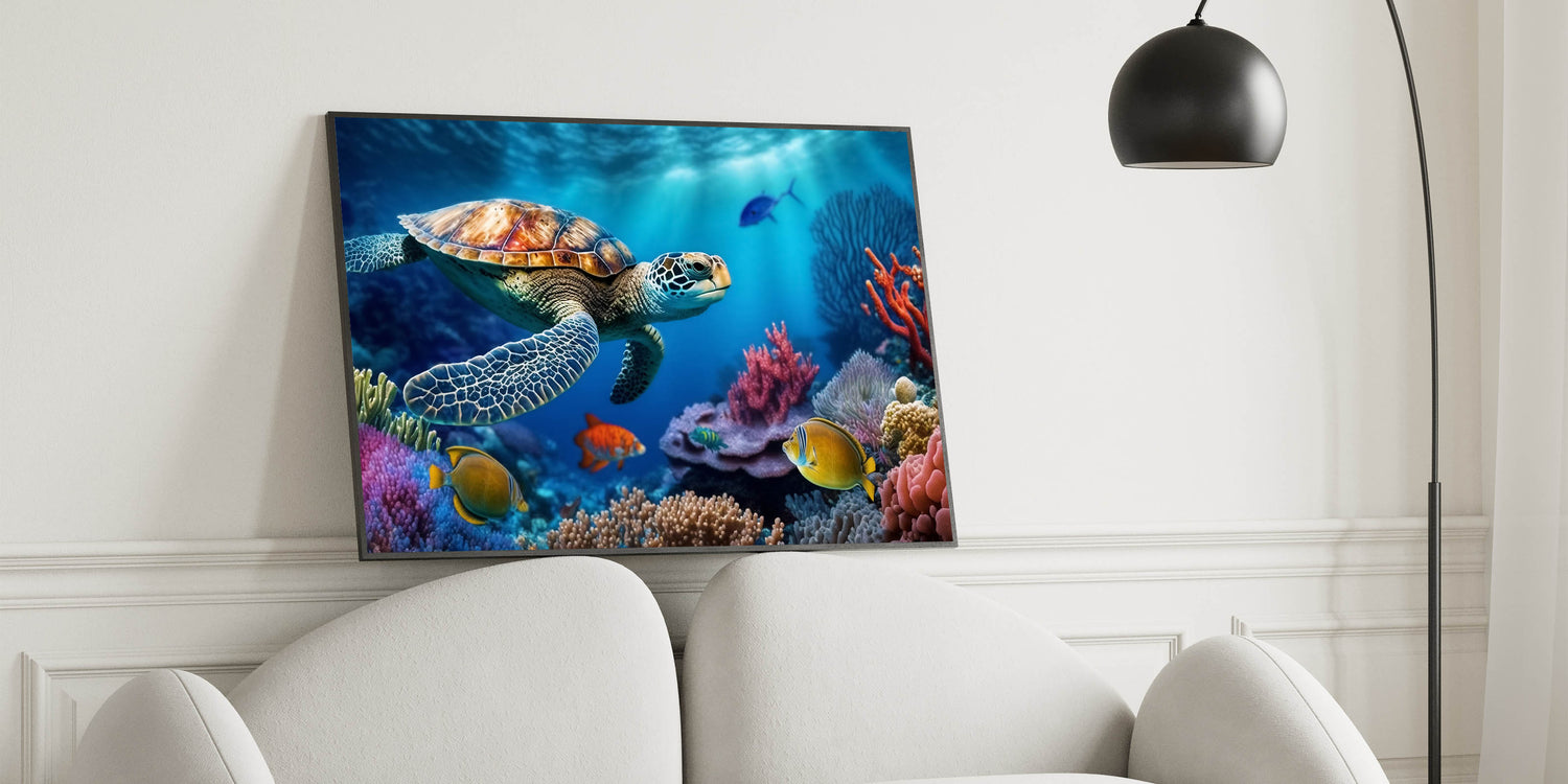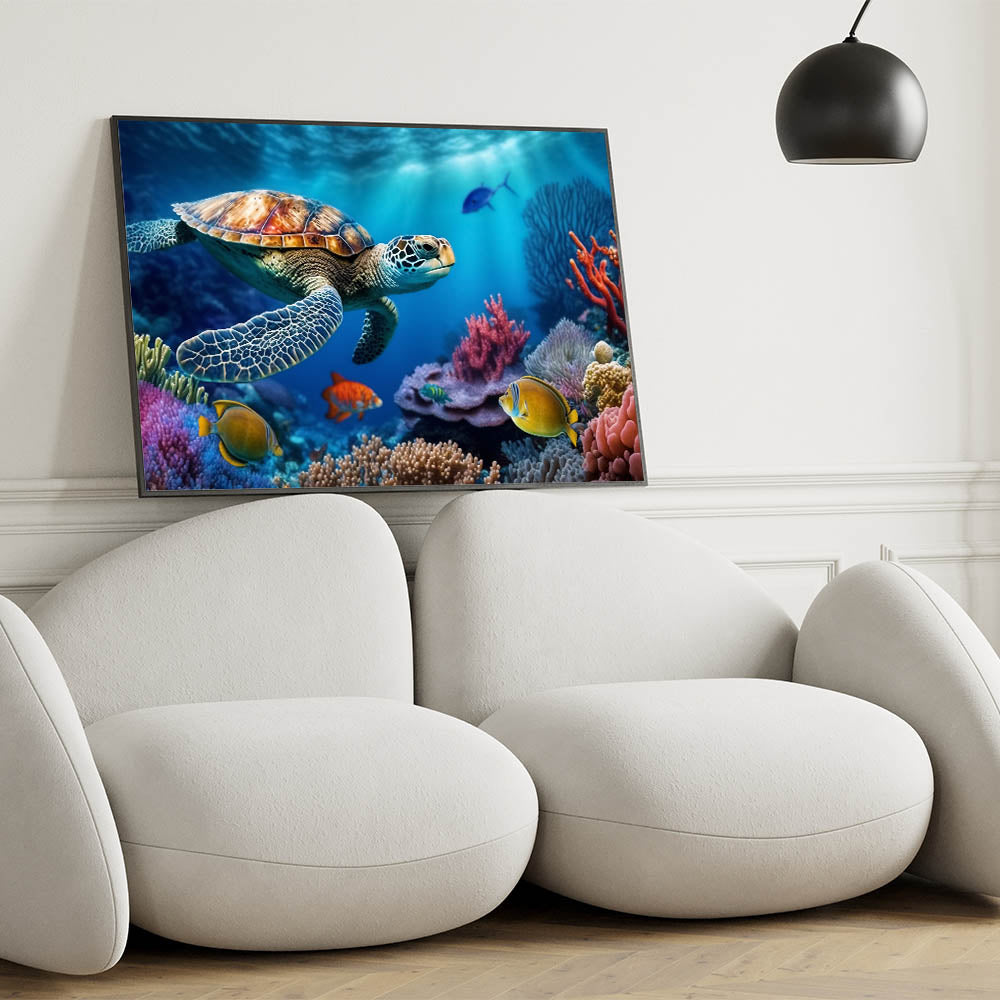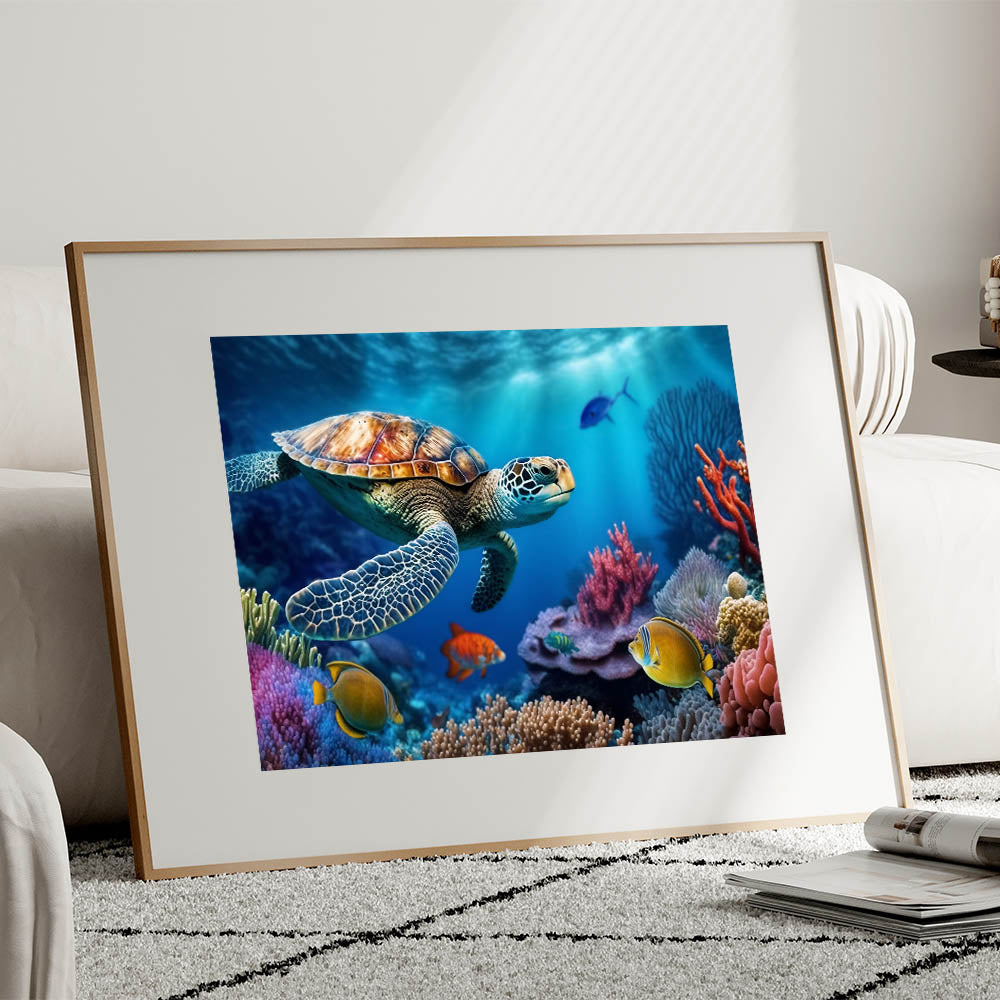 - Vibrant Design: A colorful and detailed portrayal of a sea turtle exploring a vibrant coral reef, perfect for adding a lively touch to any room.