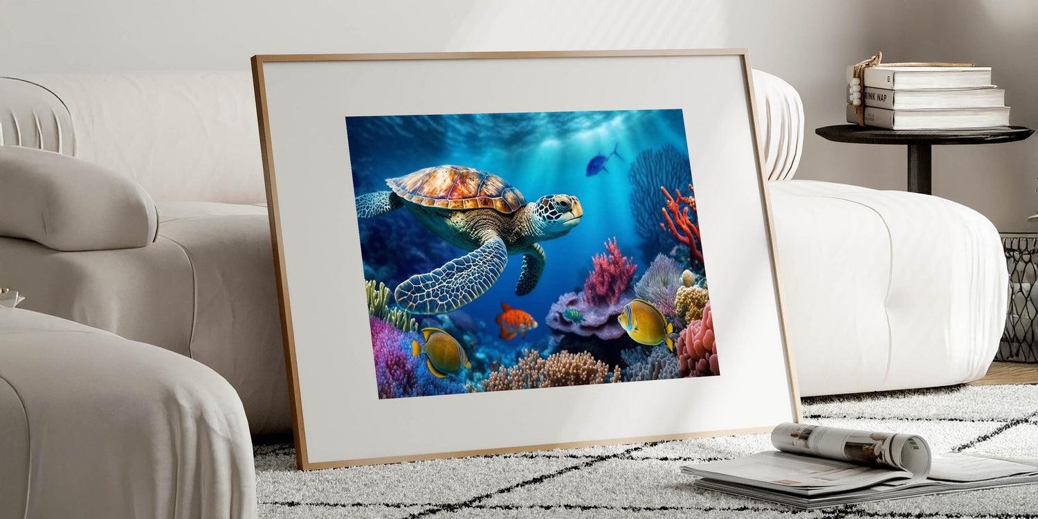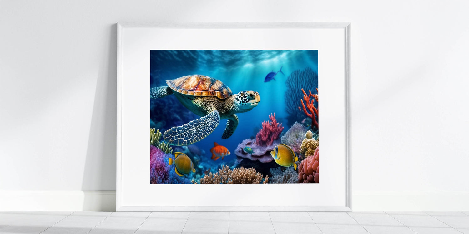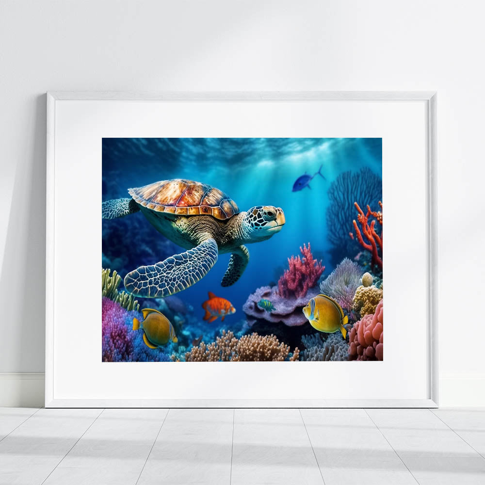 - Vibrant Design: A colorful and detailed portrayal of a sea turtle exploring a vibrant coral reef, perfect for adding a lively touch to any room.