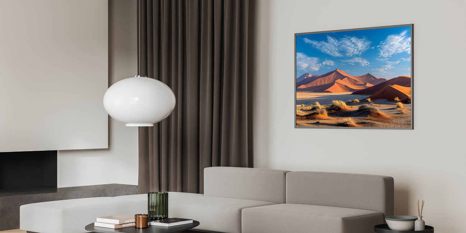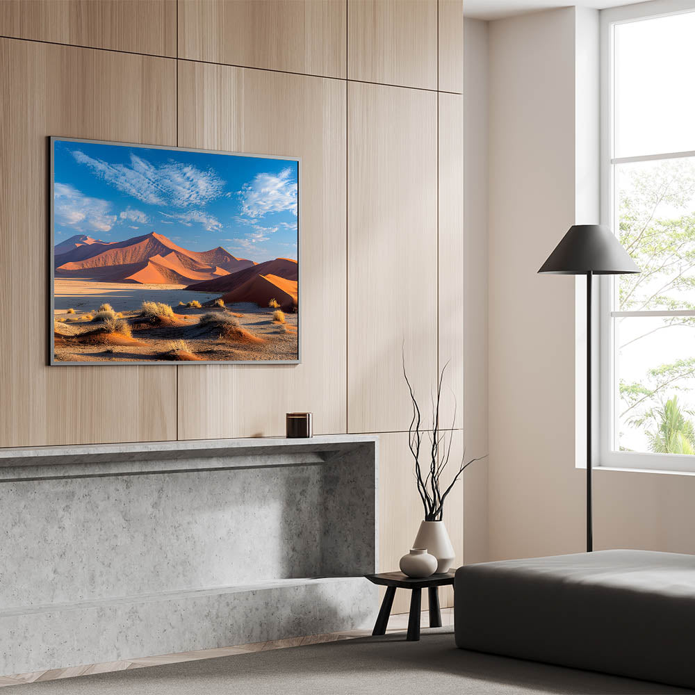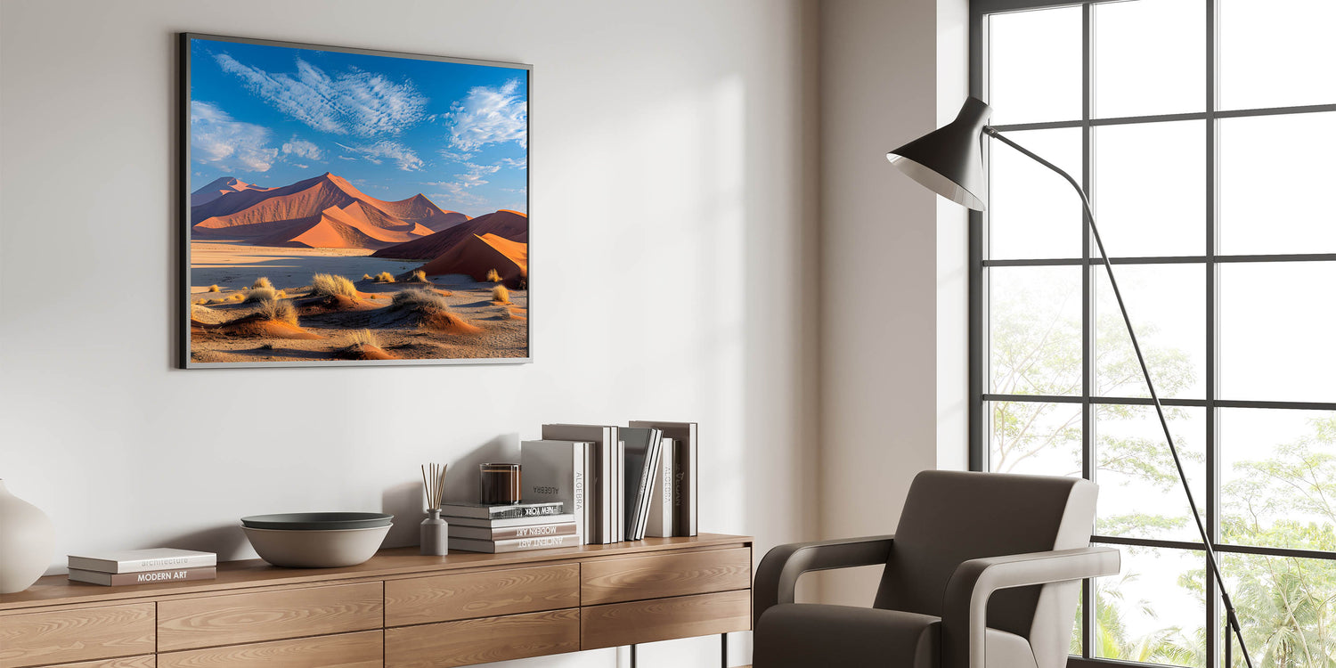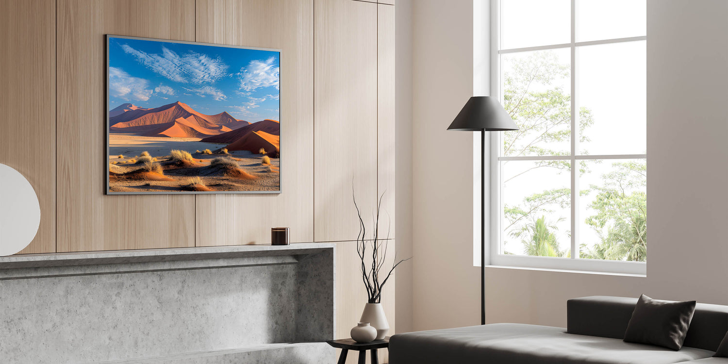 - High-quality desert dune wall art available in various formats, including stretched canvas, framed canvas, acrylic glass, and more.