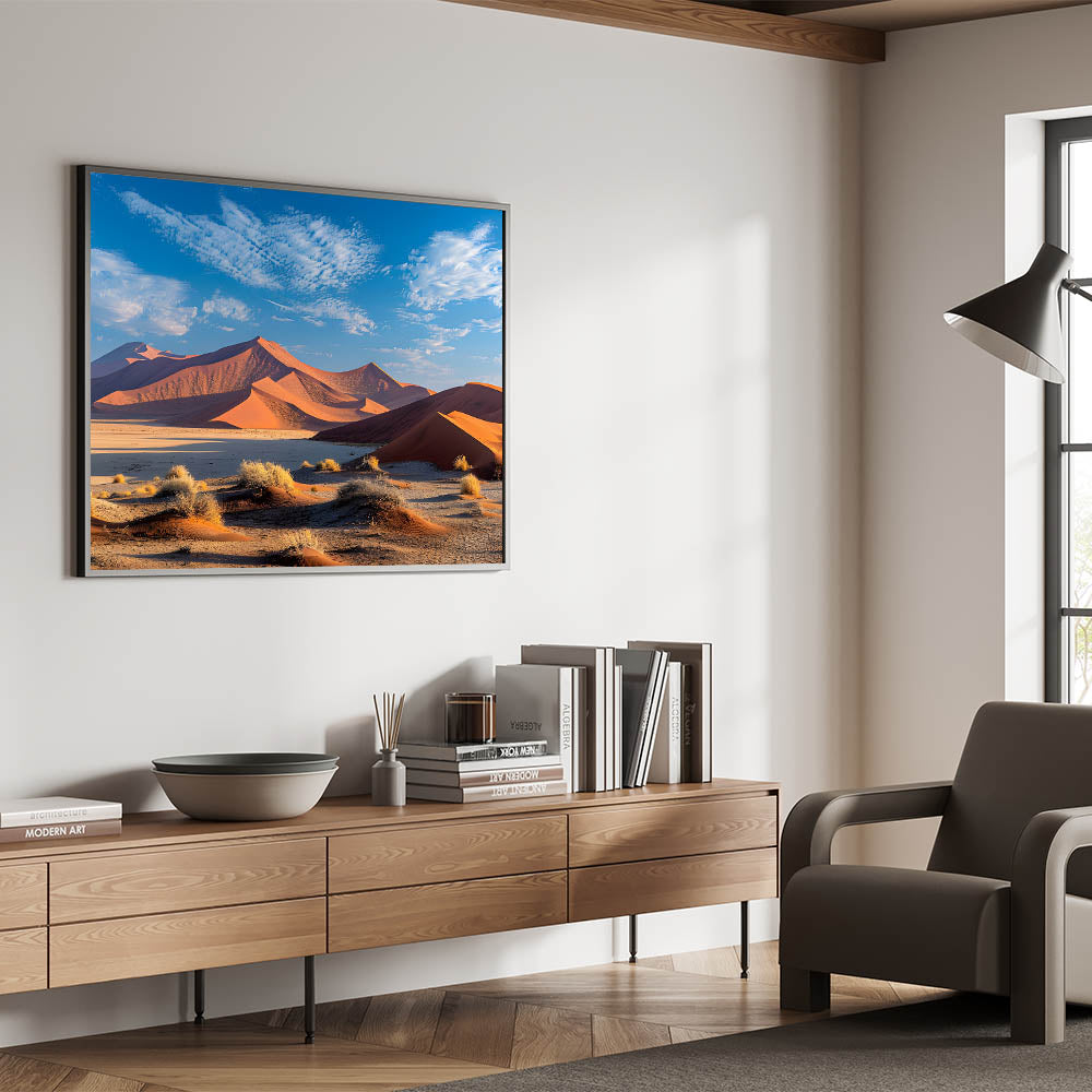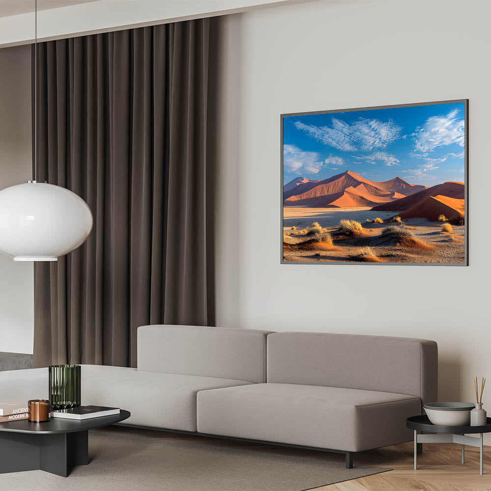 Add a burst of vibrant color to your space with this stunning desert dune wall art, featuring dramatic red sand dunes set against a bright blue sky. The striking contrast between the rich red hues of the dunes and the deep blue of the sky creates a dynamic and captivating scene, perfect for bringing the warmth and beauty of the desert into your home.