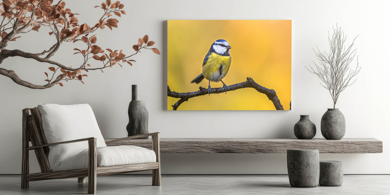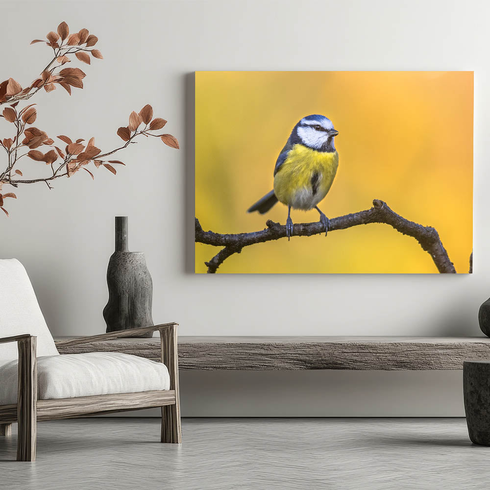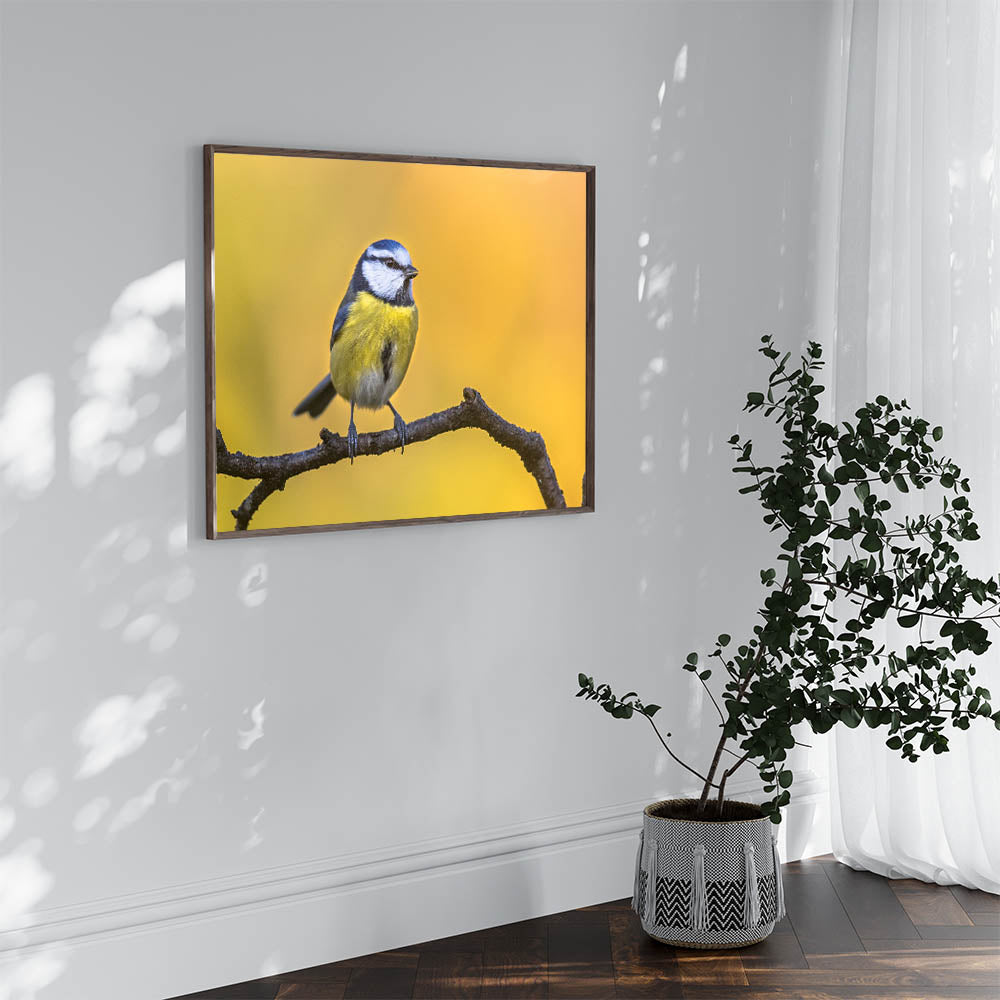 Add a burst of color and nature's charm to your space with this Vibrant Garden Birds Wall Art. Featuring a stunning photograph of a blue and yellow bird perched on a branch against a glowing golden background, this piece captures the beauty of nature in its purest form. The bright, contrasting colors of the bird's feathers against the warm tones of the background make this artwork a lively and eye-catching addition to any room.
