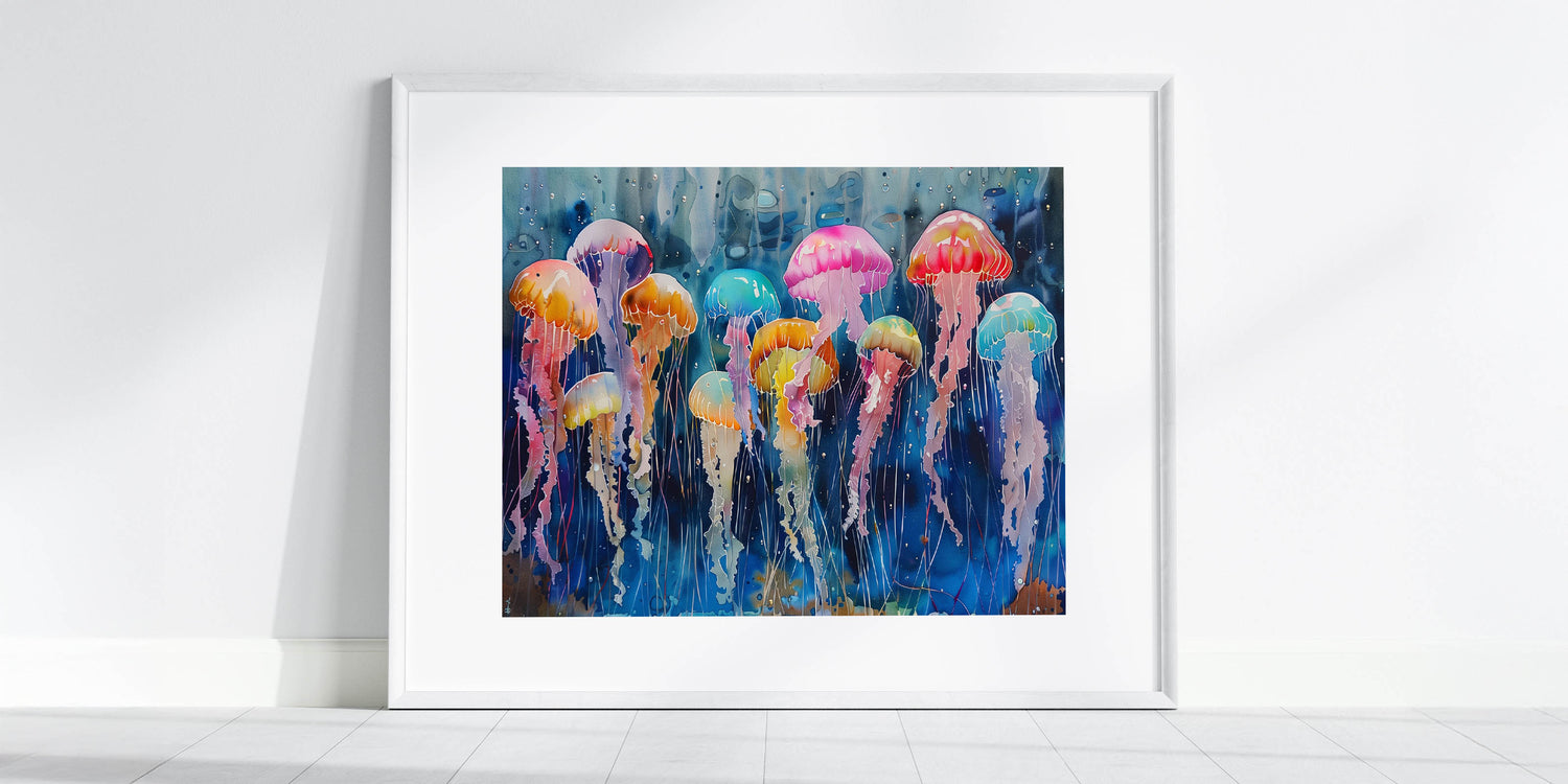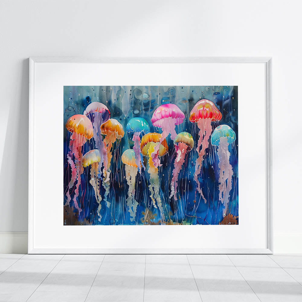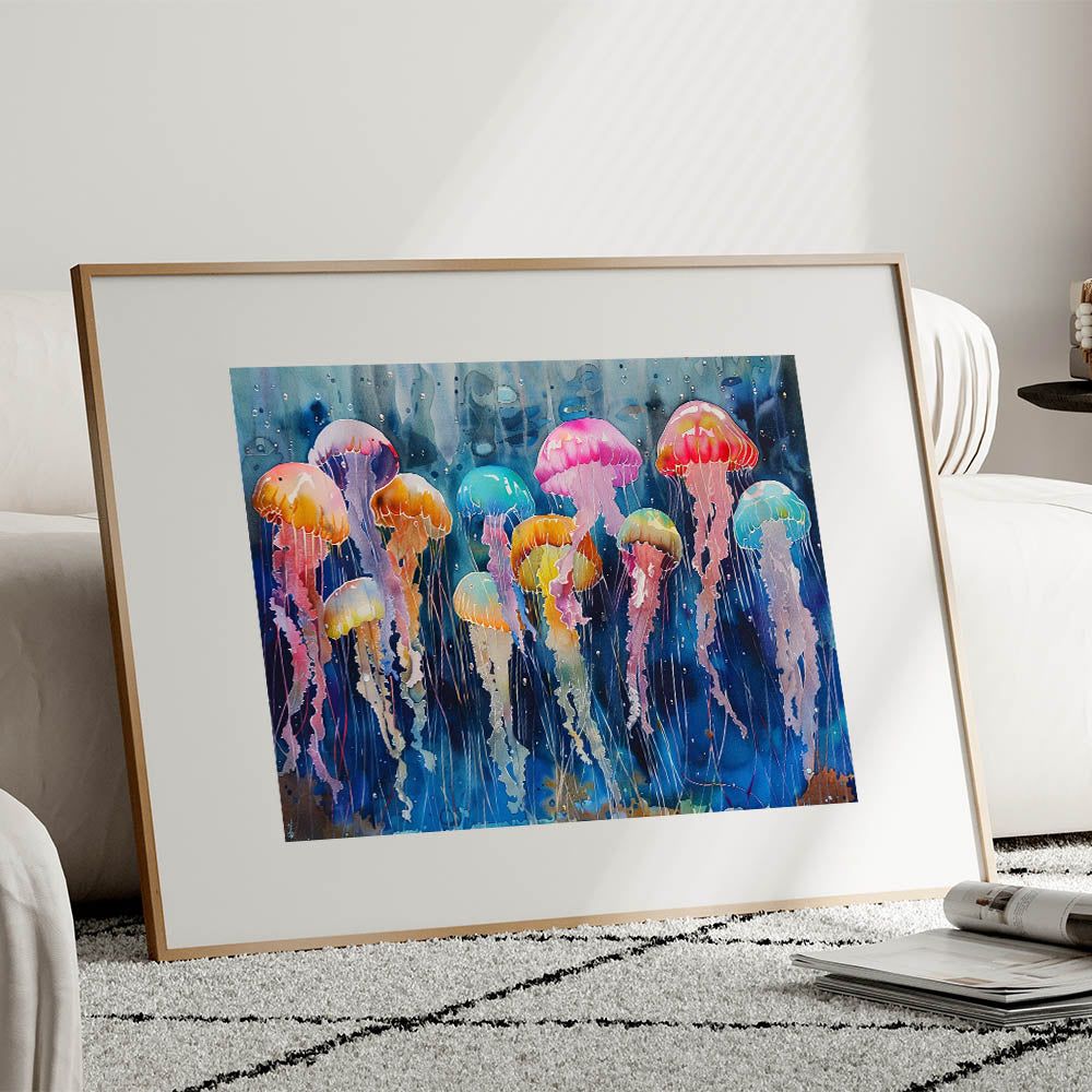 Elevate your decor with this vibrant jellyfish art print, perfect for those who love the ocean’s beauty and wish to bring a piece of it into their home. This artwork also makes an excellent gift for nature lovers and those who appreciate colorful, aquatic-inspired art.