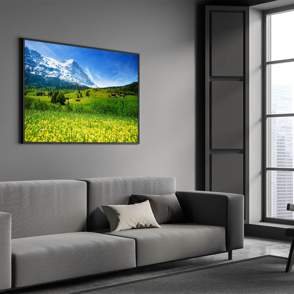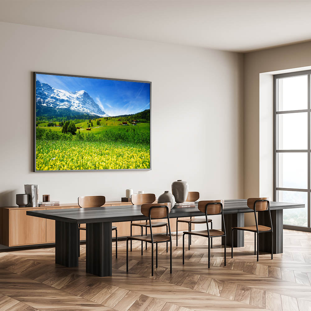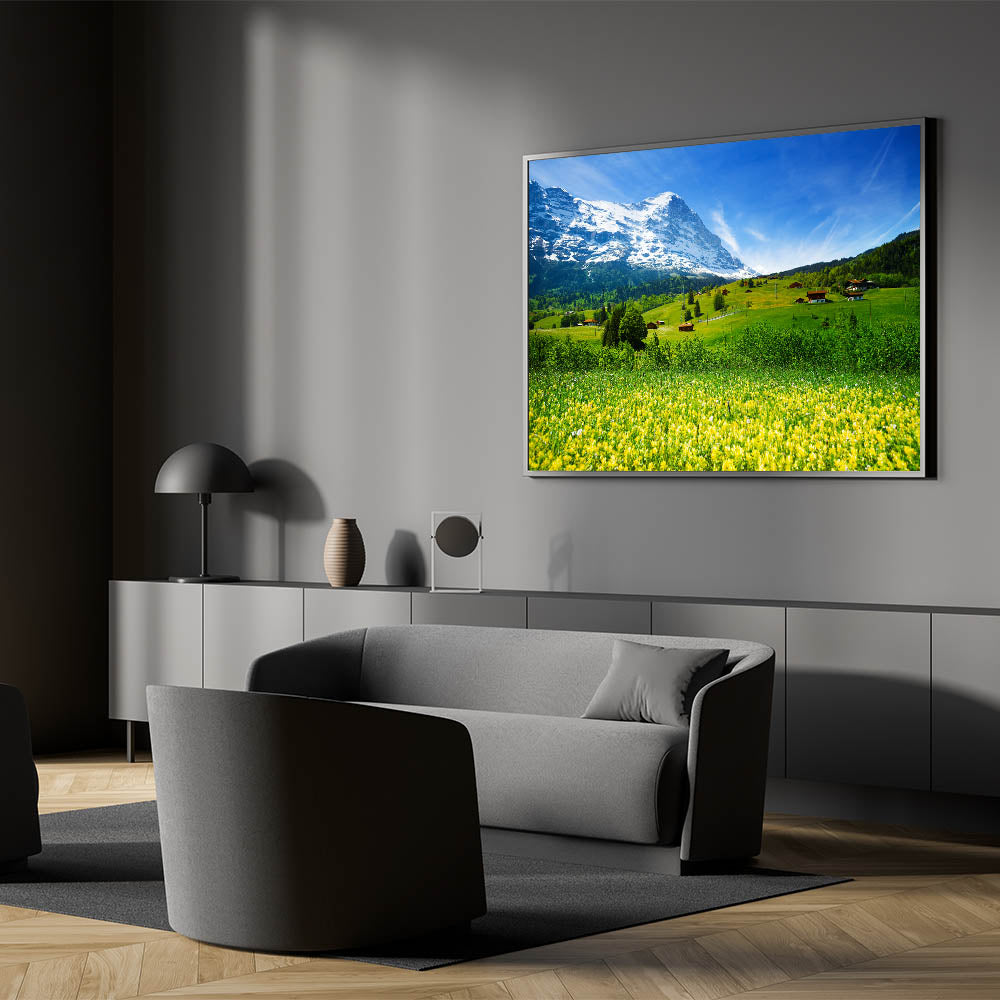 Bring the serenity and joy of an alpine meadow into your home with this beautiful valley-themed wall art. Perfect for brightening any space, this piece will add a touch of natural elegance and vibrant color to your decor. Order now to enjoy the beauty of the mountains every day.