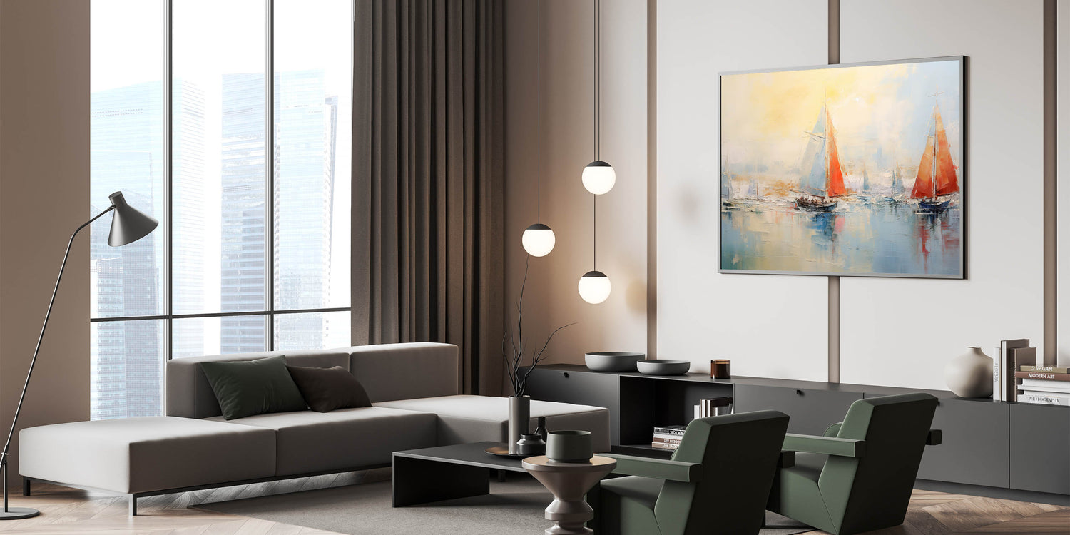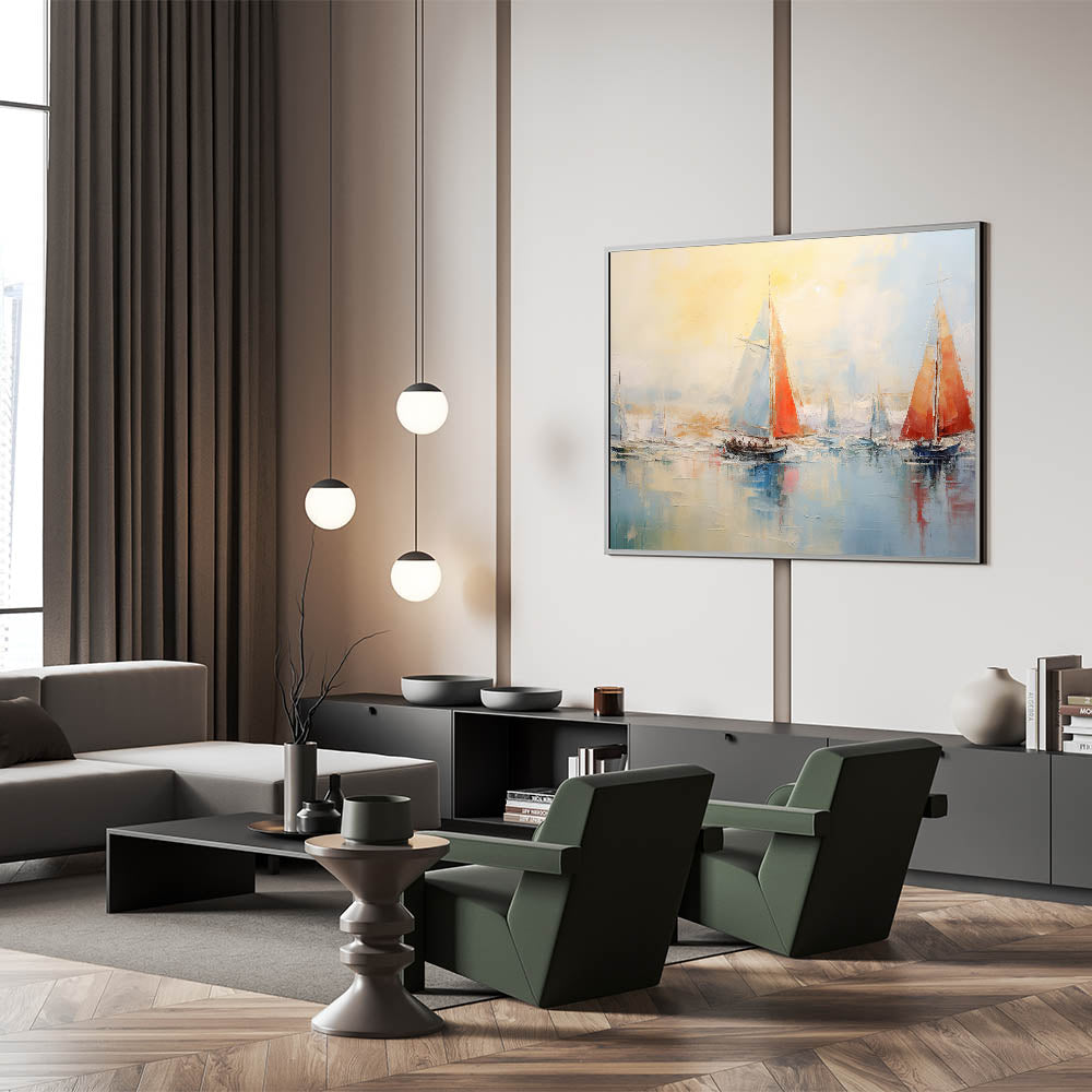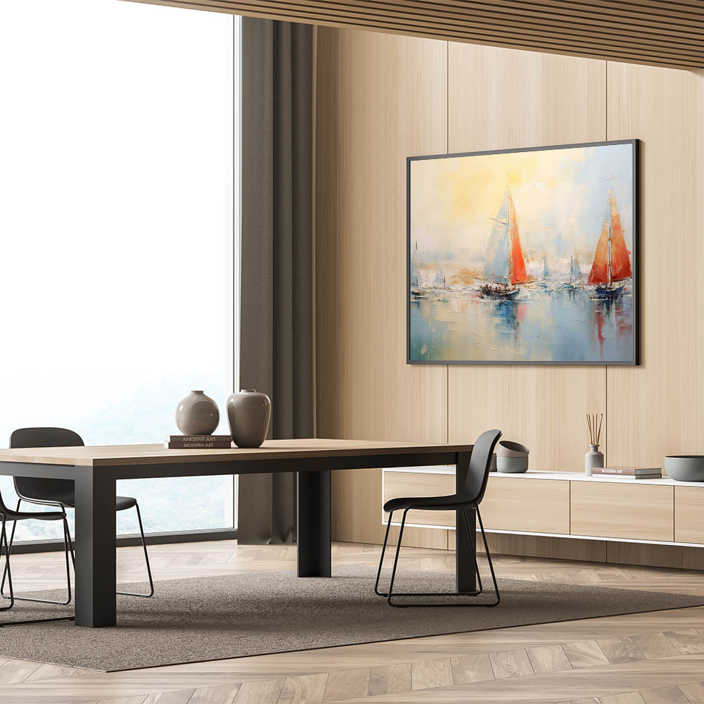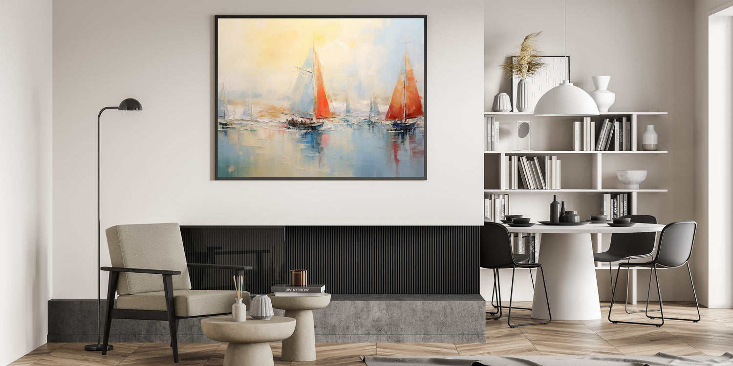 Add a splash of color and movement to your space with this vibrant sailboat wall art. This stunning piece features a lively scene of sailboats with bold red and orange sails gliding across calm waters. The textured brushstrokes and abstract style give this artwork a modern flair, while the soft blending of light and color evokes a peaceful coastal ambiance. Ideal for contemporary homes or spaces that embrace nautical themes, this handcrafted boat art is available in a variety of high-quality materials, including Stretched Canvas, Framed Canvas, Acrylic Glass, Framed Acrylic Glass, Framed Print, Rolled Canvas, and Rolled Print.