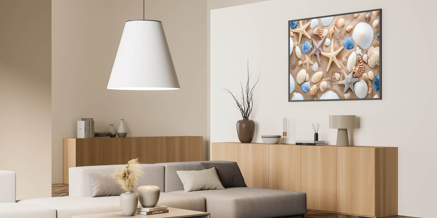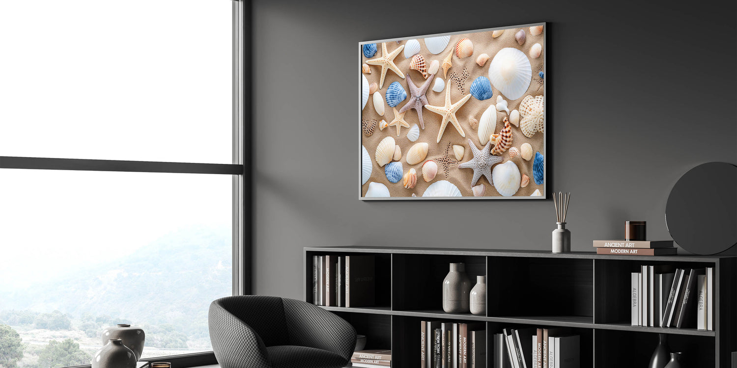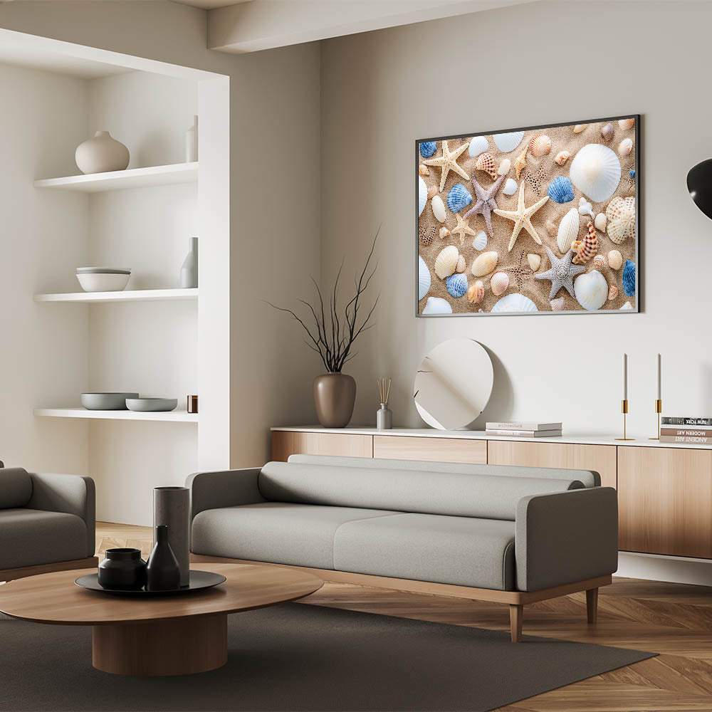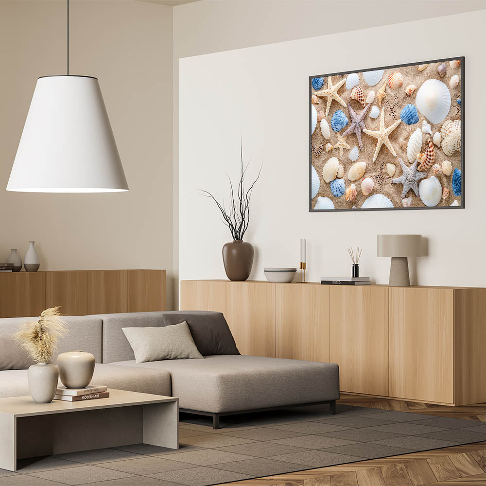 Add a touch of coastal charm to your space with this seashell and starfish Cancun wall art. Featuring a collection of intricate seashells and starfish arranged on soft sand, this vibrant print captures the essence of a tropical beach. Whether you want to bring a piece of the ocean into your living room, bedroom, or even a beach house, this high-quality Cancun beach print is the perfect way to enhance your decor.