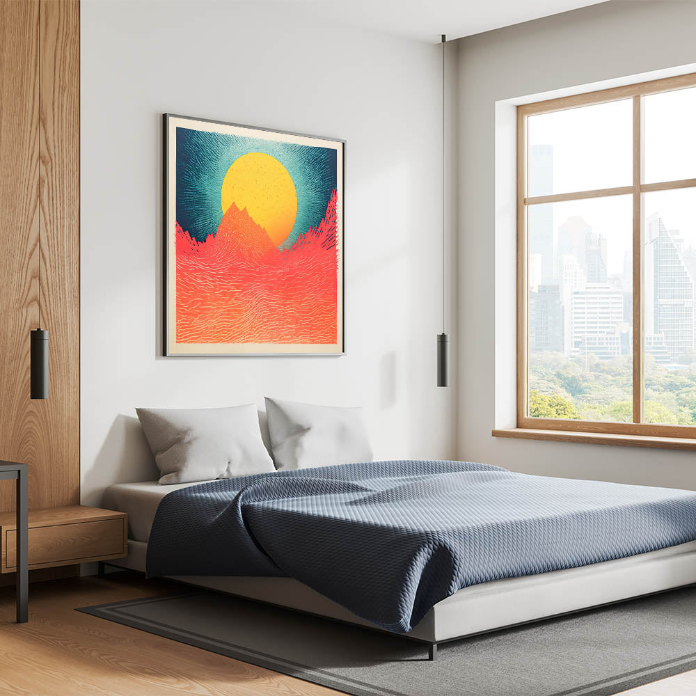 - Striking Visuals: Bold red and deep blue hues create a powerful contrast against the bright yellow sun.