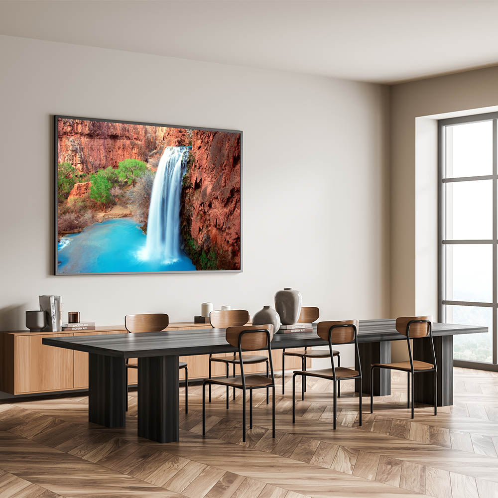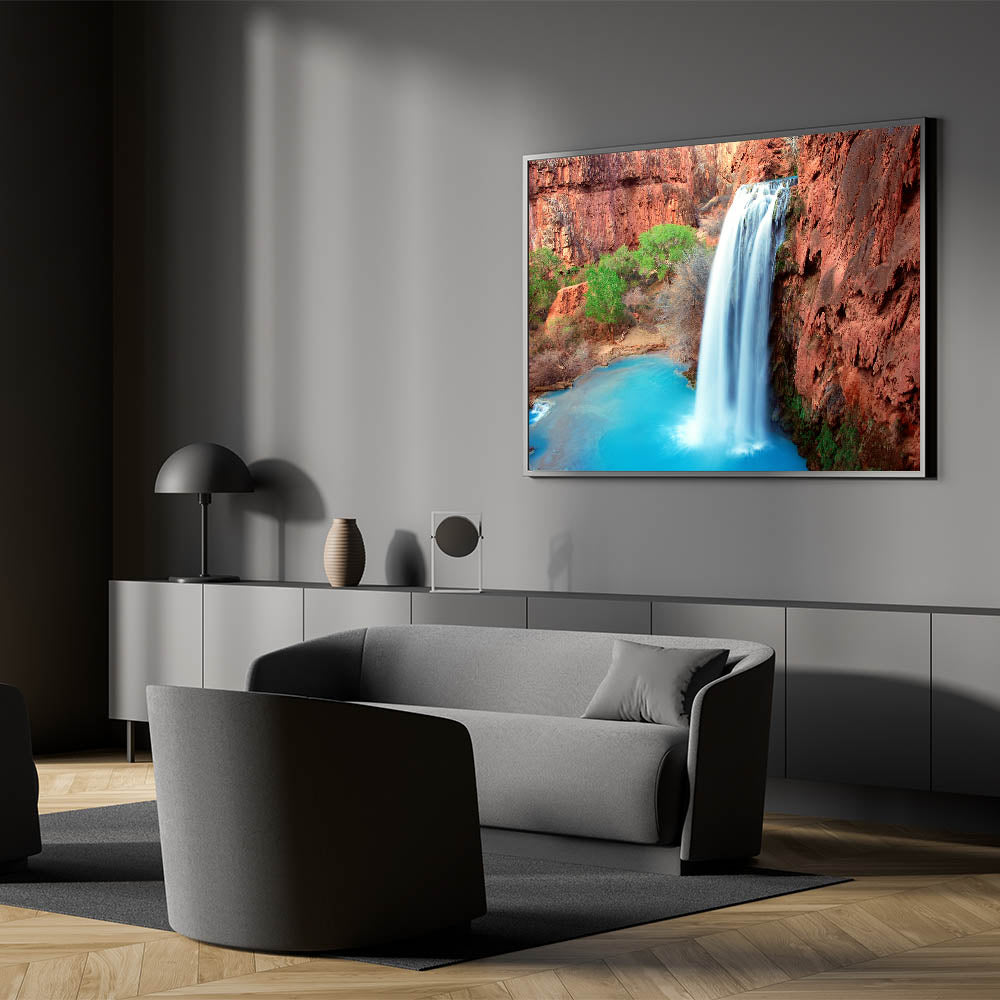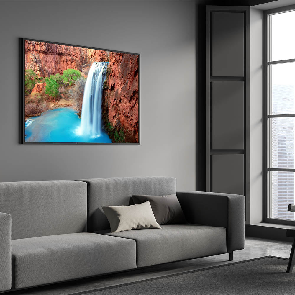 Add a burst of color and energy to your space with this vibrant waterfall canvas. This artwork captures the striking contrast of a powerful waterfall plunging into a crystal-clear turquoise pool, set against the rugged red cliffs of a desert landscape. The vivid hues and dynamic composition create a stunning visual impact, making this piece perfect for enhancing the ambiance of any room.