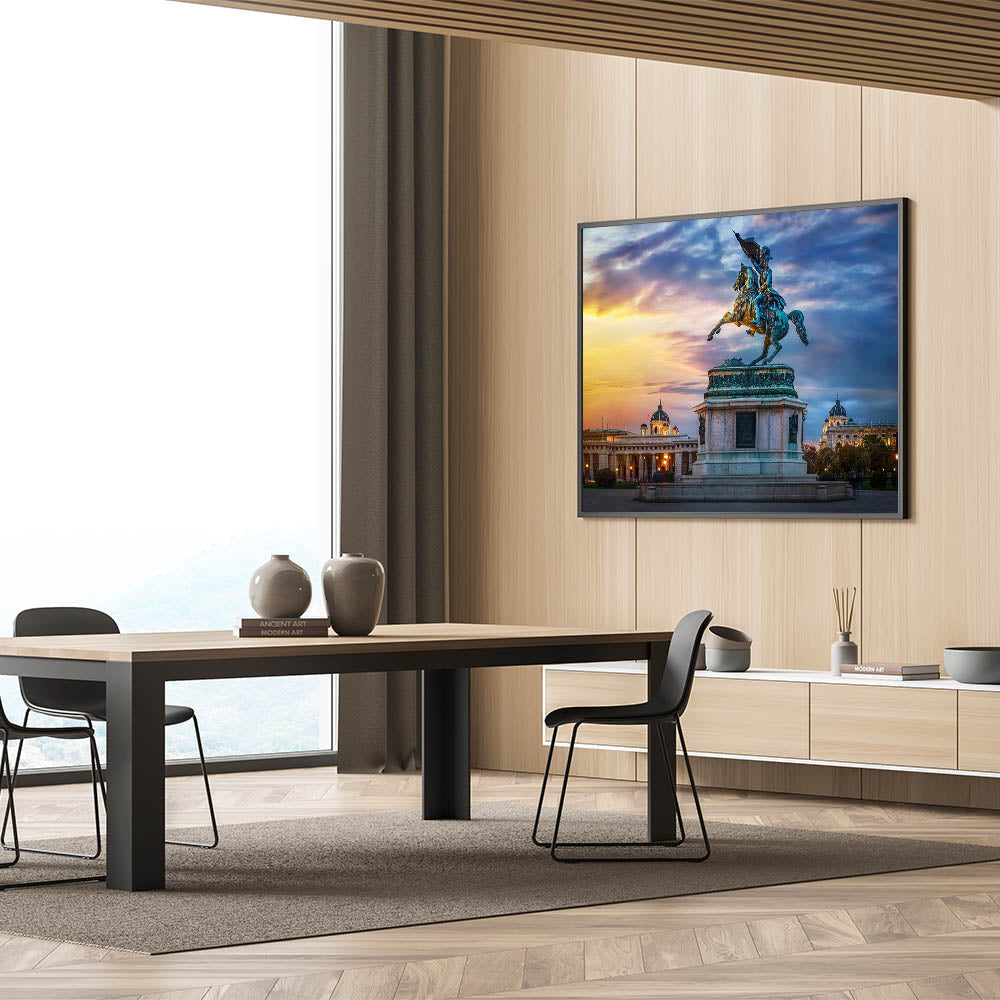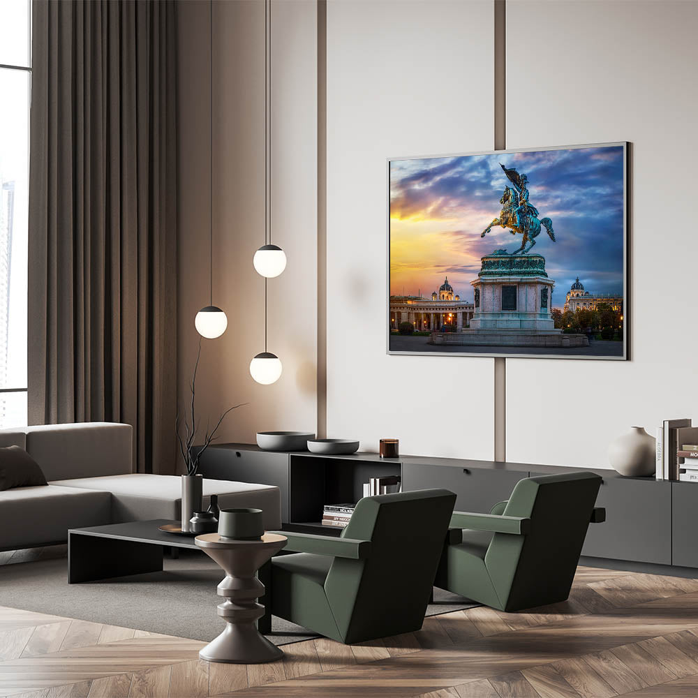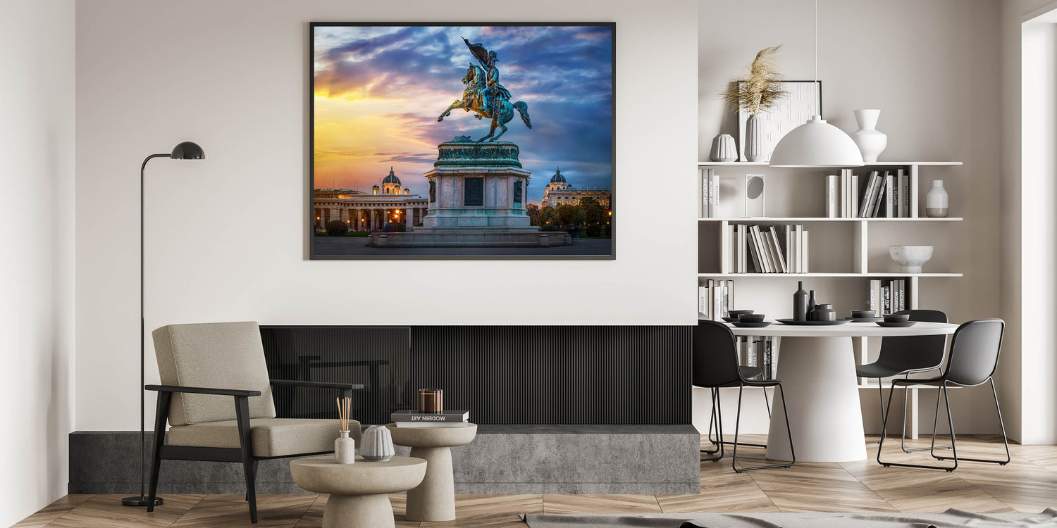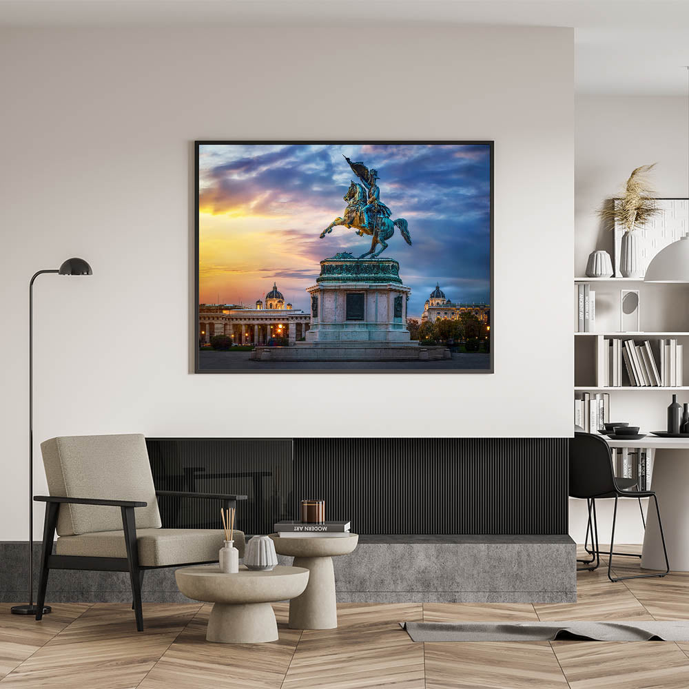 Add a touch of elegance and history to your space with this striking Vienna wall decor, featuring the iconic equestrian statue of Archduke Charles in Heldenplatz, Vienna. This stunning piece of Austria photography art captures the majestic statue against the backdrop of a vibrant sunset sky, highlighting the rich history and culture of Austria’s capital. The contrast between the bronze statue and the colorful evening sky creates a visually captivating artwork, perfect for any room.