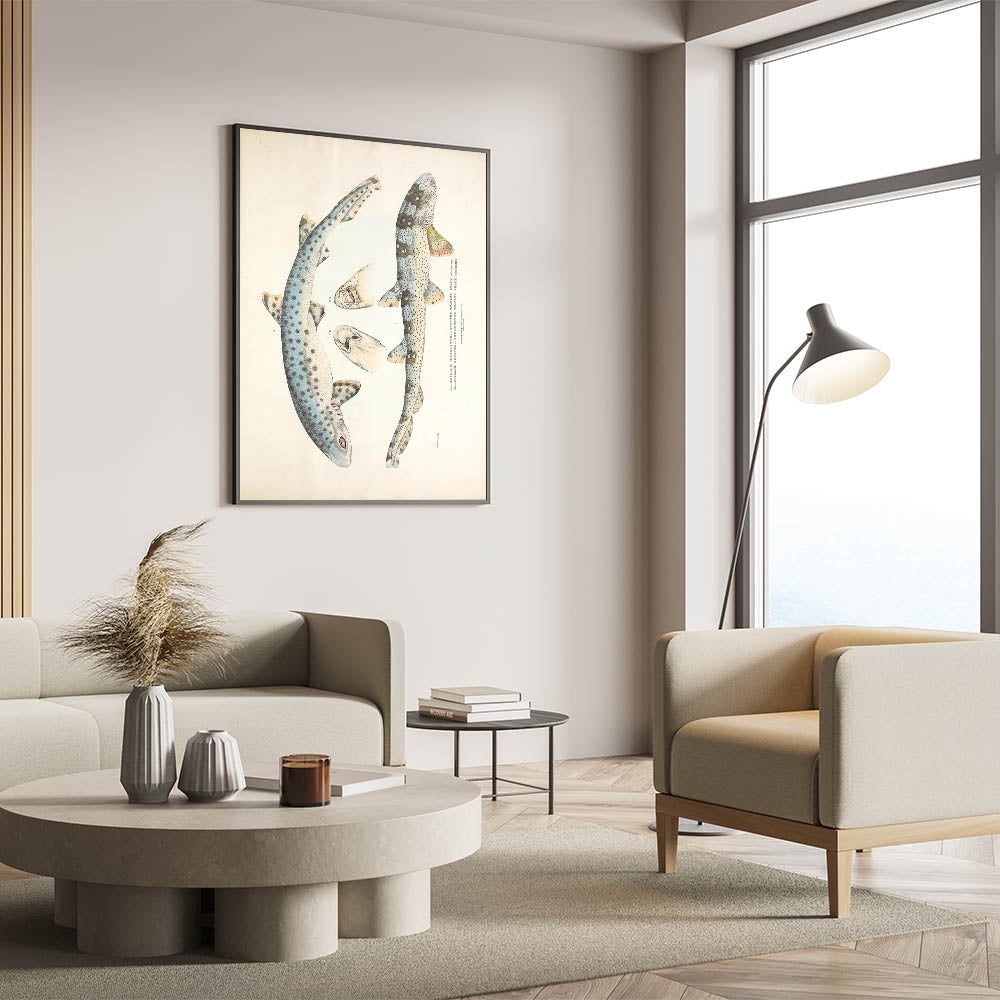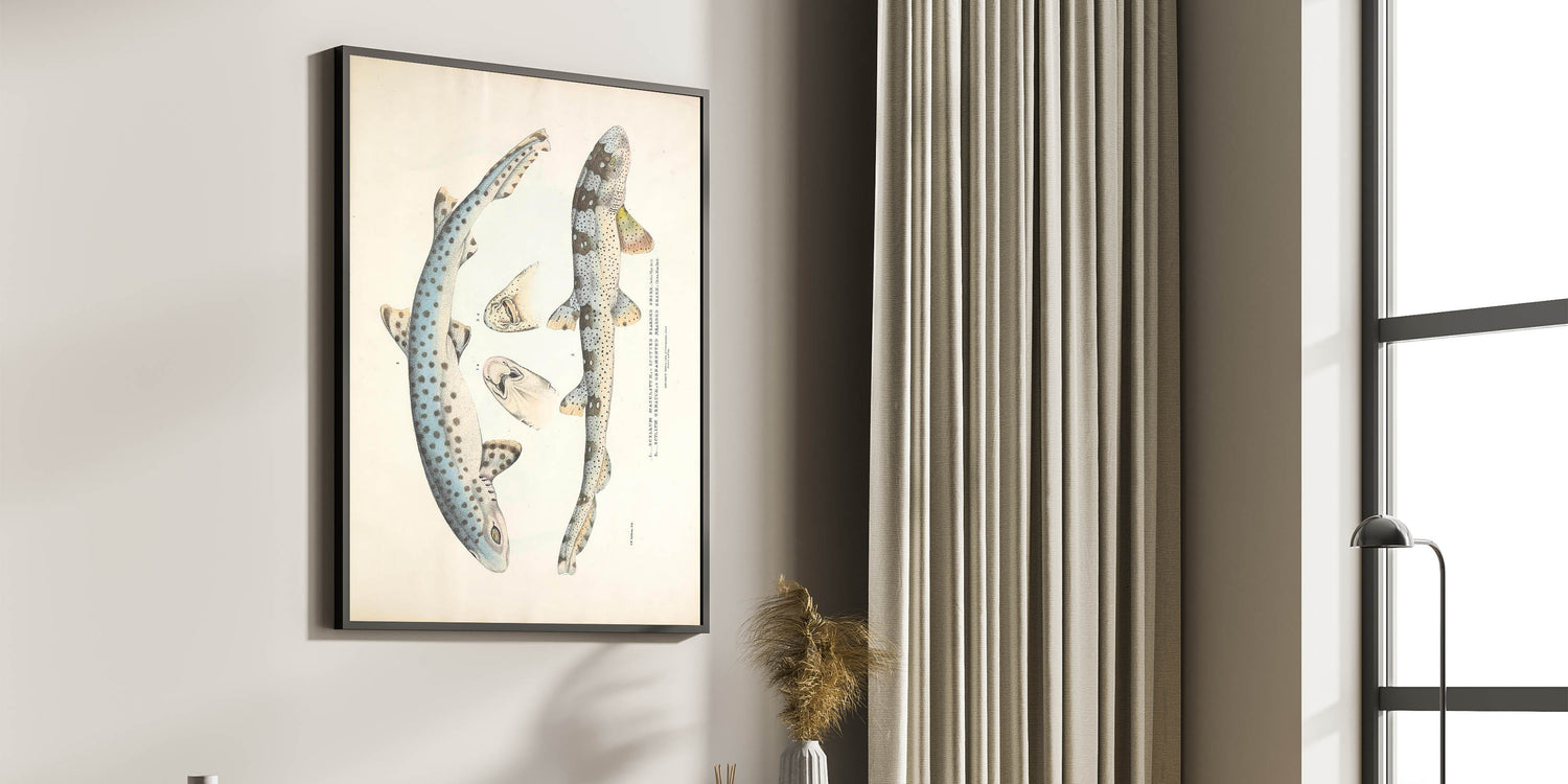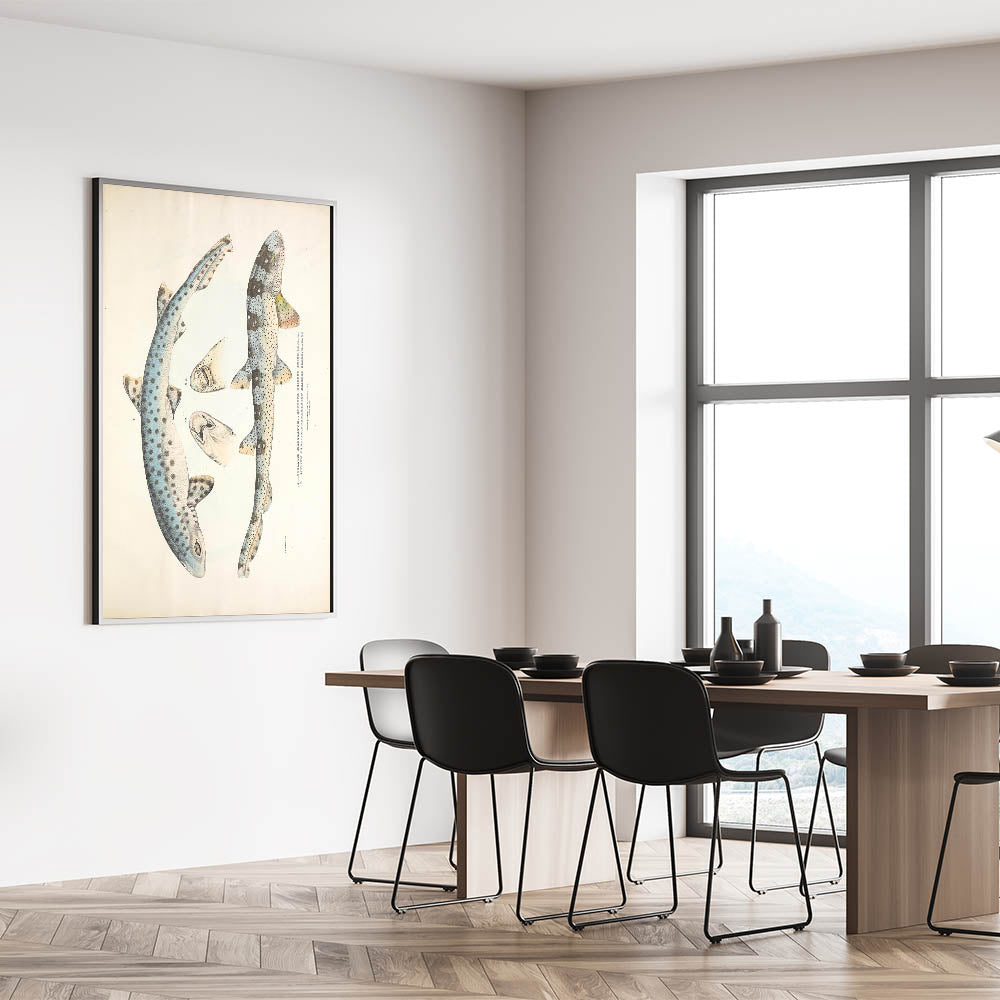 Bring a touch of vintage marine life into your home with our "Vintage Animal Art: Spotted Shark" illustration. This piece features detailed renderings of spotted sharks, showcasing their unique patterns and anatomical details. Perfect for adding a classic, educational touch to any room, this artwork is available in a variety of high-quality materials, including stretched canvas, framed prints, and acrylic glass.