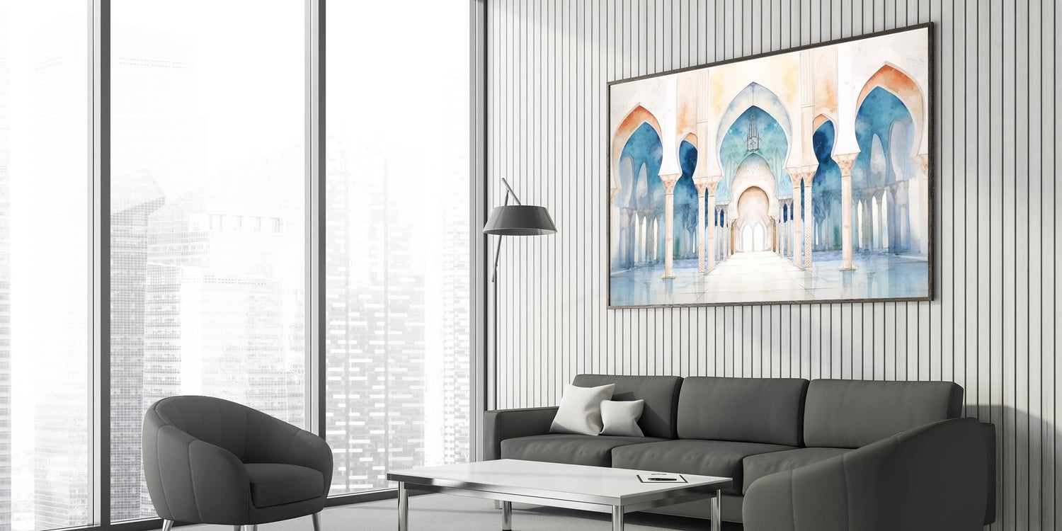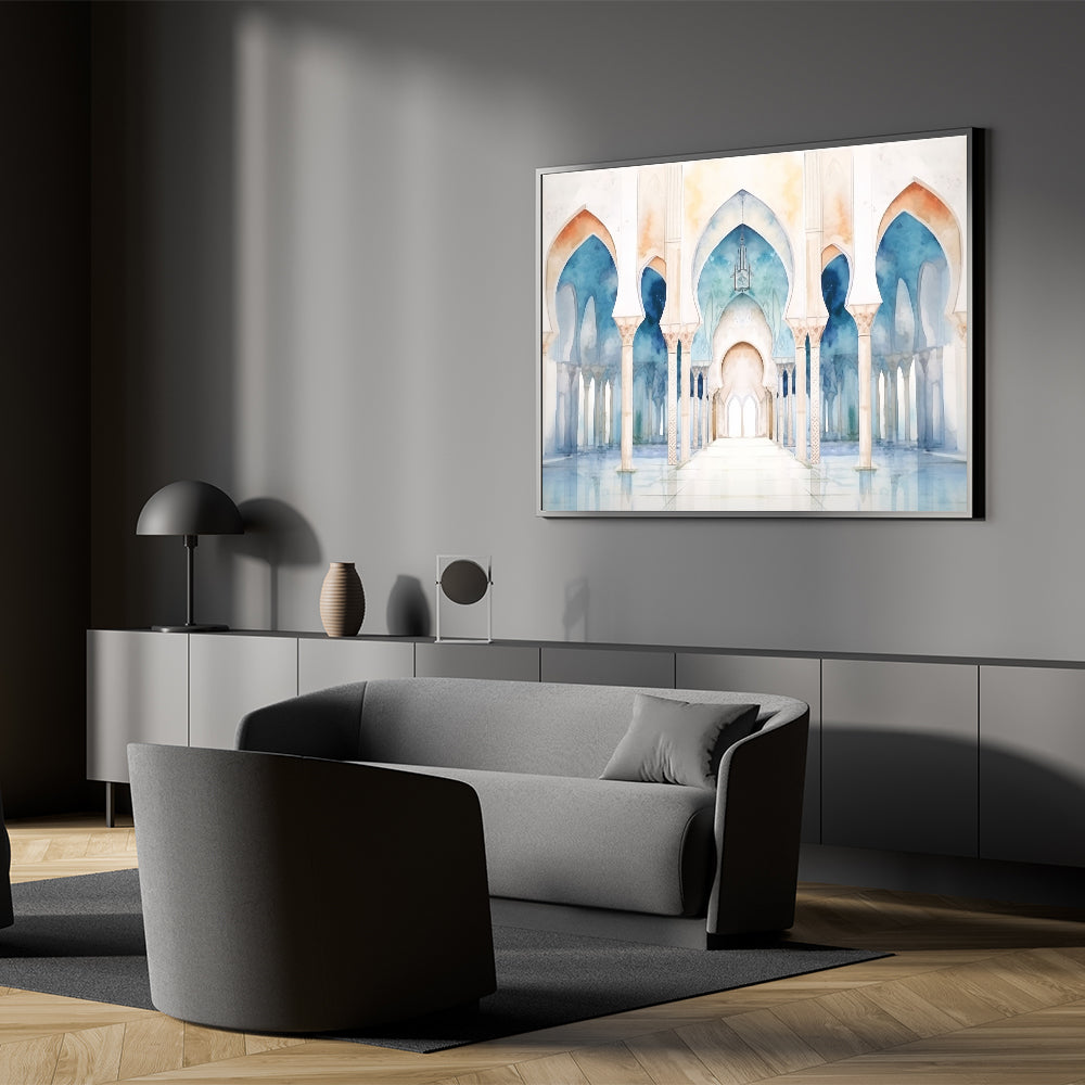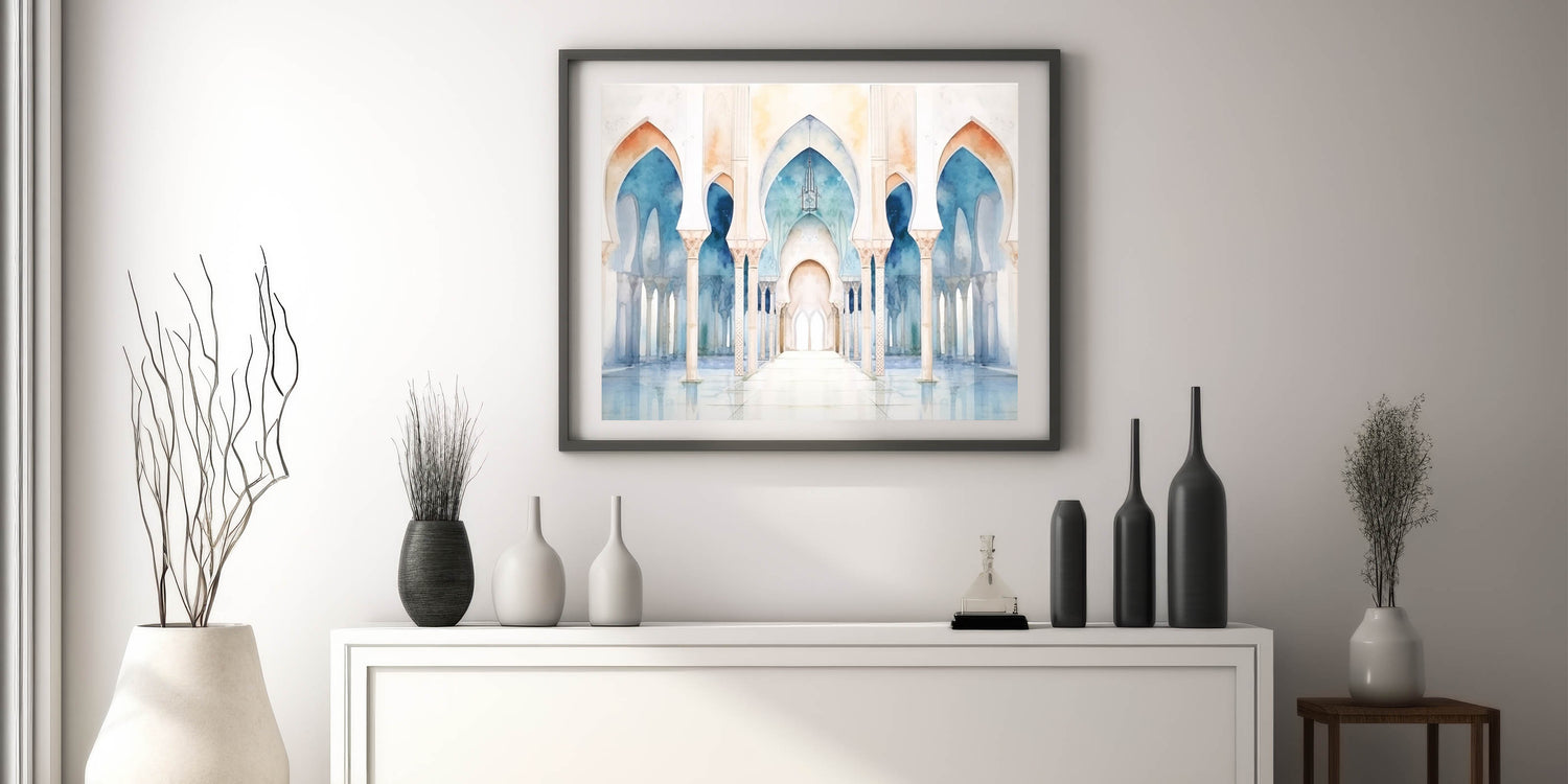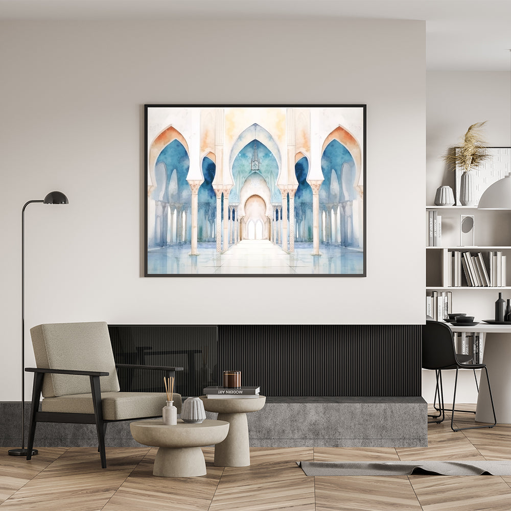 Bring tranquility and elegance into your space with this stunning watercolor wall art featuring a series of serene arches. The soft, flowing hues of blue and beige create a peaceful atmosphere, while the intricate details of the arches add a touch of architectural beauty. This piece is perfect for those who appreciate the blend of art and architecture and wish to add a calming and sophisticated element to their decor.