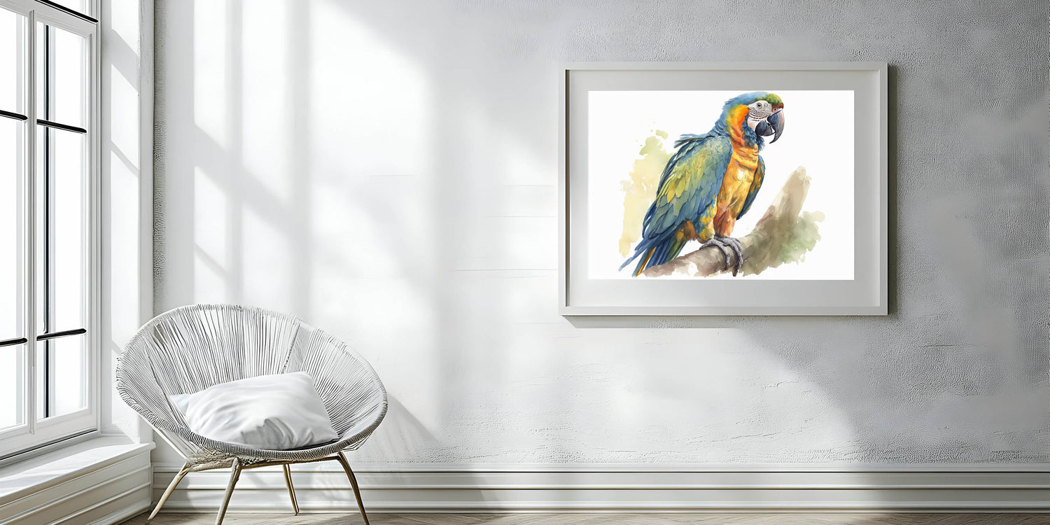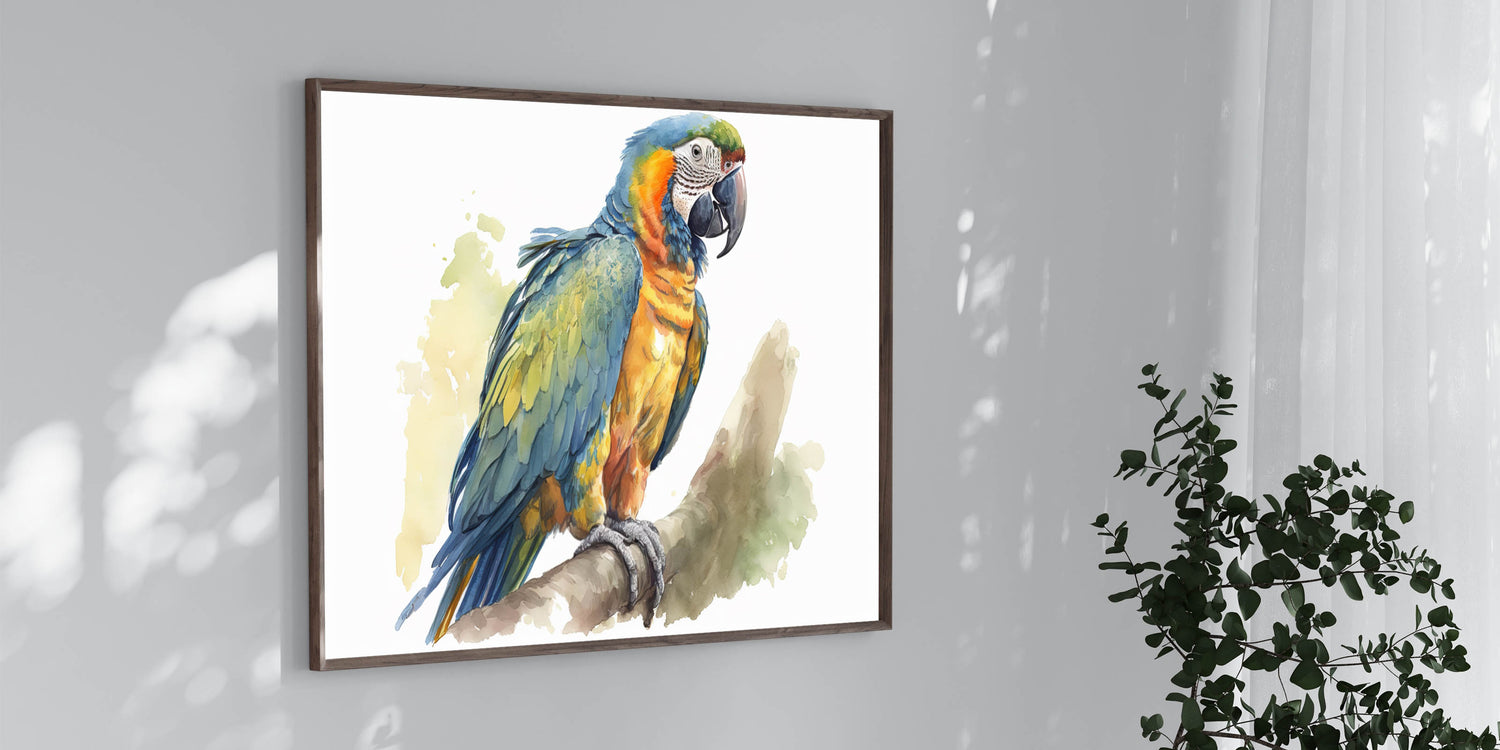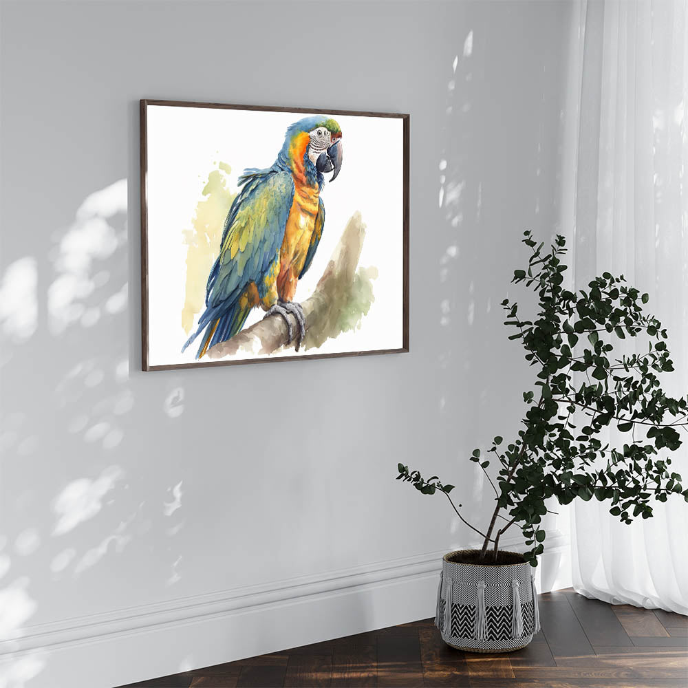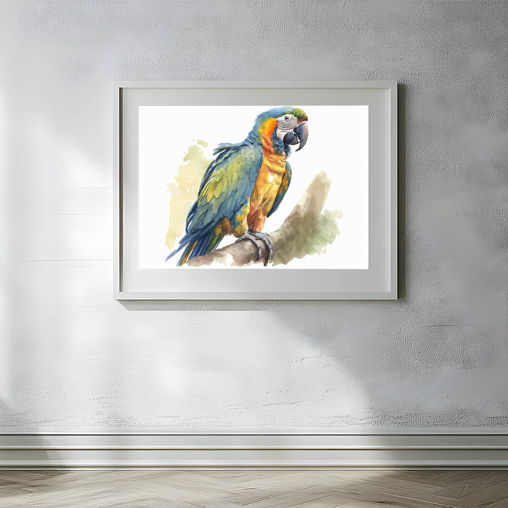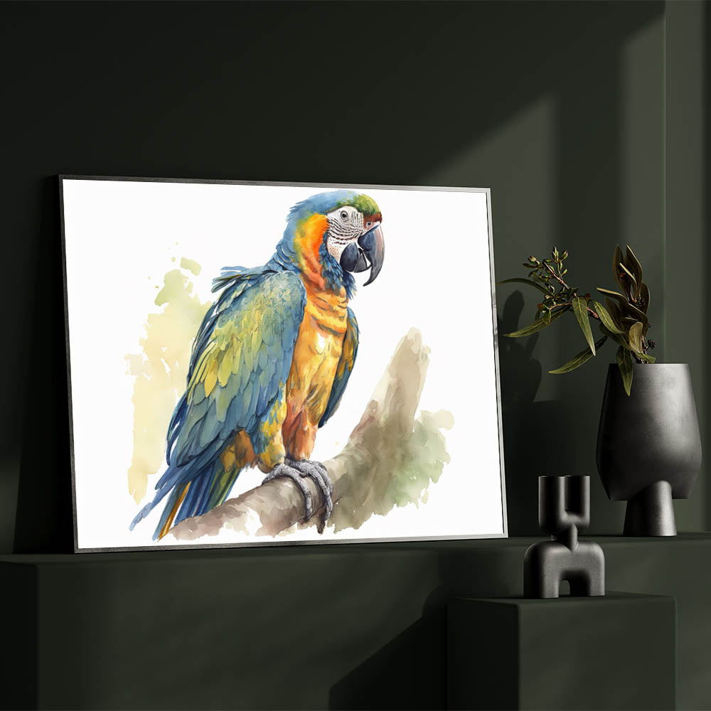 Add a touch of artistic elegance to your space with this beautiful Watercolor Parrot Wall Art. The artwork features a stunning depiction of a blue and yellow parrot perched on a branch, rendered in a soft and delicate watercolor style. The gentle blend of colors and subtle brushstrokes create a serene and calming effect, making it a perfect piece for any room that needs a touch of nature-inspired beauty.