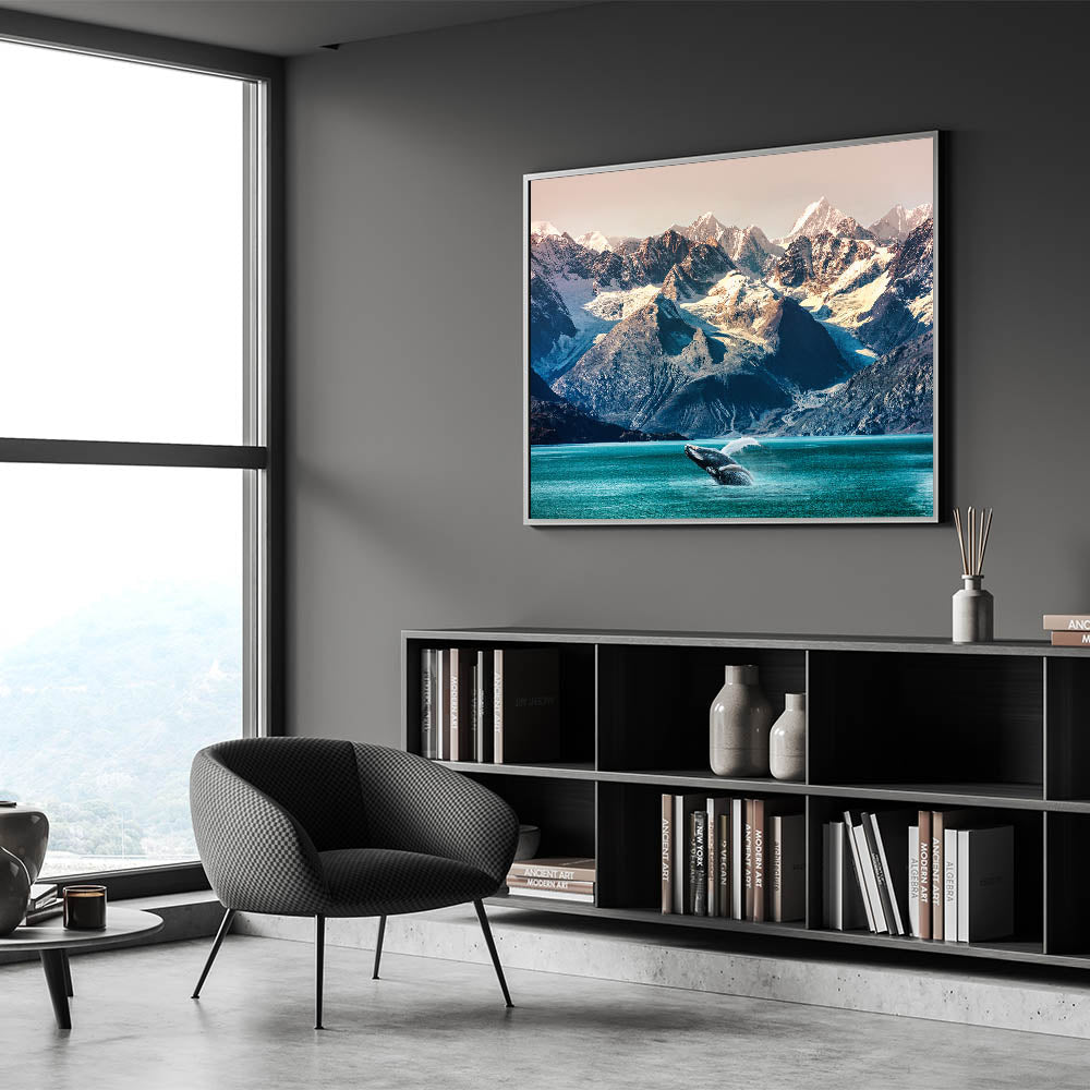 Transform your space with the awe-inspiring beauty of this mountain landscape wall art, featuring a dramatic scene of a whale breaching from turquoise waters against a backdrop of rugged, snow-capped peaks. This canvas art captures the powerful and serene essence of nature, bringing a touch of wilderness and grandeur to your home.