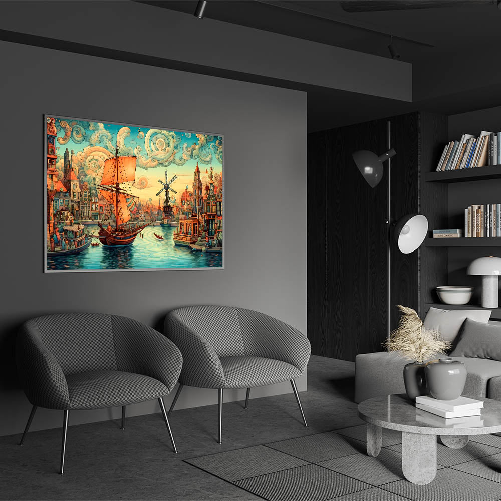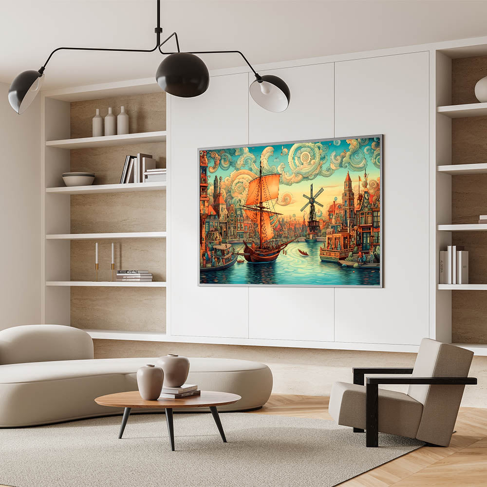 Step into a world of imagination with this Whimsical Harbor Town & Windmill canvas art. This vibrant and detailed artwork brings to life a fantastical harbor town, complete with charming houses, sailing ships, and a towering windmill. The swirling clouds and exaggerated architectural details create a dreamlike atmosphere, making this piece a perfect choice for those who appreciate art with a playful and imaginative twist.