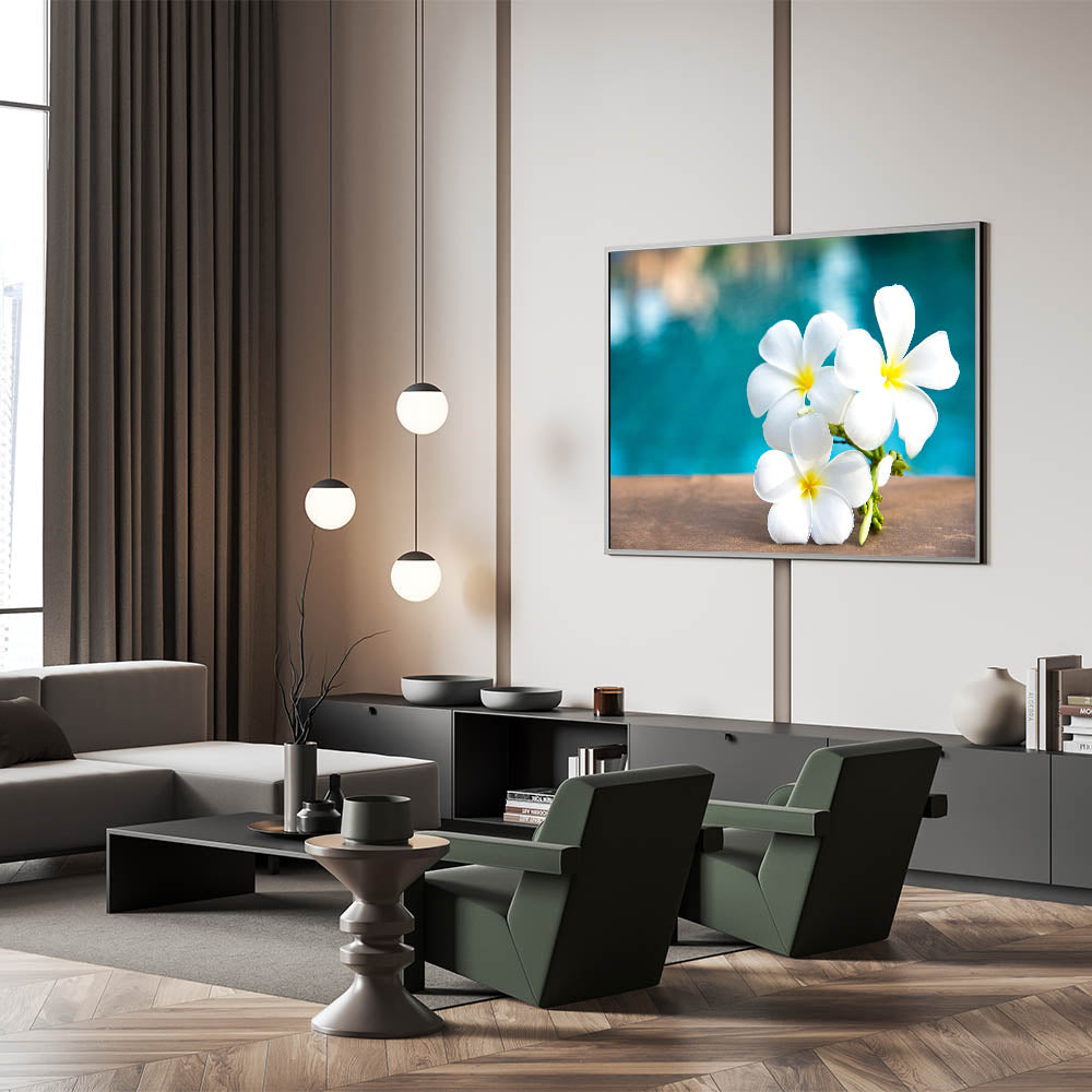 This "White Frangipani Art" is a perfect addition for anyone looking to add a touch of tropical elegance to their home or office. The soothing colors and peaceful imagery make it an ideal choice for creating a calm and relaxing atmosphere. Let this piece transport you to the tranquil shores of Bora Bora with every view.