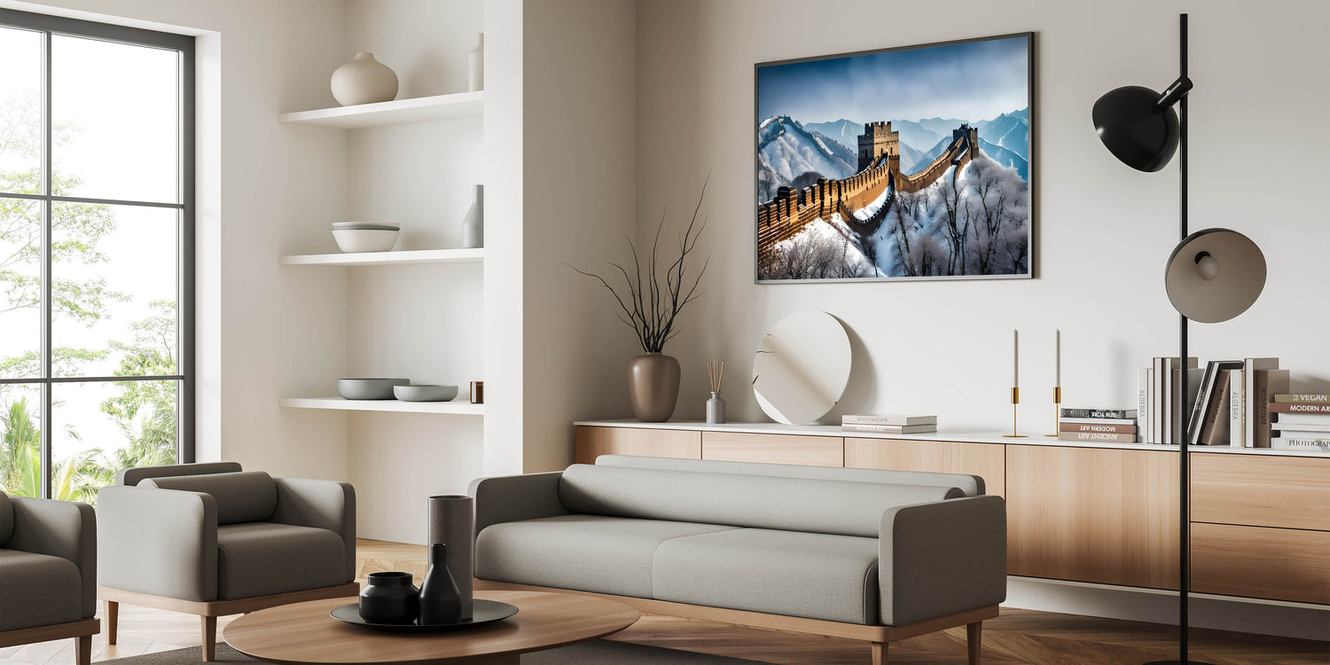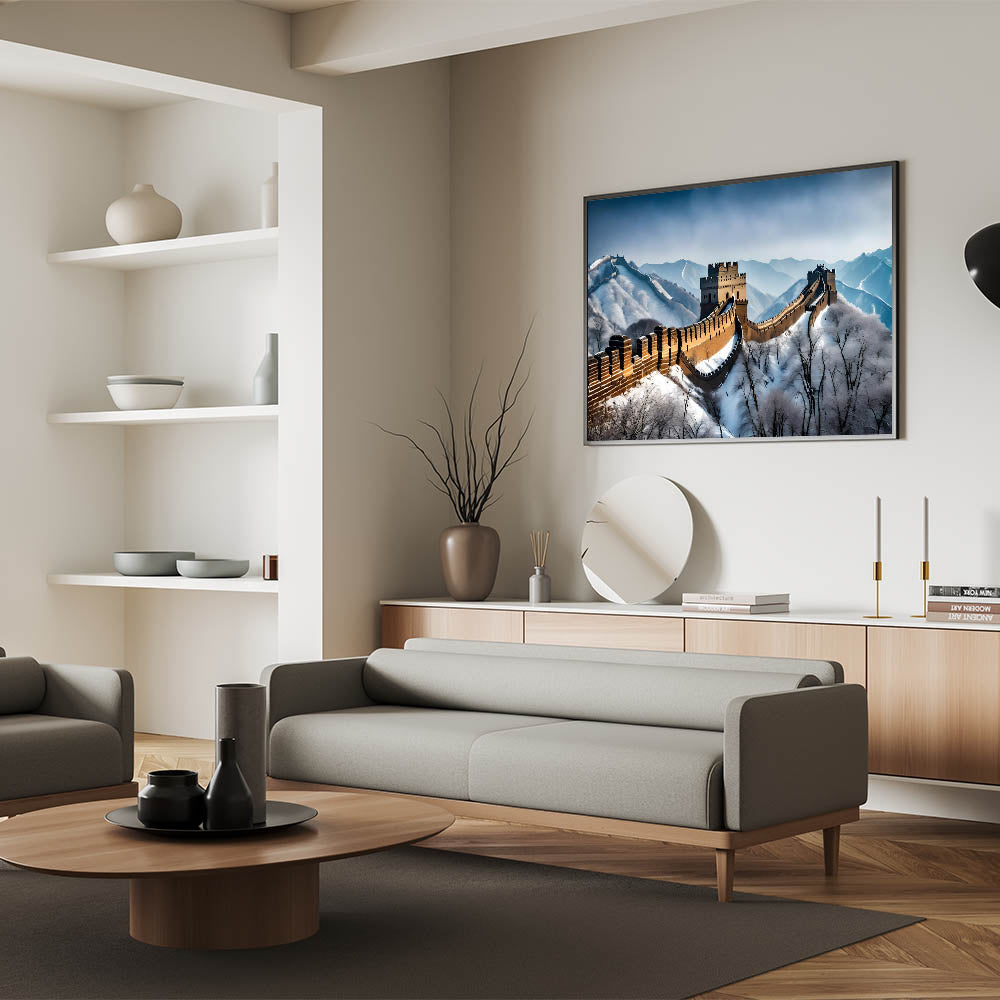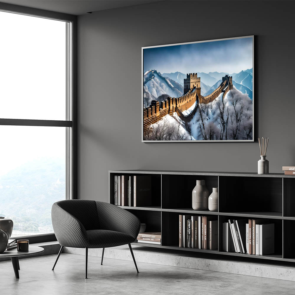 Experience the Great Wall of China in winter with this stunning canvas art, featuring snow-capped mountains and frost-covered trees. The intricate details of the Great Wall, set against a backdrop of soft white snow and majestic blue mountains, create a captivating scene. This high-quality print is perfect for adding a sense of serenity and history to any room.