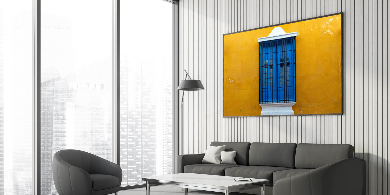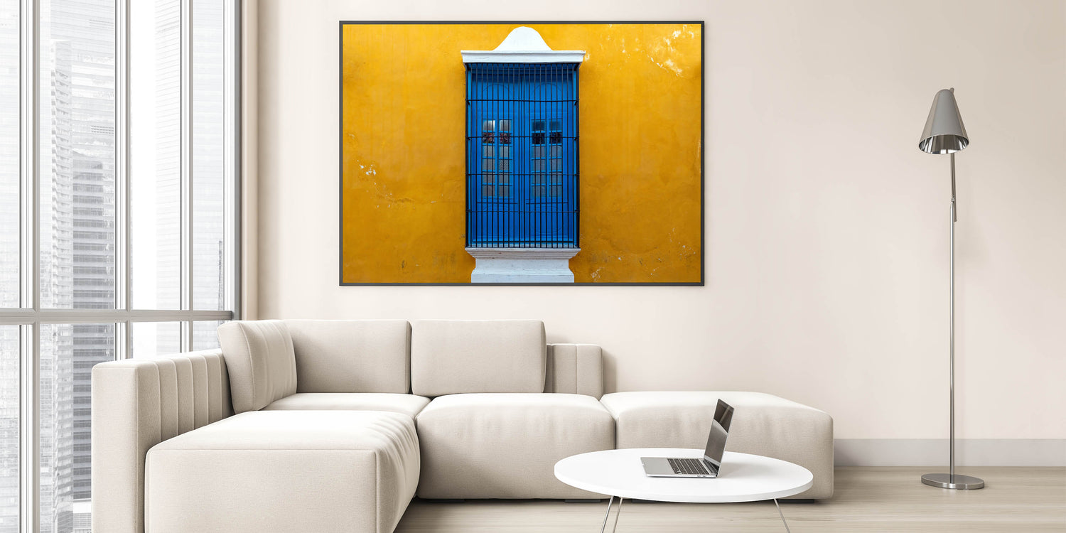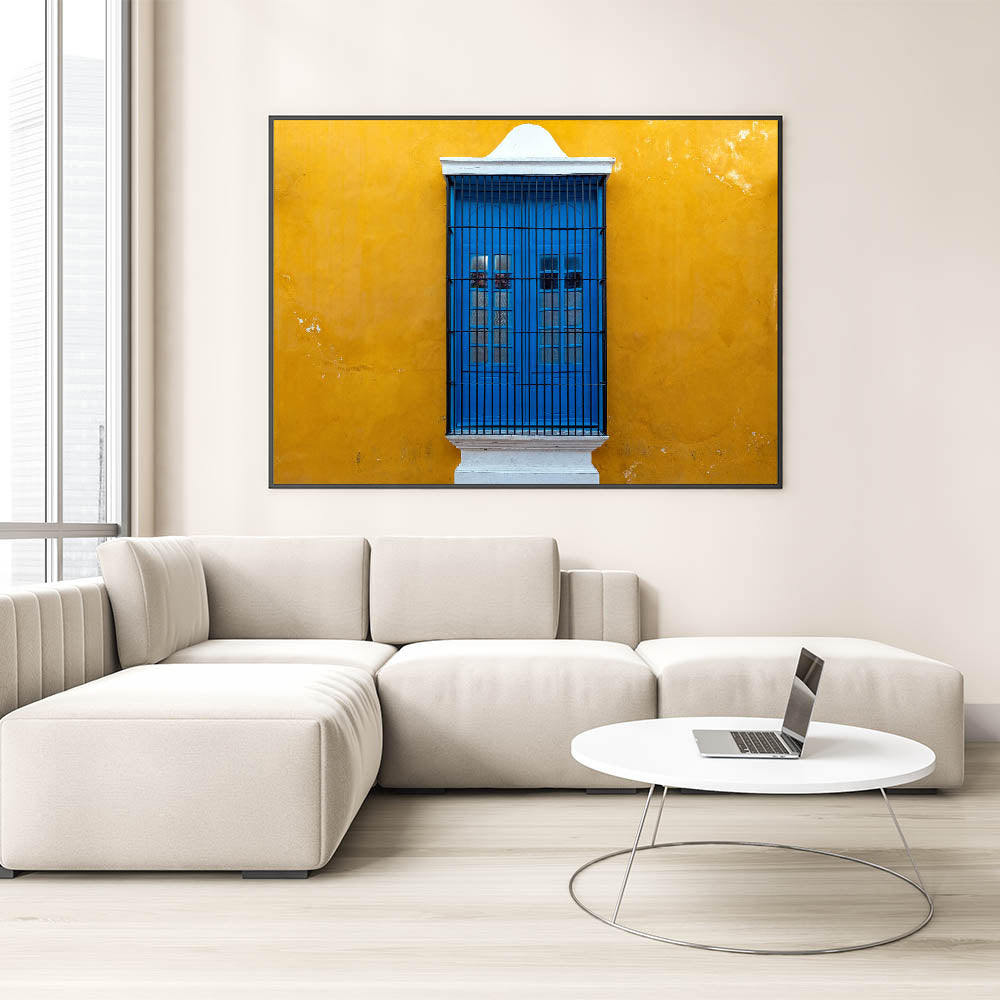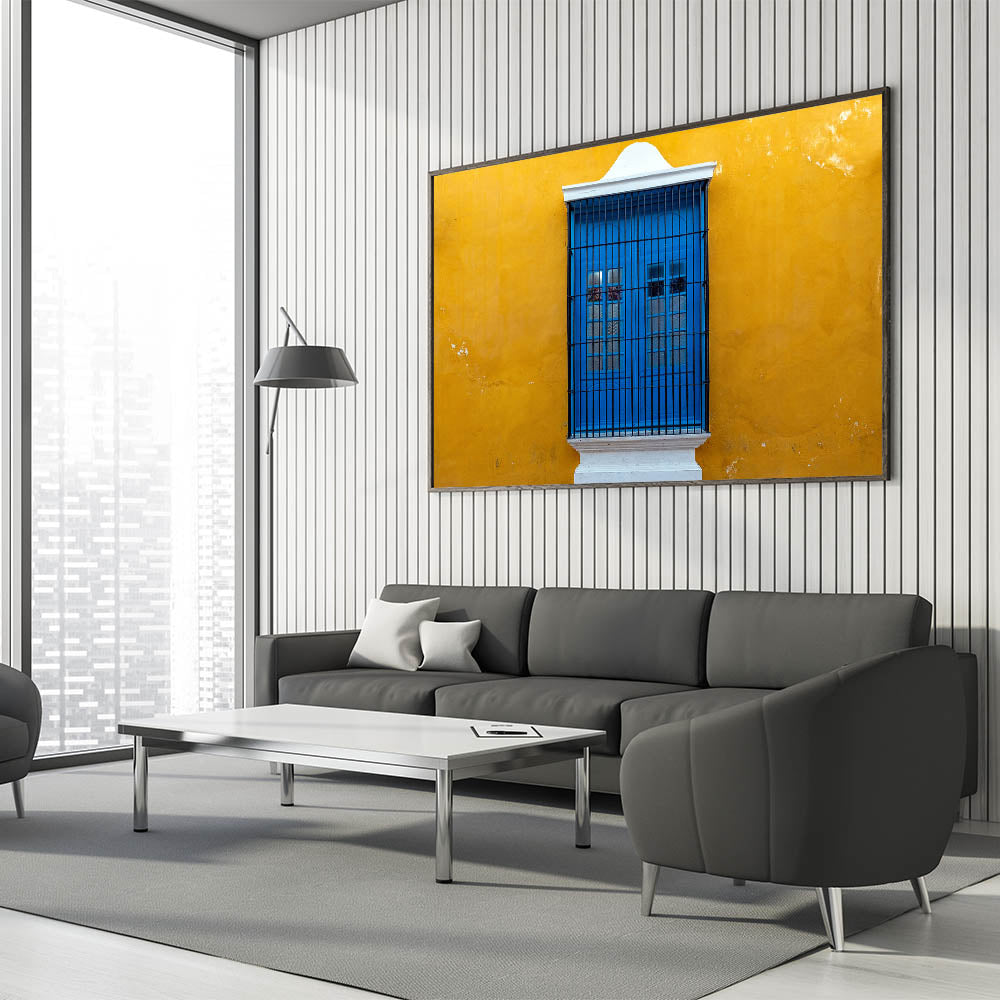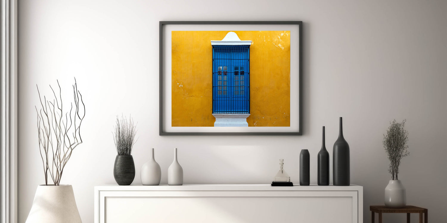 This vibrant wall art captures the essence of Yucatan’s colorful architecture with its striking combination of a bright yellow wall and a bold blue window. The clean lines and brilliant colors make this Yucatan canvas art a perfect choice for anyone looking to add a pop of Mexican cultural art to their space. The window, framed by black iron bars, adds texture and depth to the scene, highlighting the unique charm of Yucatan’s urban landscapes.