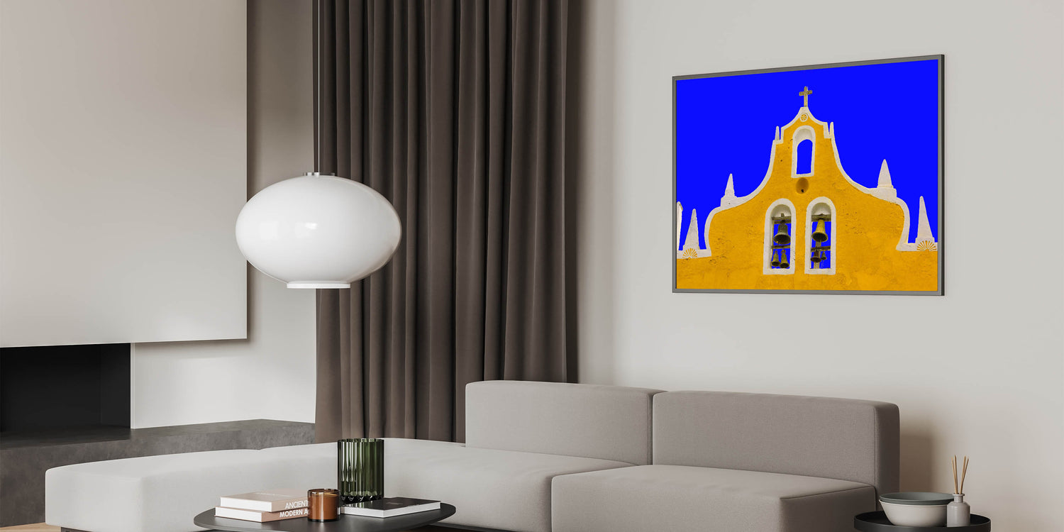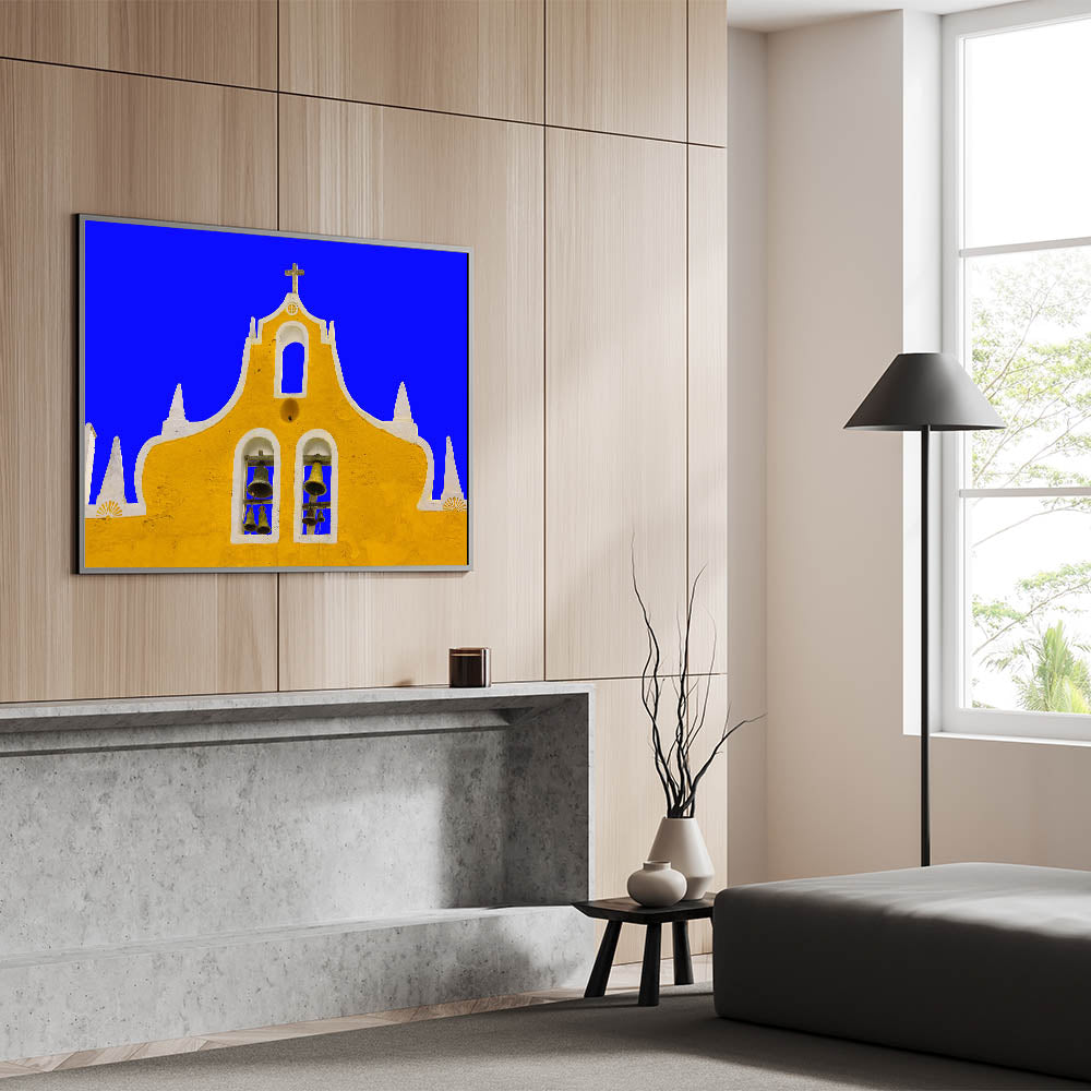 Bring the vibrant essence of Mexico's Yucatan Peninsula into your space with this stunning Yucatan Wall Art. Featuring the striking architecture of a traditional bell tower set against a bold, bright blue sky, this piece celebrates both Mexico Yucatan Prints and Mayan Ruins Art. Perfect for anyone who loves Yucatan travel photography or wants to add a touch of Mexican cultural art to their home.