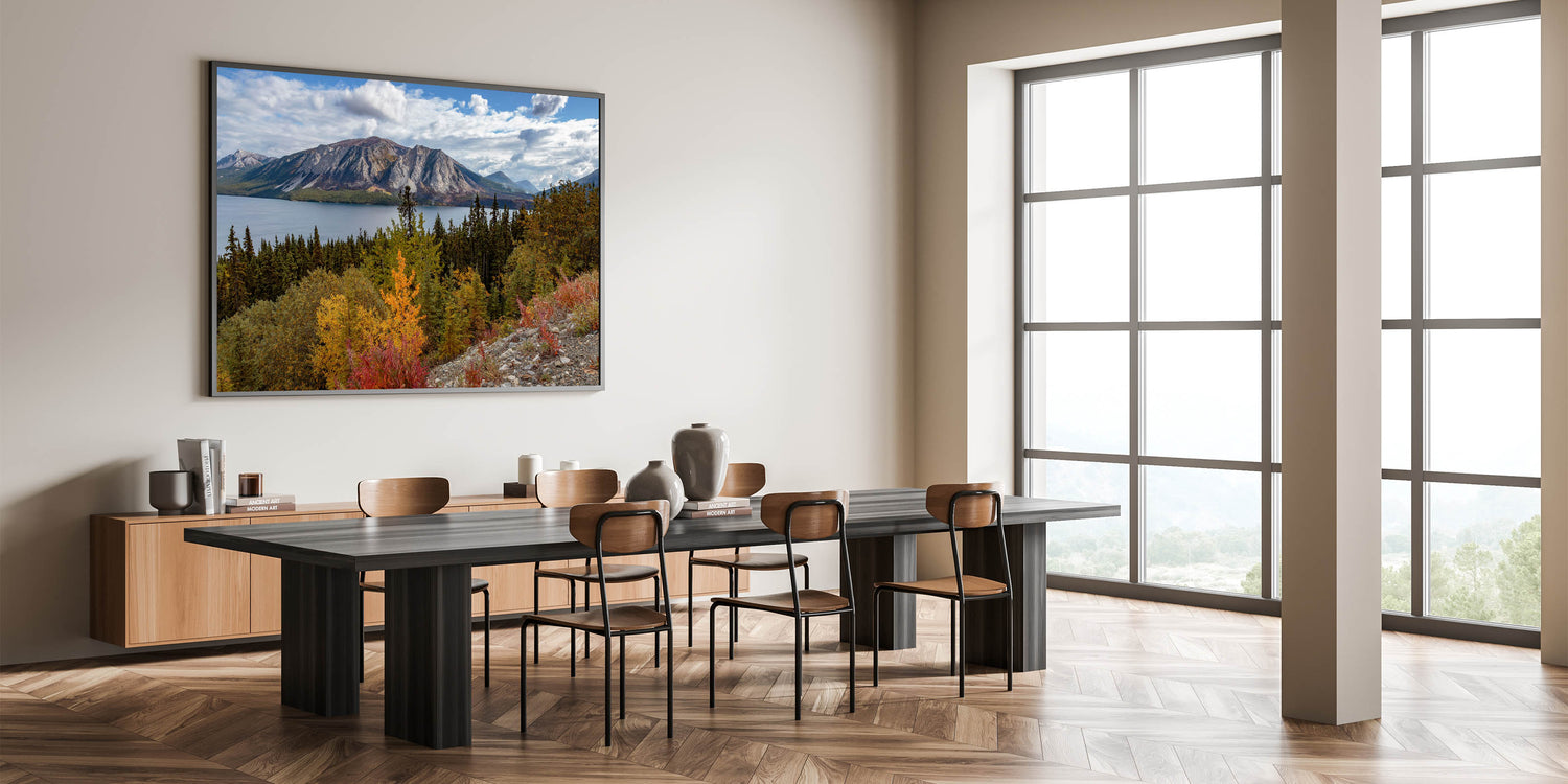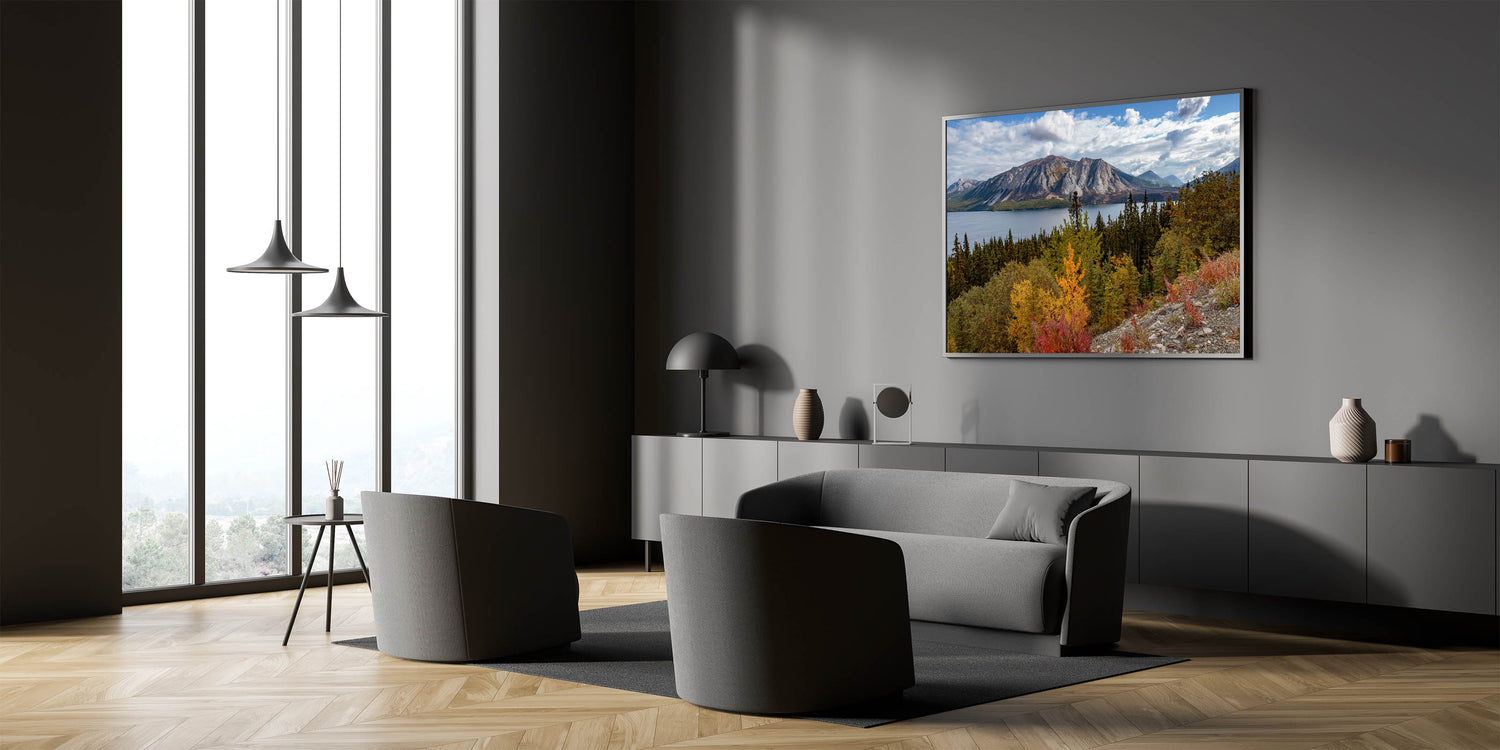 Perfect for any nature enthusiast or anyone looking to bring the tranquil yet vibrant essence of the Yukon's autumn landscape into their space.