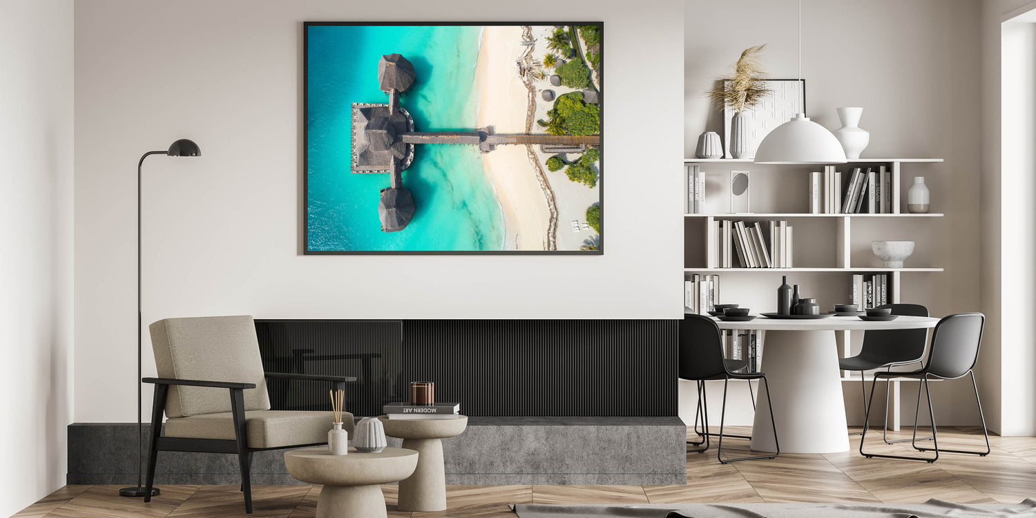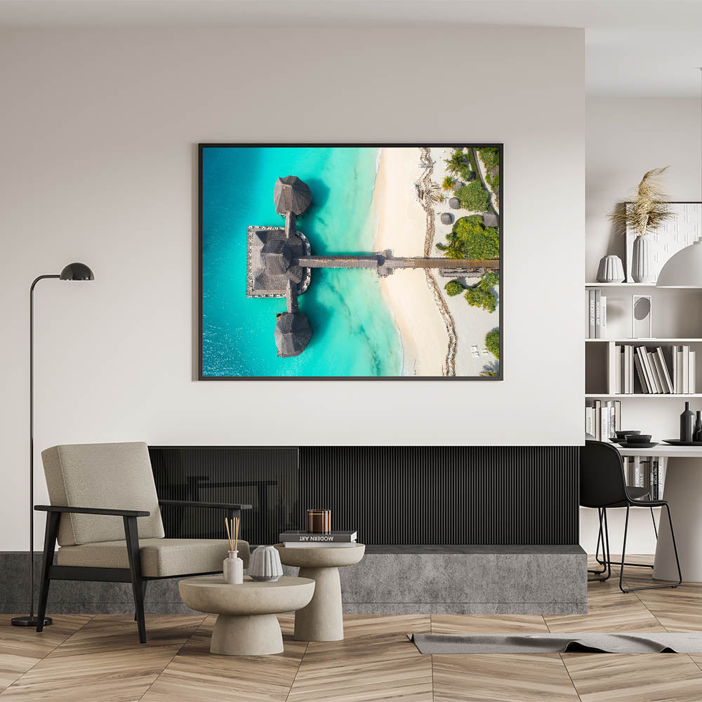 Bring the beauty of Zanzibar’s pristine beaches into your space with this stunning aerial wall art. This captivating image showcases a tranquil beach scene, where the turquoise waters of the Indian Ocean meet the soft white sand. The beautiful architecture of overwater bungalows adds a touch of luxury to this tropical paradise, making it a perfect piece for anyone who dreams of a serene getaway.