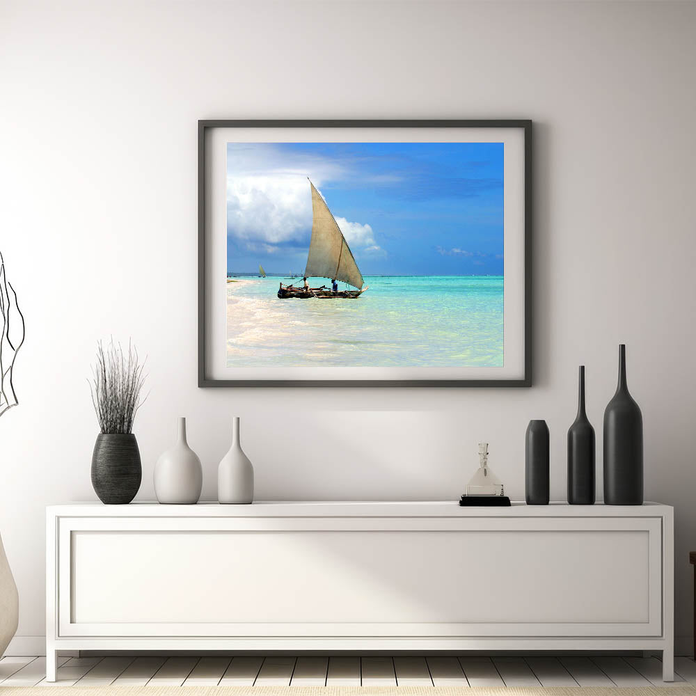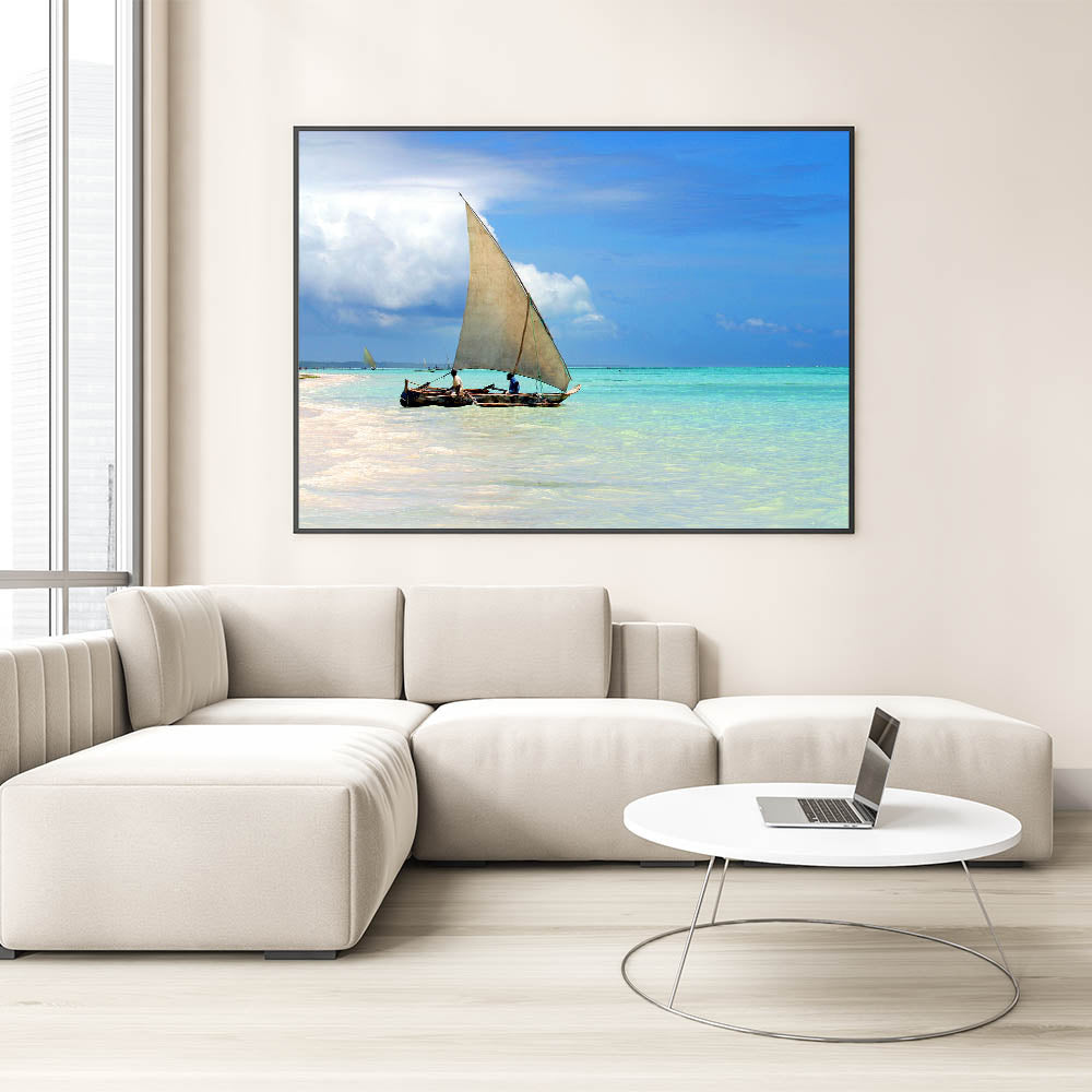 Immerse yourself in the calming beauty of Zanzibar with this stunning wall art featuring traditional sailboats floating on the turquoise waters of the Indian Ocean. Captured in the heart of Tanzania, this artwork brings a sense of peace and serenity, perfect for creating a relaxing atmosphere in any room. Whether you're a lover of coastal scenes or have a deep appreciation for African landscapes, this piece beautifully showcases the charm of Tanzania's coastline.