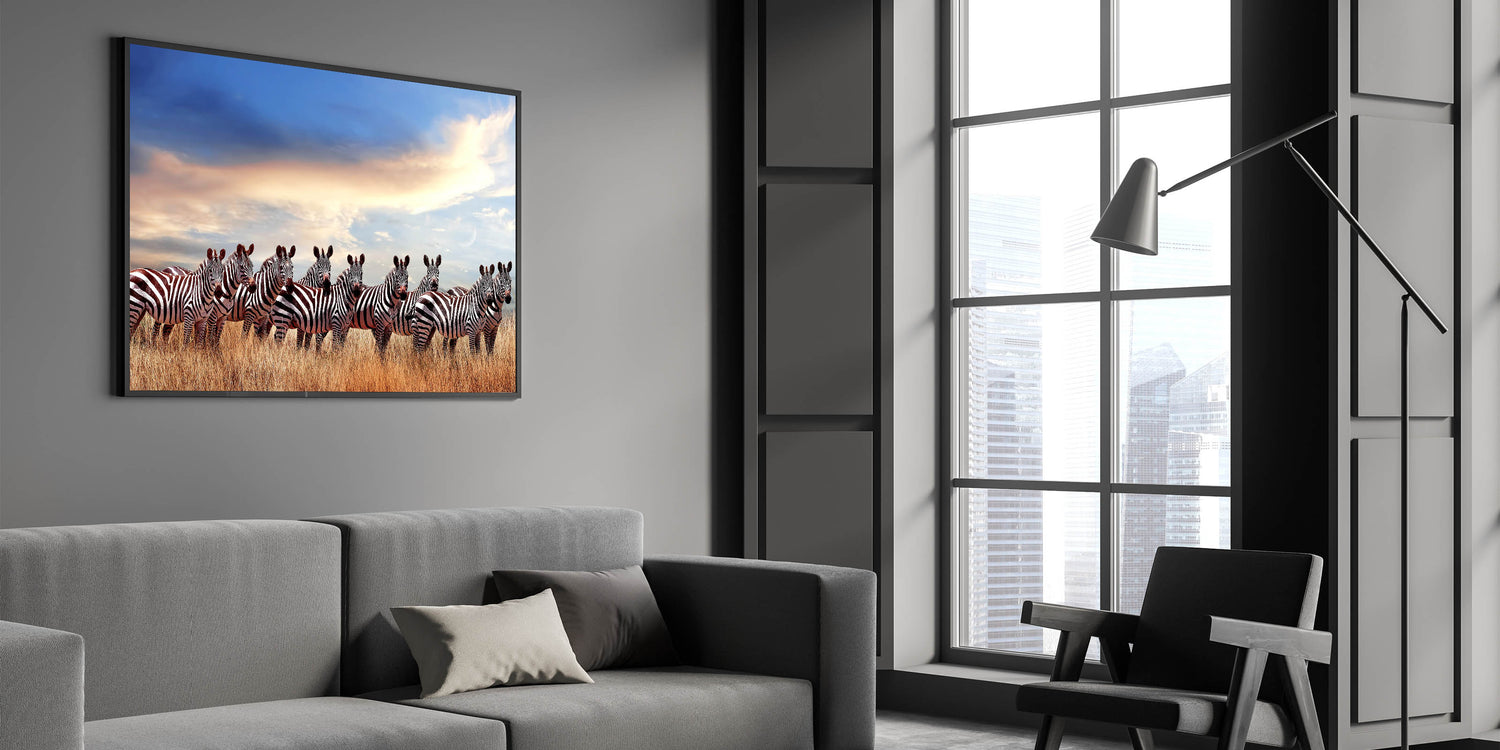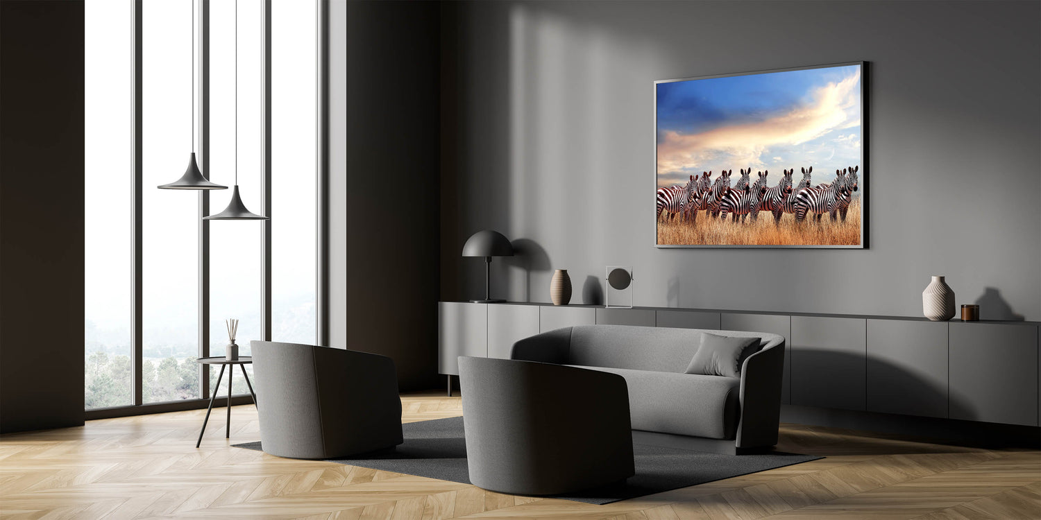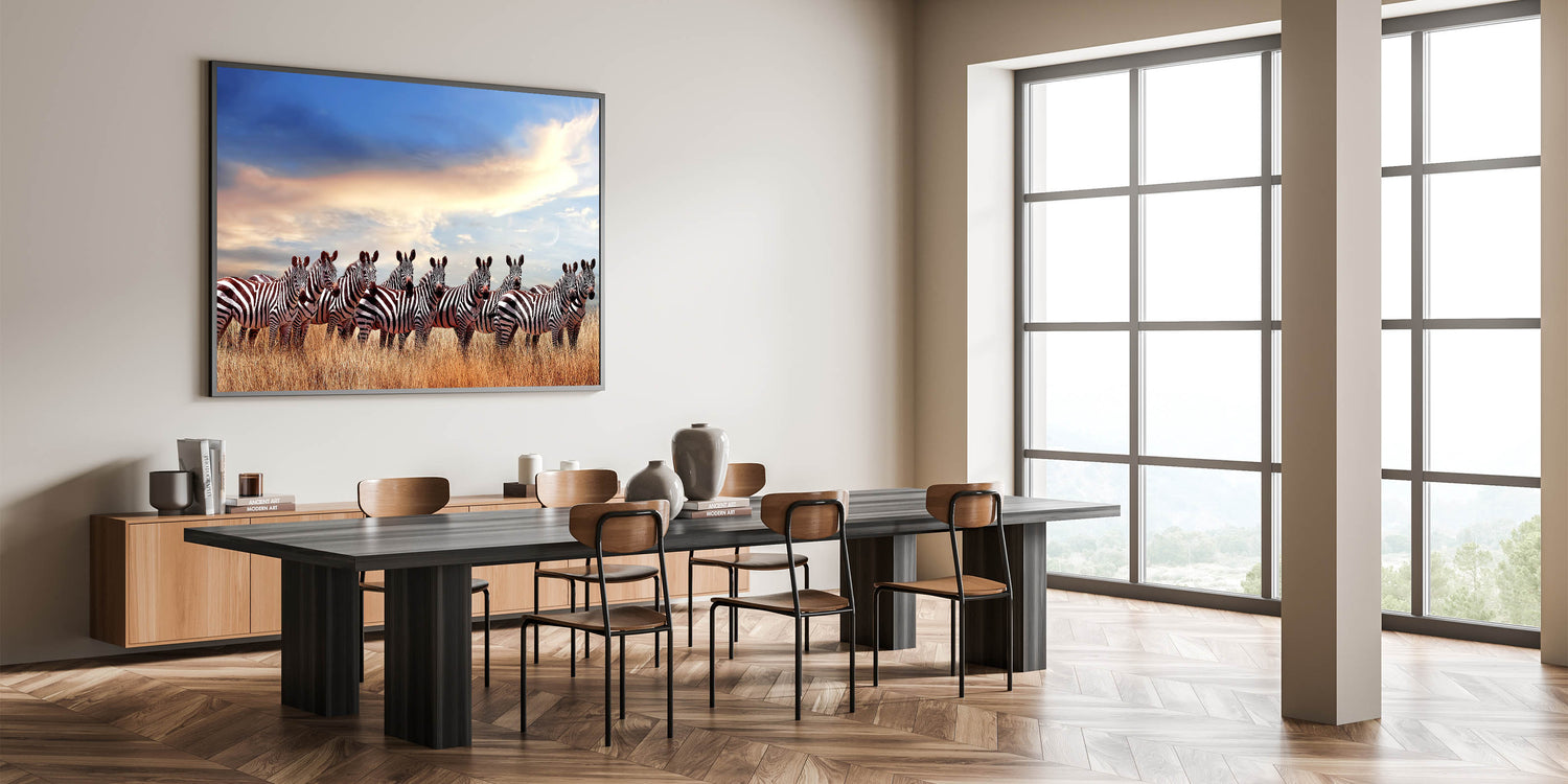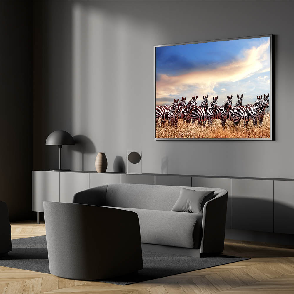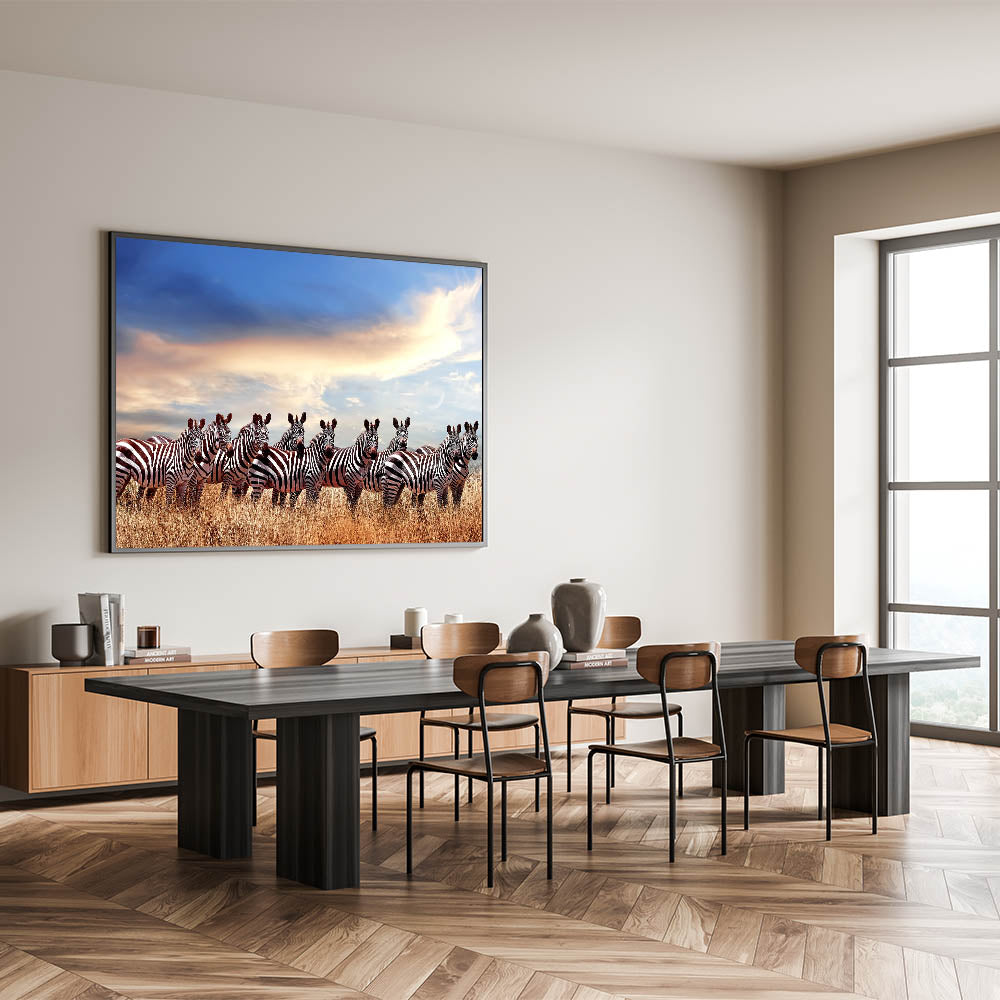 Celebrate the beauty of Tanzania’s wildlife with this captivating wall art featuring a majestic herd of zebras standing in the golden savannah under a tranquil sky. The deep contrast between the zebras' bold black-and-white stripes and the soft hues of the sky creates a visually striking image, perfect for adding a touch of nature's wonder to any space. This artwork is a testament to the harmony of nature and wildlife in the Serengeti.