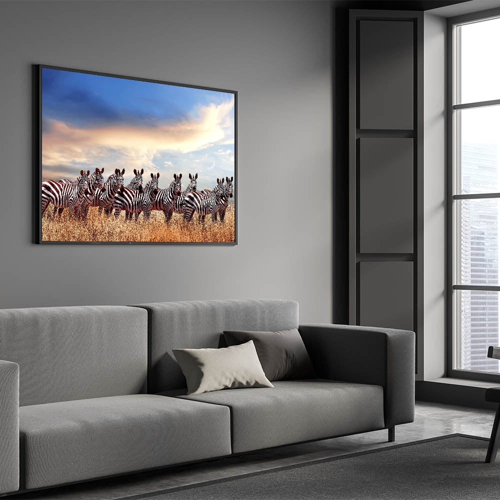This stunning zebra herd artwork is the perfect addition to any room in need of a dynamic and beautiful wildlife scene. Whether you hang it in your living room, office, or bedroom, the timeless appeal of zebras in the Serengeti will always inspire.