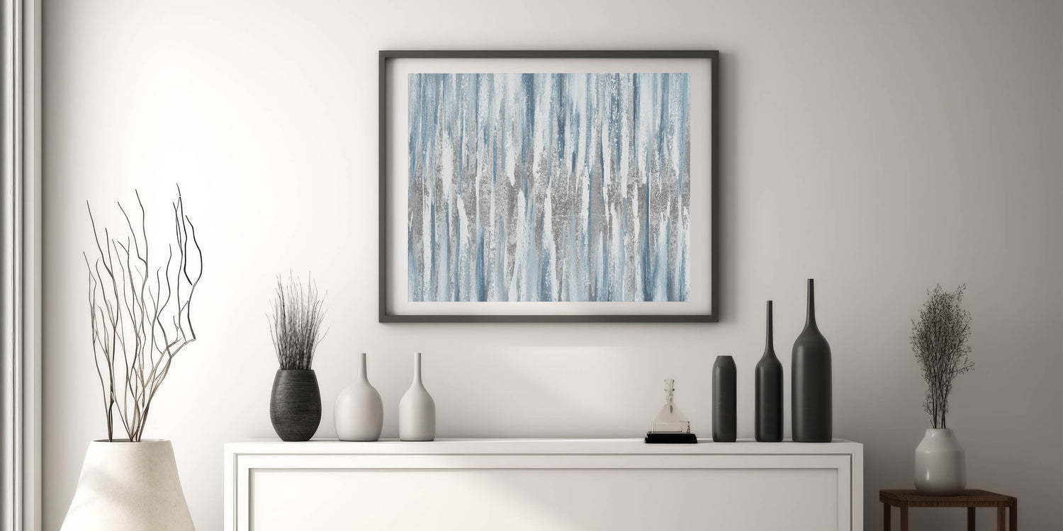 Infuse your space with tranquility and balance with this Zen garden wall art, featuring a stunning combination of blue, white, and gray tones. The vertical brushstrokes create a cascading waterfall effect, evoking a sense of calming landscape and peaceful serenity. This contemporary serene landscape artwork is an ideal choice for modern and minimalist interiors, adding a refreshing touch to your home or office.