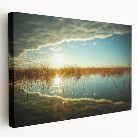 • Wide canvas print of a serene Estonian landscape in muted green and blue tones, suitable for kitchen wall art.
