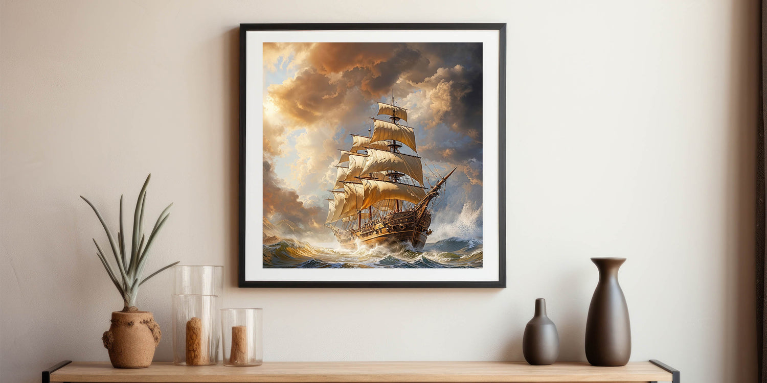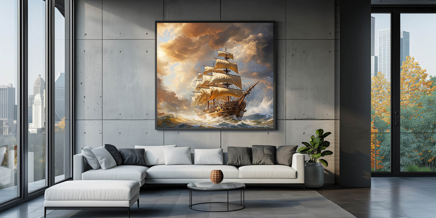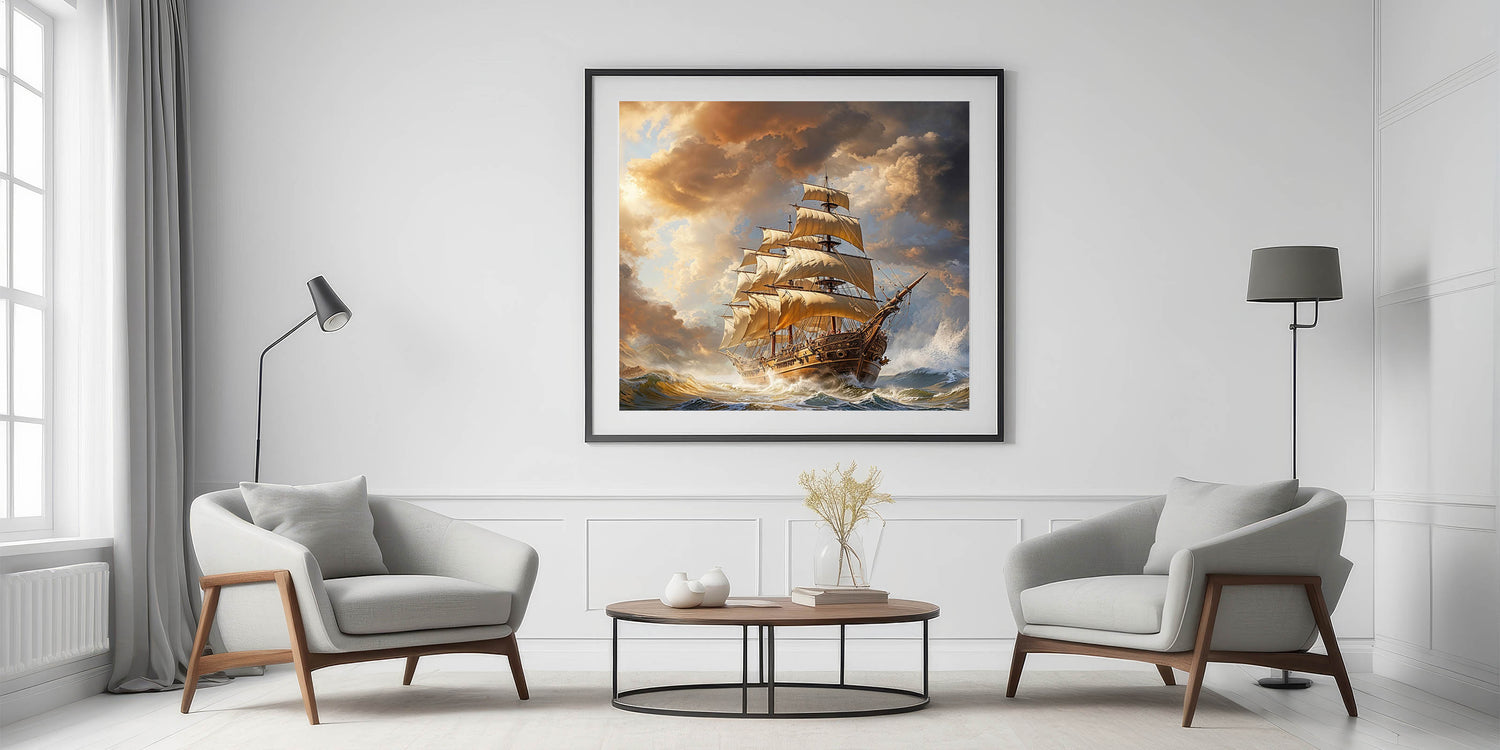 - Exceptional Detail: Available in stretched canvas, acrylic glass, and framed prints, this artwork showcases incredible detail from the ship's intricate rigging to the churning sea.