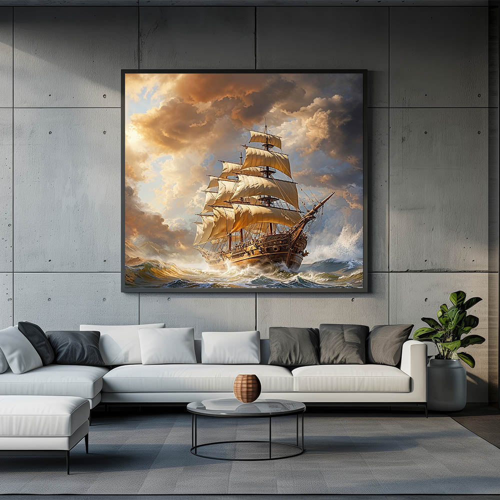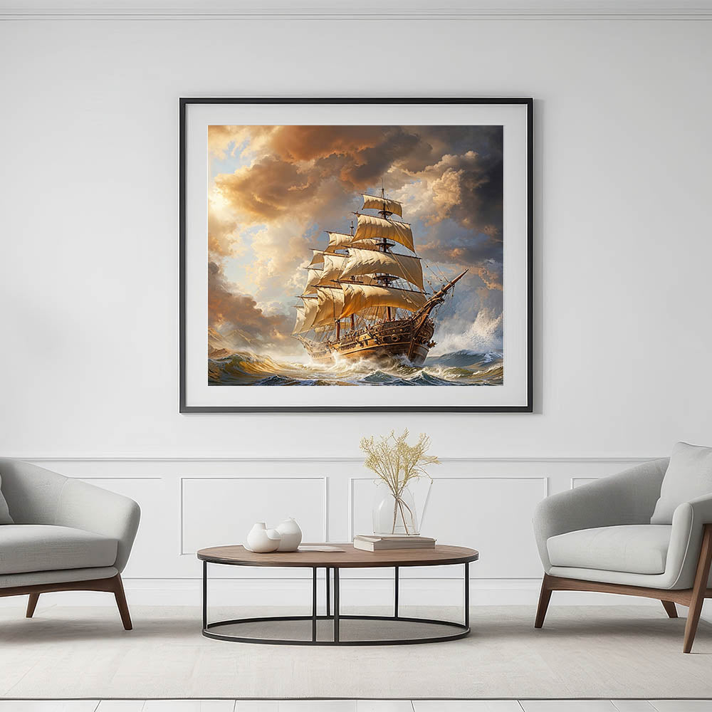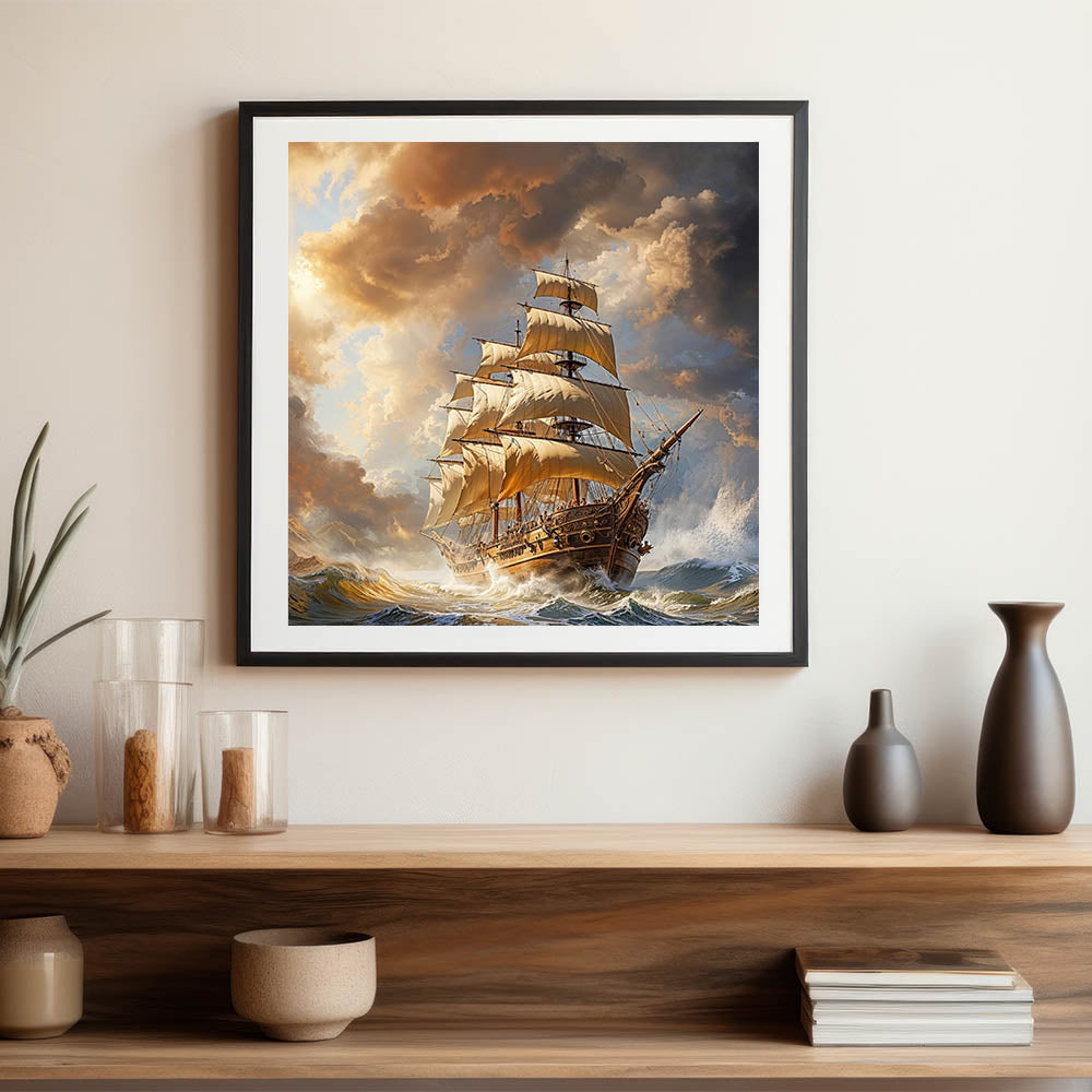 Experience the raw power and majesty of the sea with our "Epic Tall Ship in Storm" wall art. This breathtaking piece captures a historic sailing ship bravely navigating through tumultuous waves and stormy skies, perfectly embodying the spirit of adventure and resilience. The dramatic interplay of light and dark clouds, coupled with the golden glow breaking through, creates a visually stunning contrast that will command attention in any space.