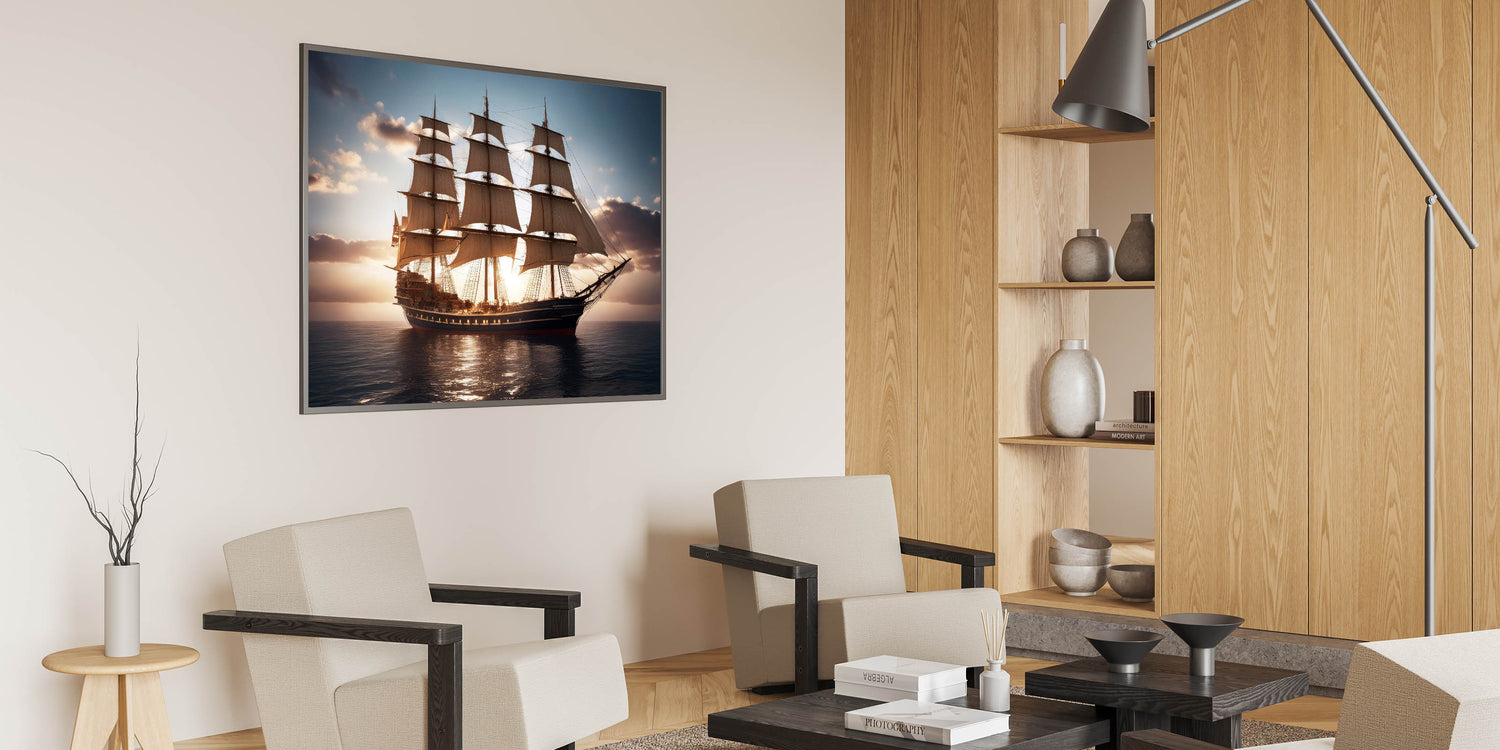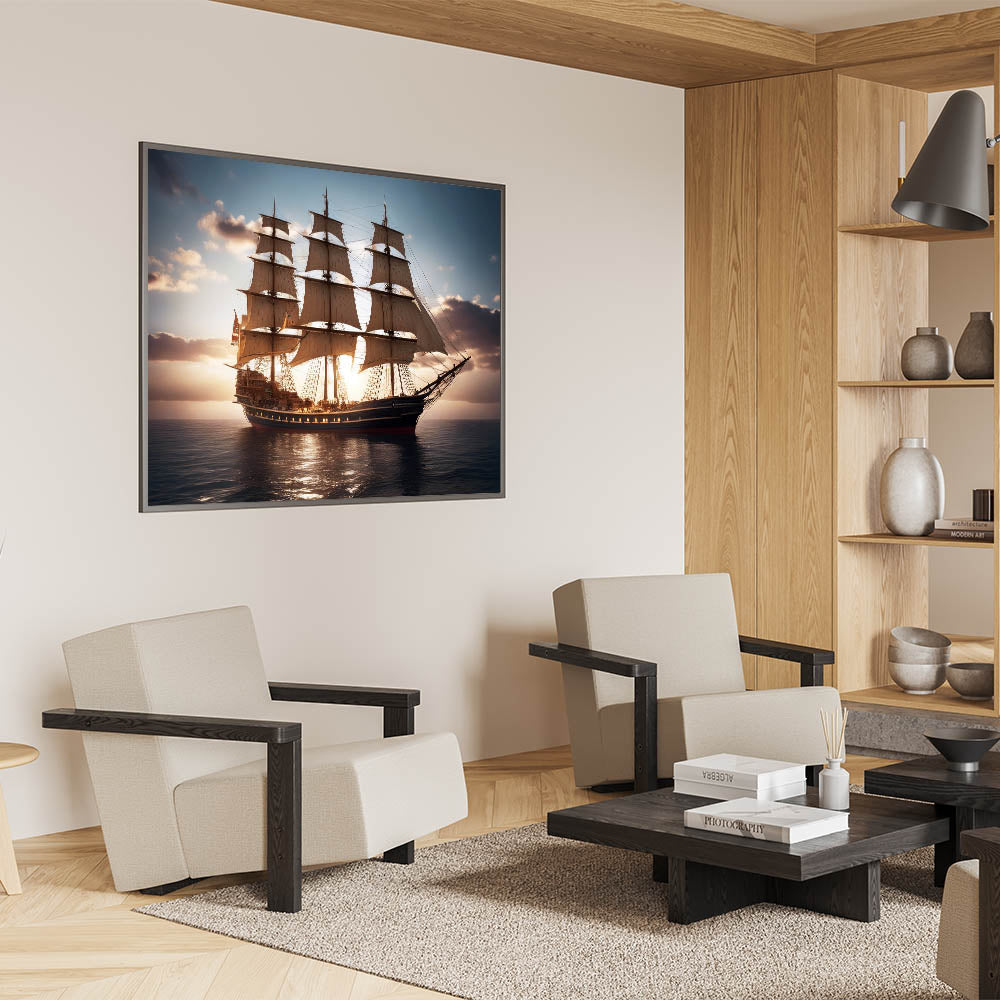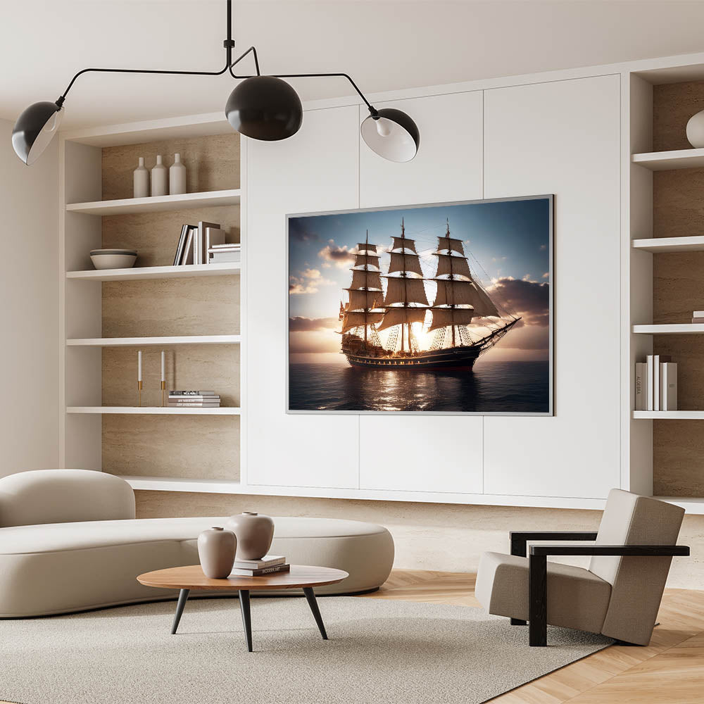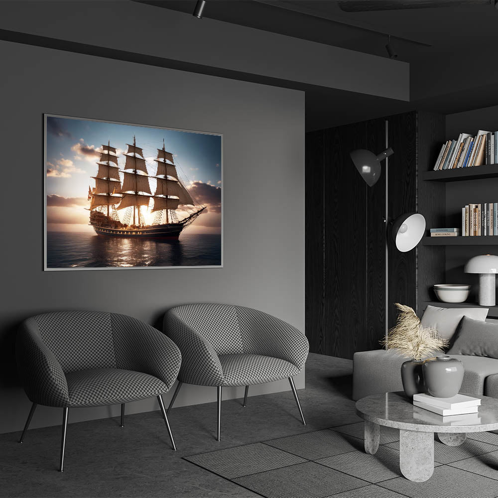 Celebrate the grandeur of historic sailing vessels with the "Glorious Voyage" wall art. This stunning piece captures a magnificent tall ship as it sails across calm waters, illuminated by the soft glow of the setting sun. The detailed rigging, expansive sails, and the serene ocean setting evoke a sense of adventure and timeless elegance, making this artwork a perfect addition to any space that honors maritime history.