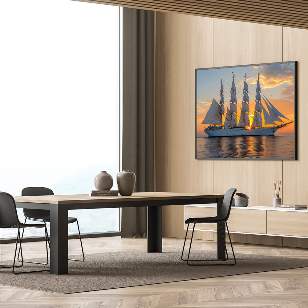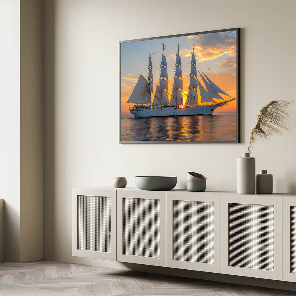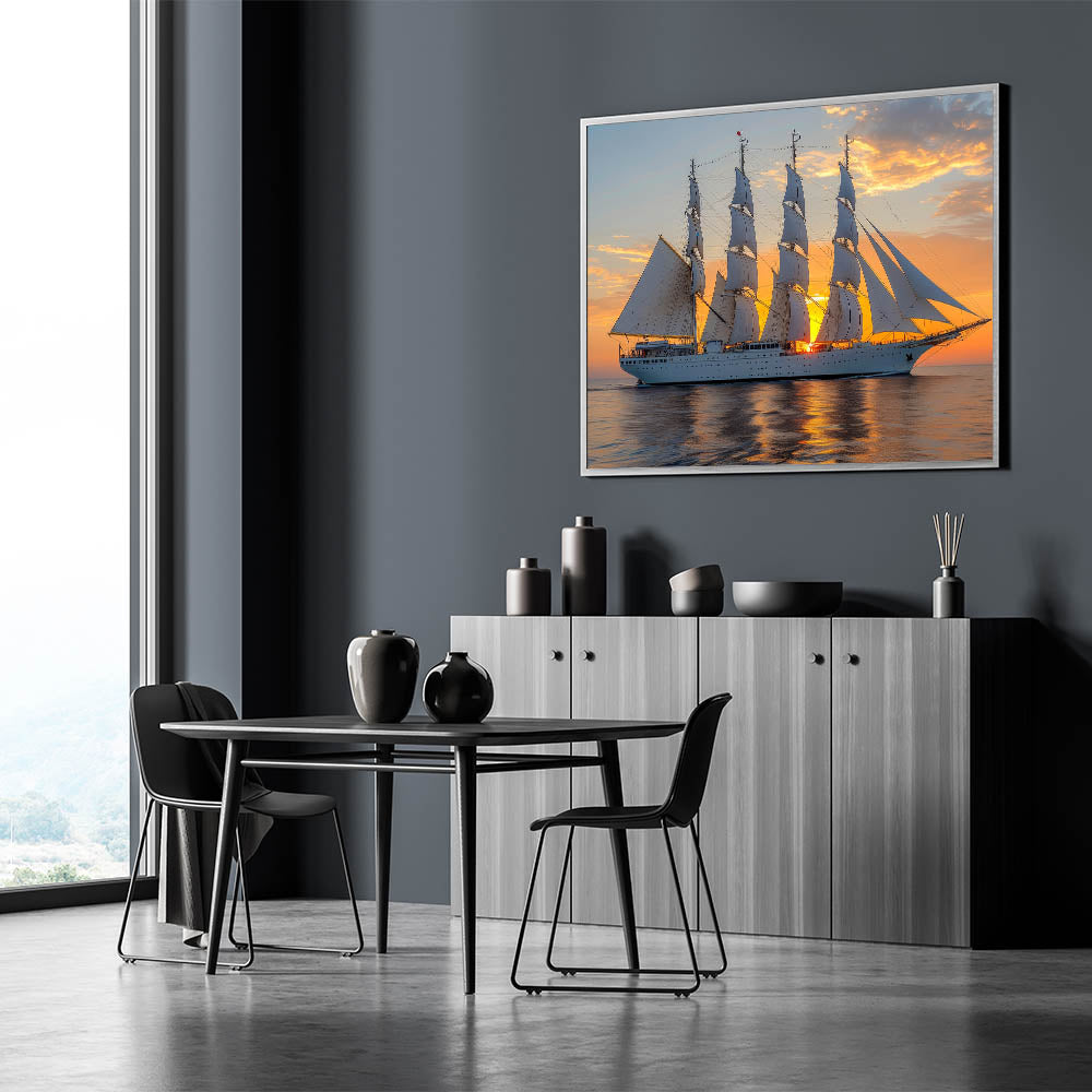 Set sail into the golden horizon with the "Golden Horizon Sail" wall art. This stunning piece captures the majestic beauty of a grand sailboat bathed in the warm glow of a sunset. The intricate details of the sails and the reflection of the golden light on the water create a scene that is both serene and awe-inspiring, making this artwork a perfect centerpiece for any room that seeks to capture the elegance of nautical life.