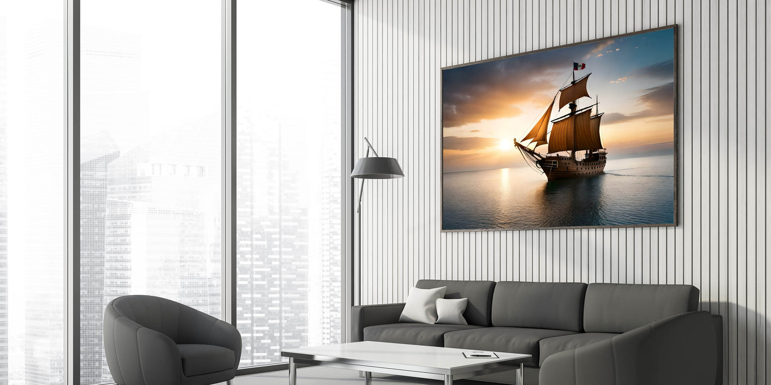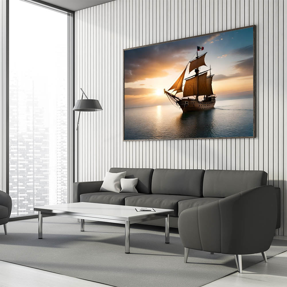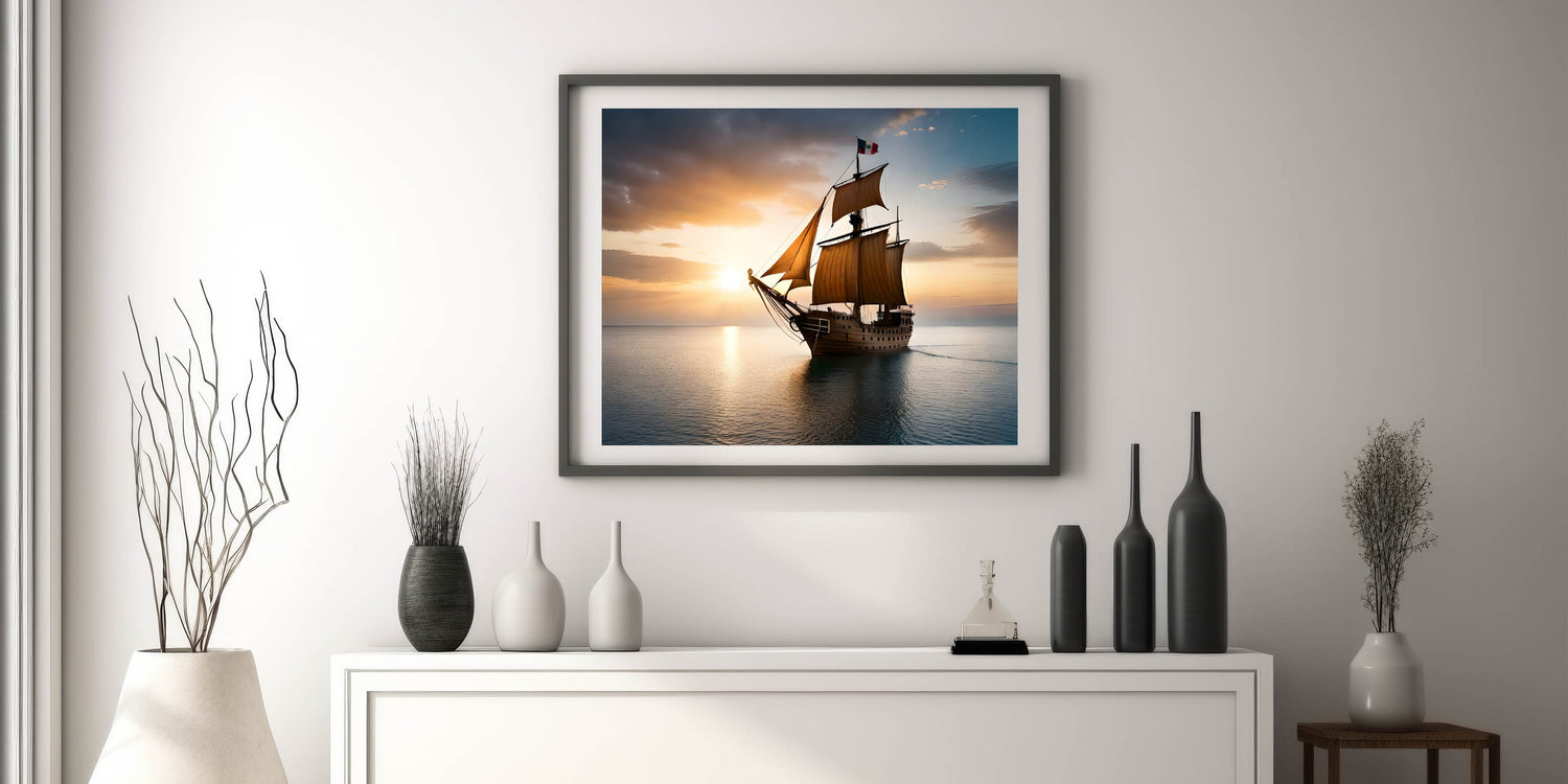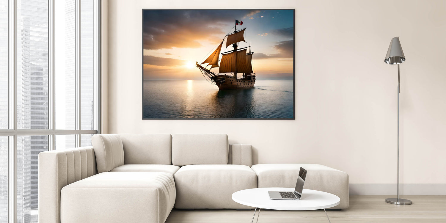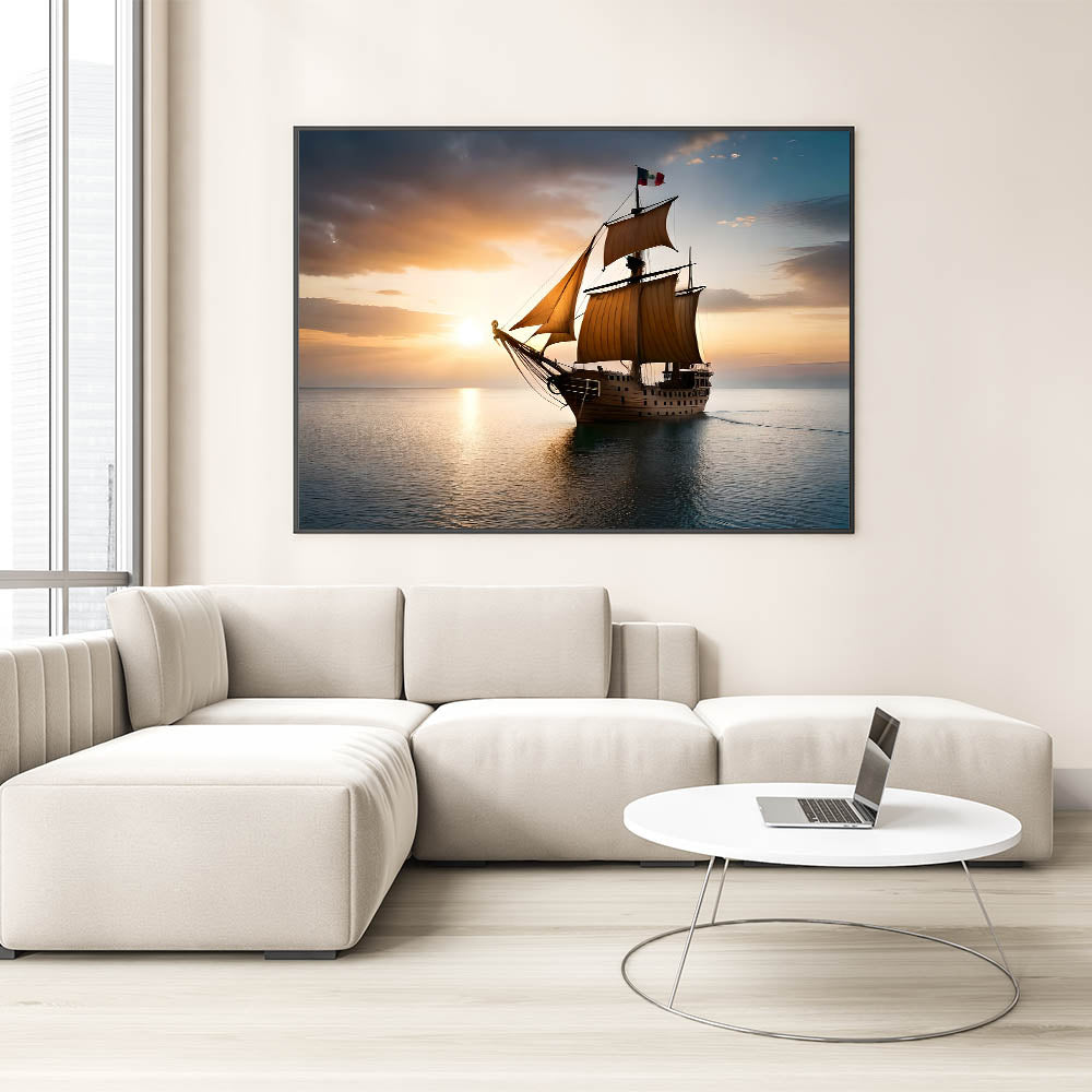 Sail into the beauty of a golden sunset with this exquisite wall art featuring a majestic ship with glowing sails catching the last light of day. The warm tones of the sunset beautifully complement the golden sails, creating a harmonious and tranquil scene that exudes elegance and serenity. This artwork captures the romance and adventure of maritime life, making it a perfect centerpiece for any room that seeks to embrace the timeless allure of the sea. Available in various formats, including stretched canvas, framed canvas, and acrylic glass, this piece adds a touch of coastal sophistication to any decor.
