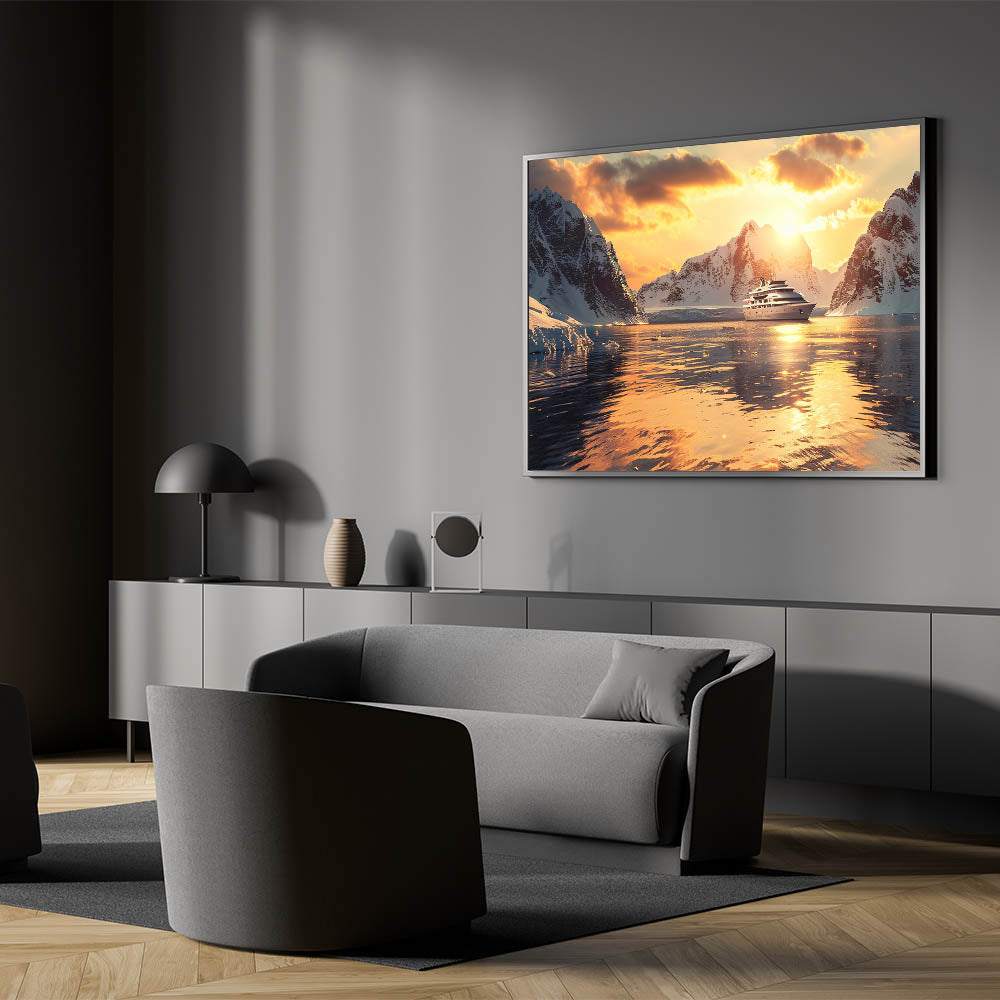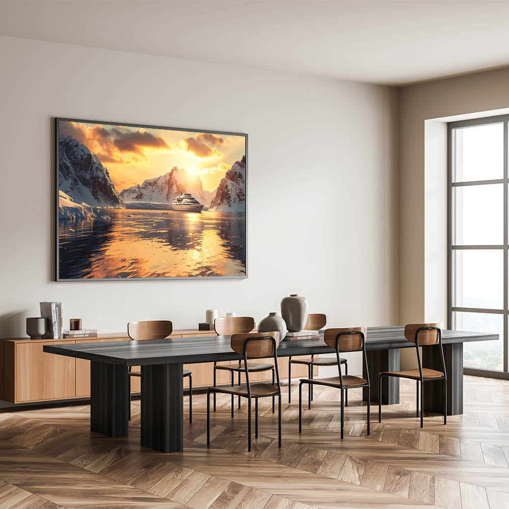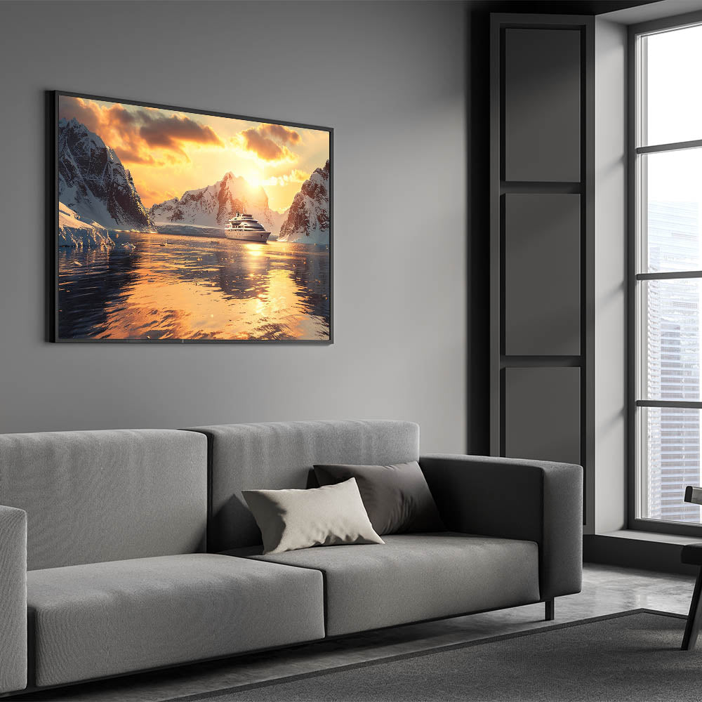 Immerse yourself in the beauty of the ocean with this stunning nautical wall art featuring a luxurious ship sailing into a serene sunset, surrounded by majestic icy mountains. Perfect for ocean lovers, this maritime art print captures the elegance of a ship against a golden horizon, making it an exquisite addition to any home or office decor. The warm hues and detailed composition bring a sense of adventure and tranquility to your space.