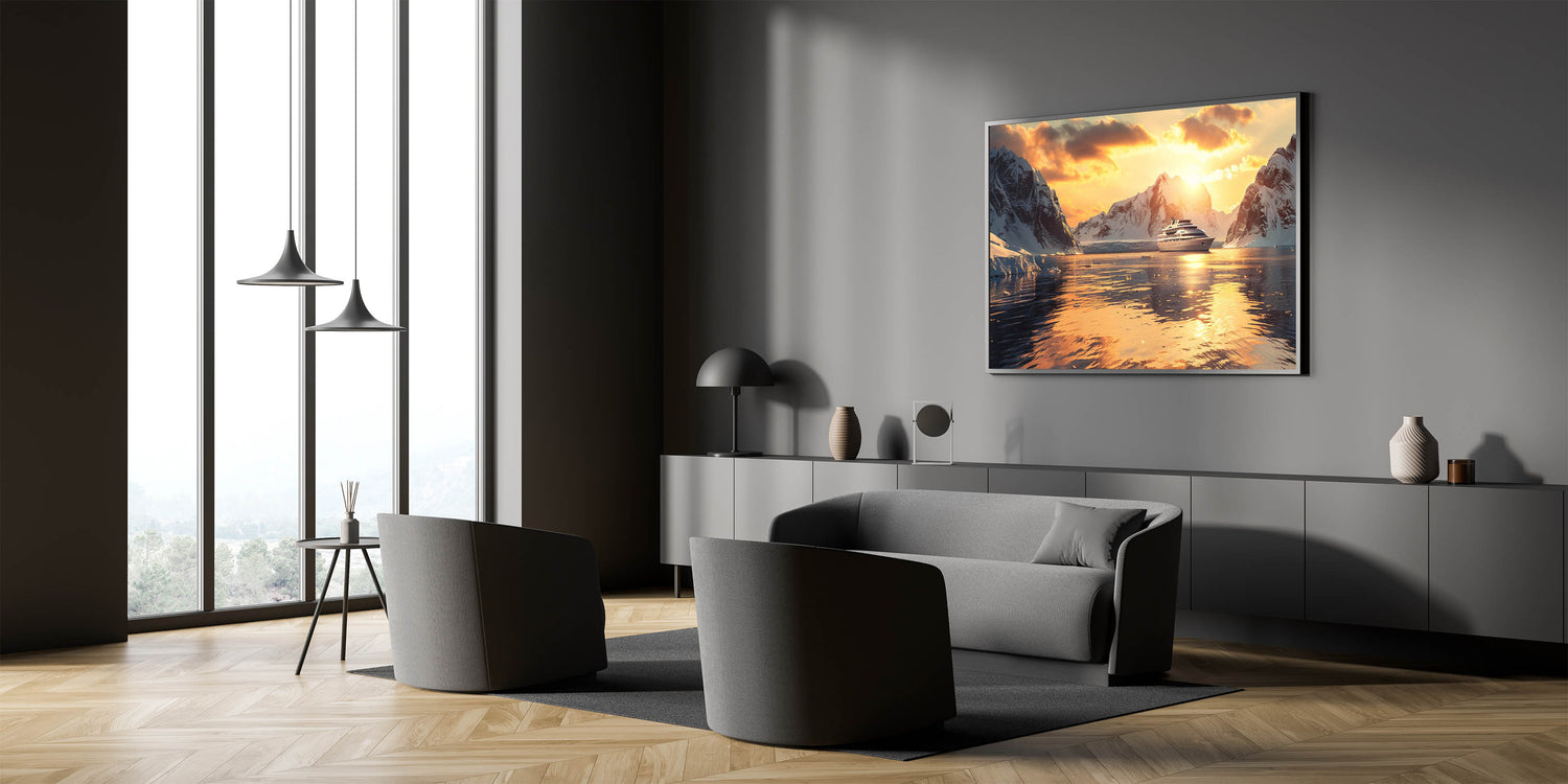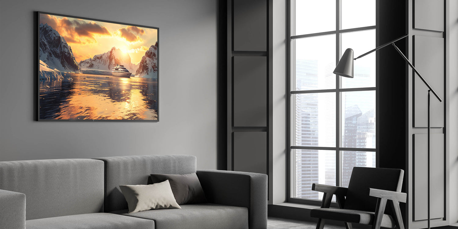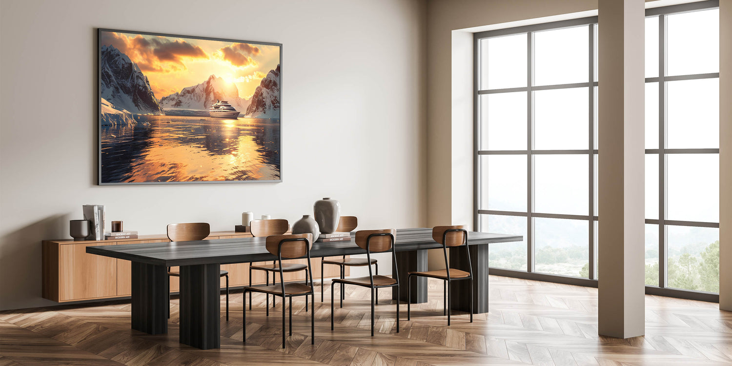 Immerse yourself in the beauty of the ocean with this stunning nautical wall art featuring a luxurious ship sailing into a serene sunset, surrounded by majestic icy mountains. Perfect for ocean lovers, this maritime art print captures the elegance of a ship against a golden horizon, making it an exquisite addition to any home or office decor. The warm hues and detailed composition bring a sense of adventure and tranquility to your space.