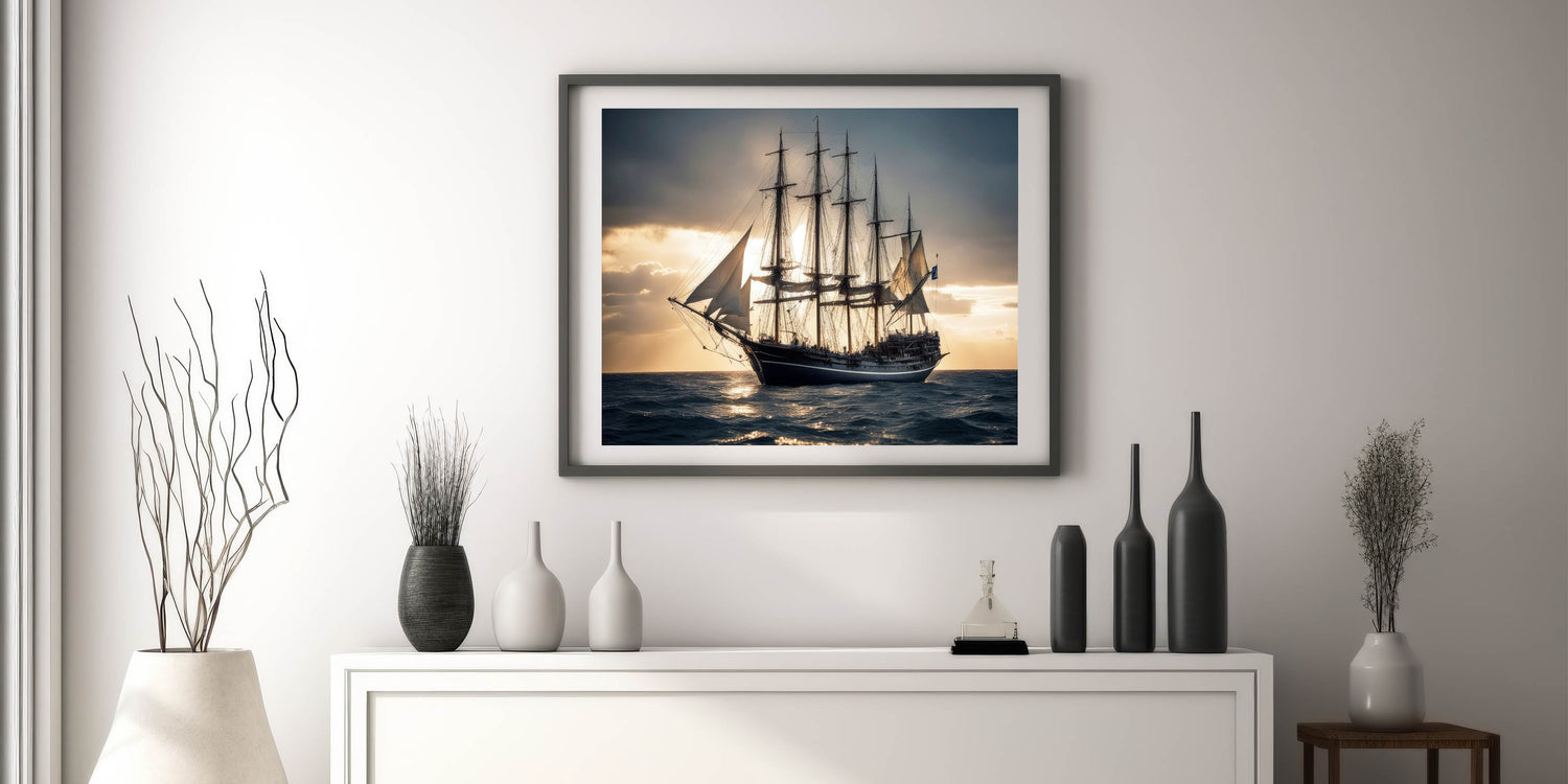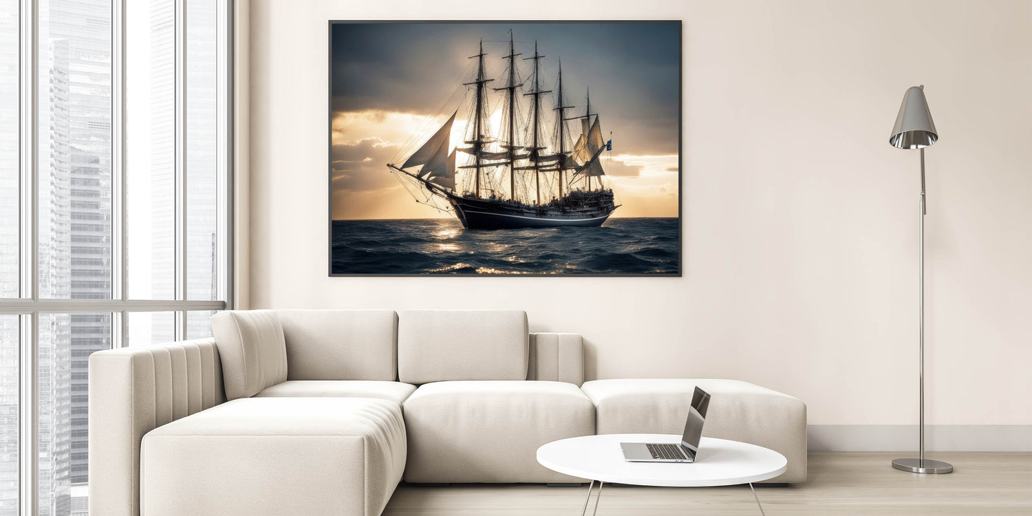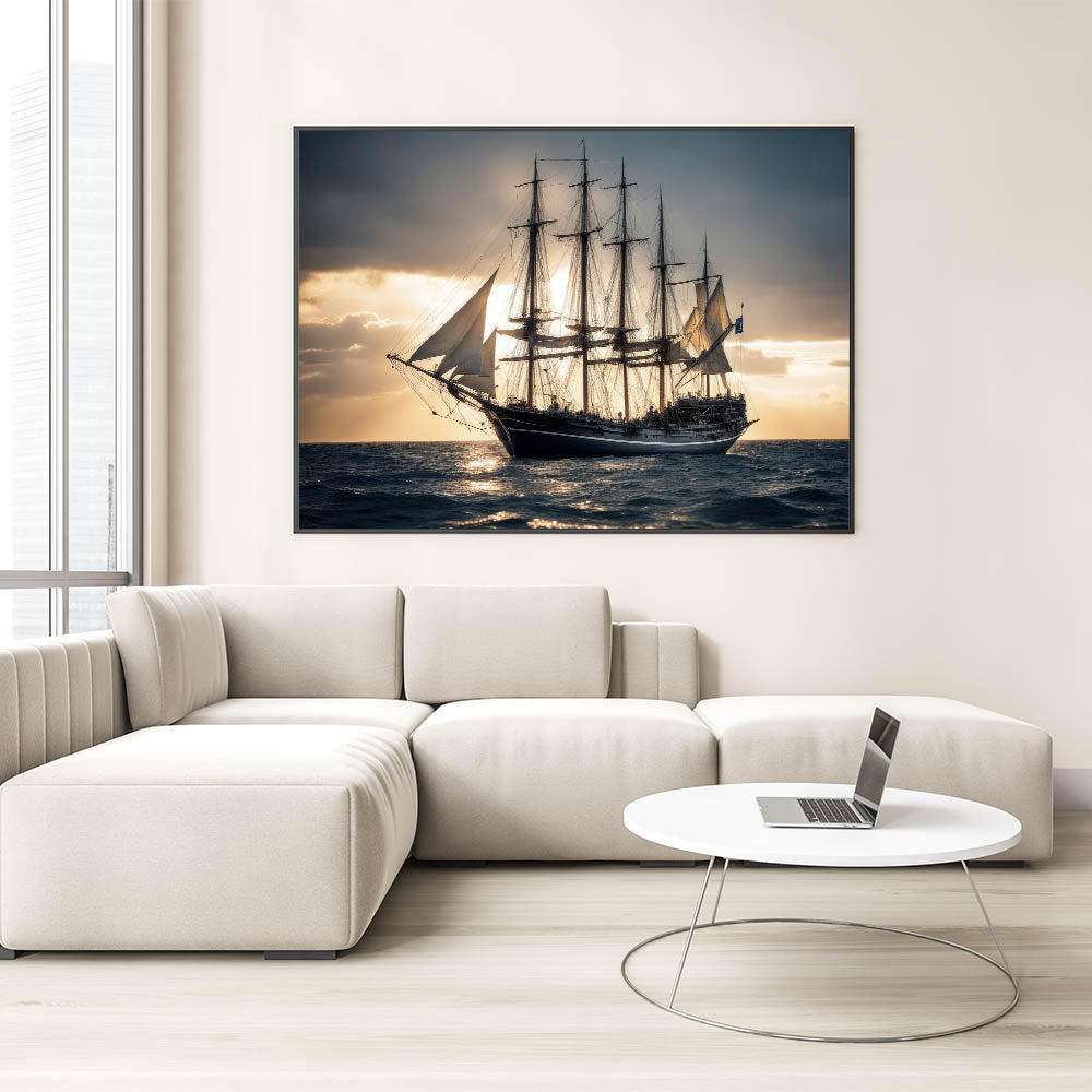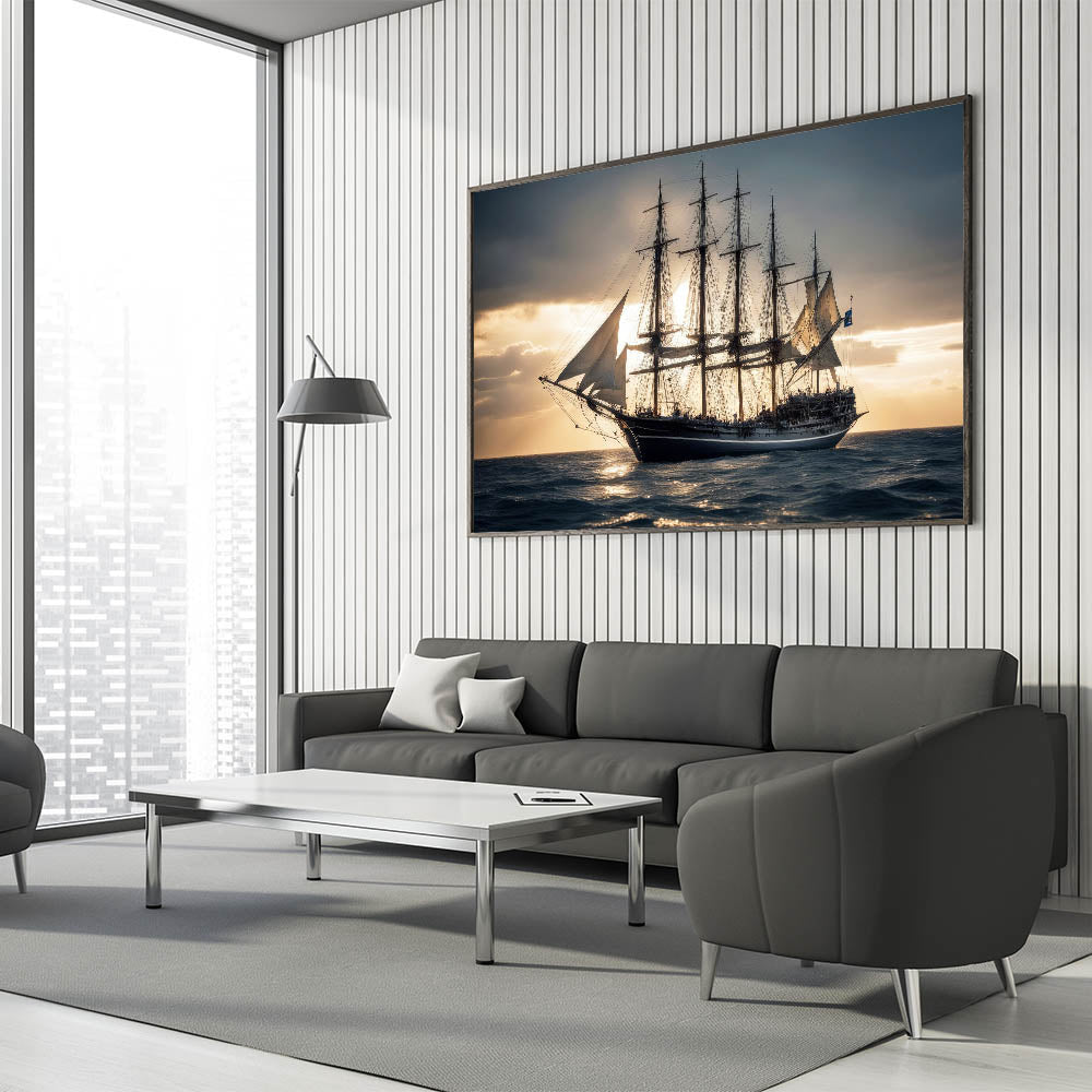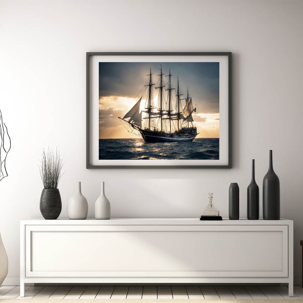 Step back in time with the "Majestic Tall Ship" wall art, a tribute to the grandeur of classic sailing vessels. This breathtaking piece captures a majestic tall ship as it sails through the open ocean, illuminated by the soft, golden light of the setting sun. The intricate rigging, towering masts, and billowing sails create a scene that is both powerful and serene, evoking a sense of adventure and nostalgia.