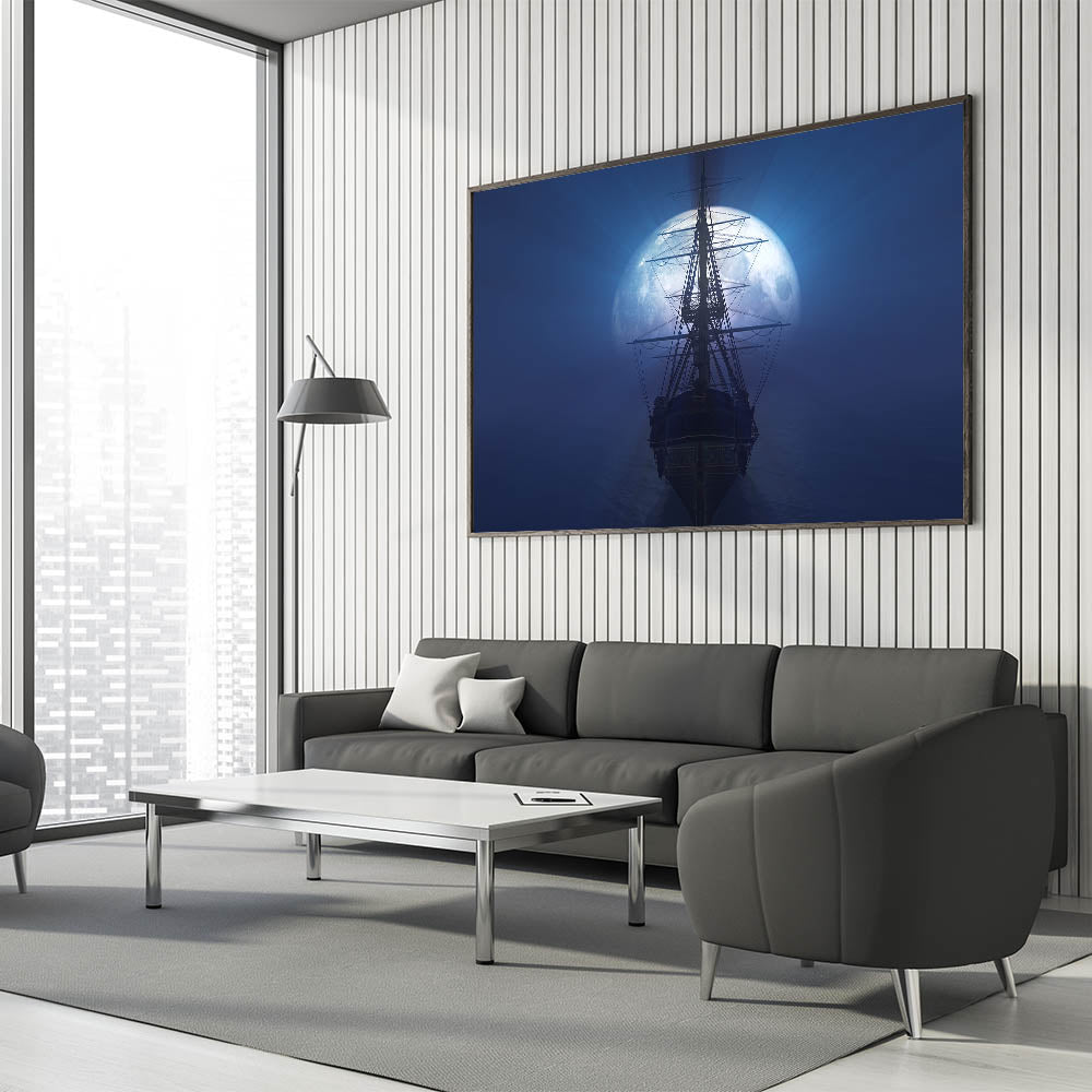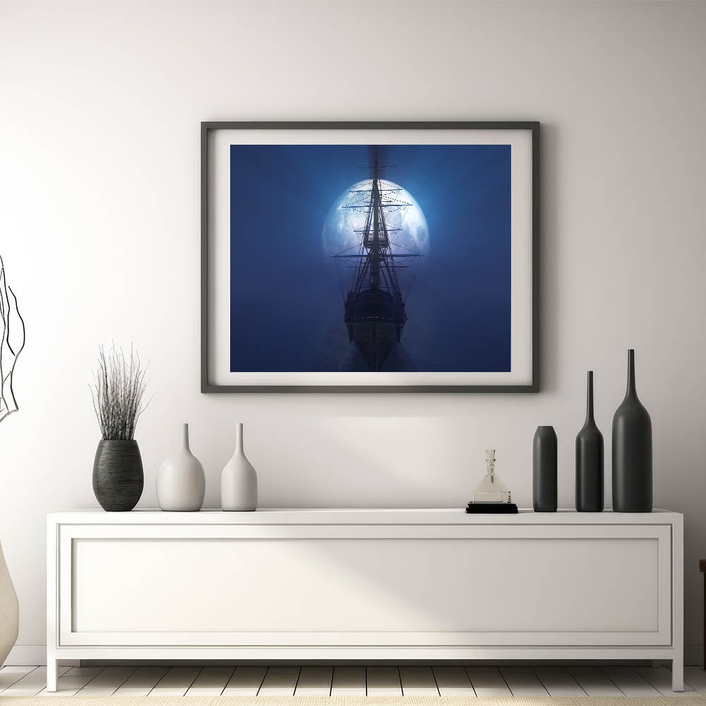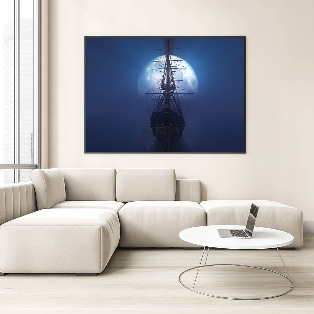Step into a world of mystery and intrigue with this captivating moonlit ship wall art. This striking piece features a ship silhouetted against a glowing full moon, casting an eerie and enchanting light across the dark ocean. The deep blues and silvery tones create a hauntingly beautiful atmosphere, perfect for those who love the romance and mystery of the sea at night. This artwork makes an ideal addition to any space with a nautical or fantasy theme, adding a touch of drama and wonder to your decor.