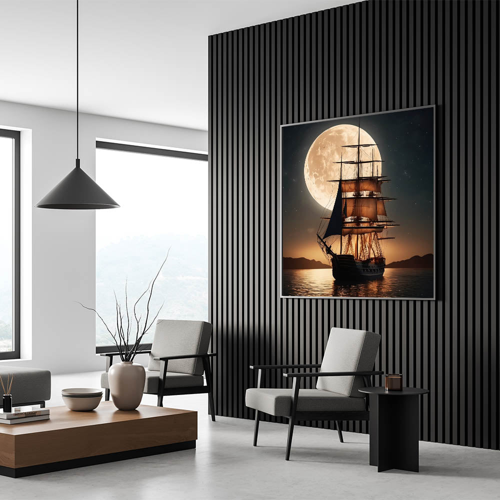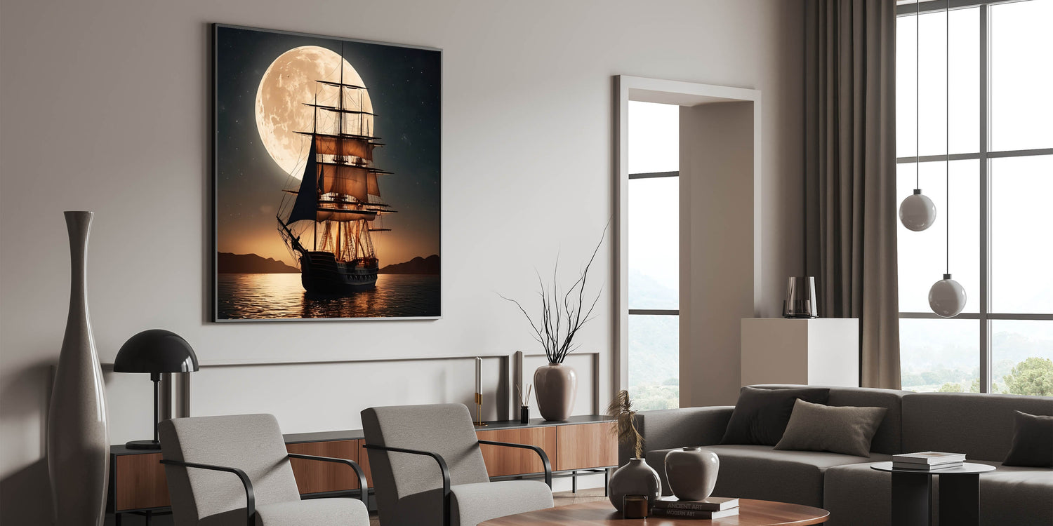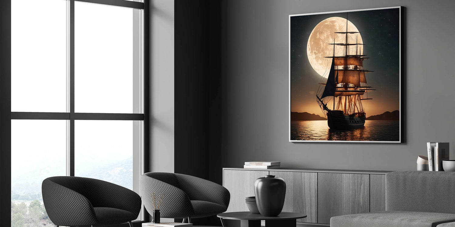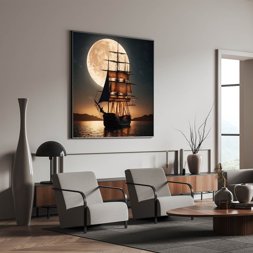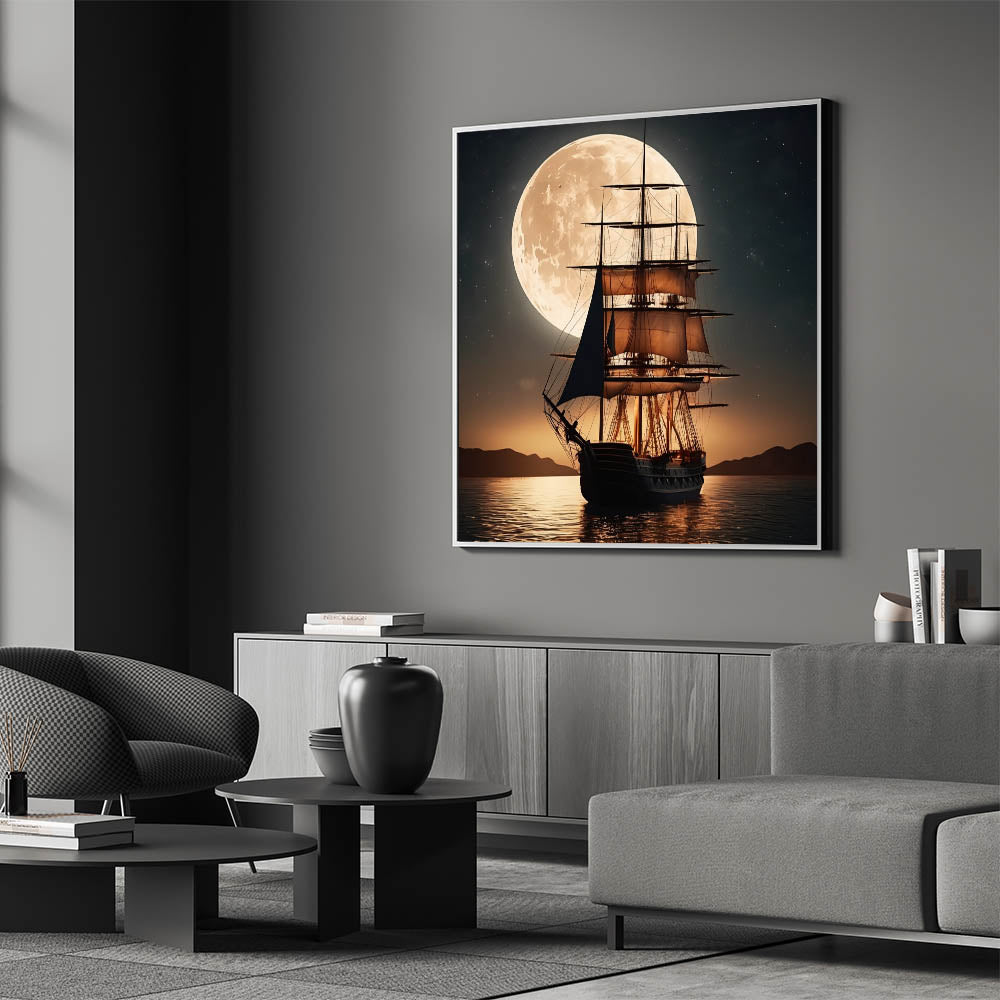 Step into the mysterious allure of the night sea with this captivating "Moonlit Tall Ship Wall Art." This artwork showcases a magnificent tall ship silhouetted against a full, glowing moon, creating an enchanting and dramatic scene that is both powerful and serene. The intricate details of the ship’s sails and rigging are beautifully highlighted by the moonlight, making this piece a stunning focal point for any room with a nautical or night-inspired theme. Available in various formats, including stretched canvas, framed canvas, acrylic glass, and framed prints, this versatile artwork adds a touch of magic and adventure to your space.