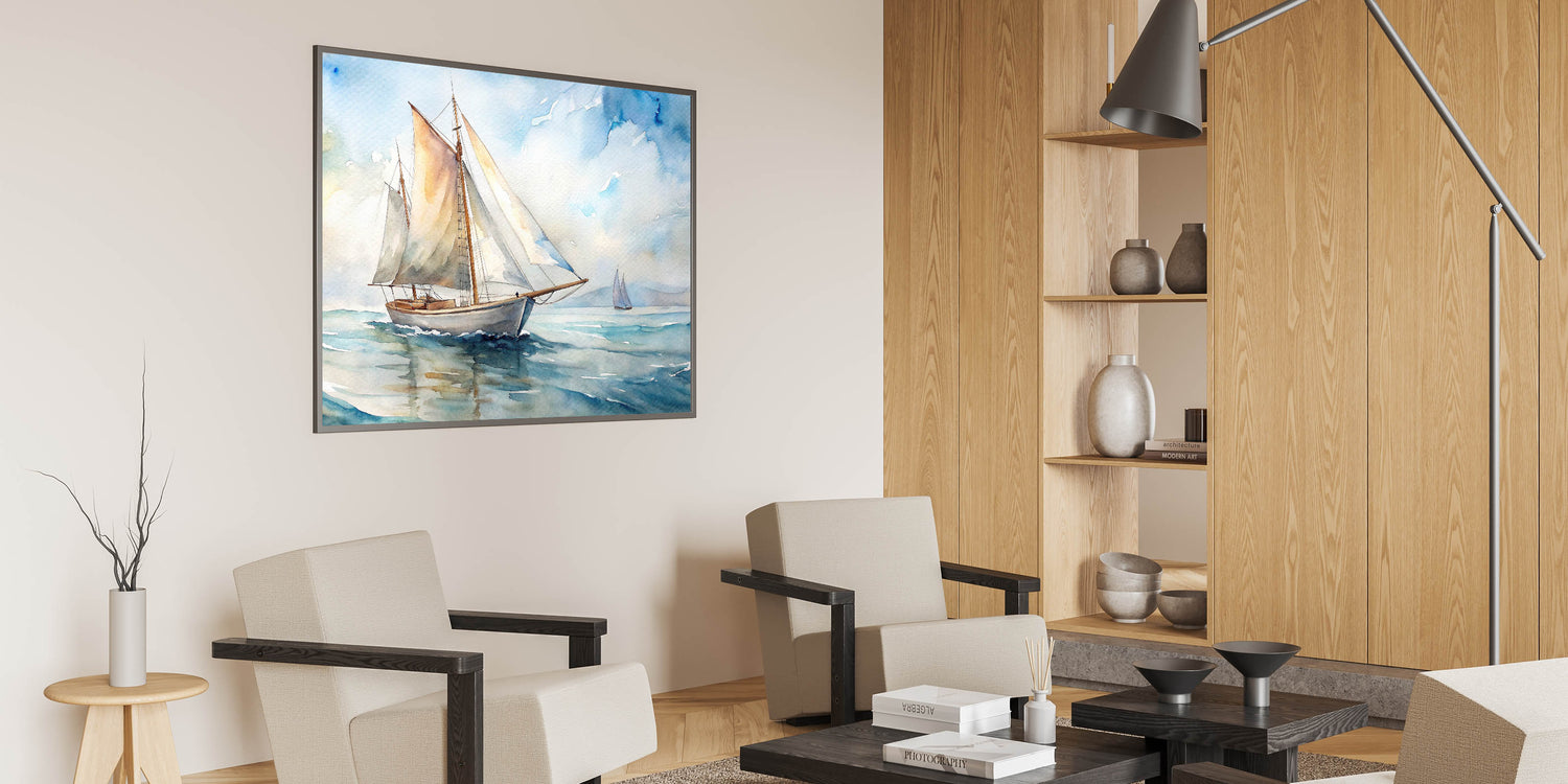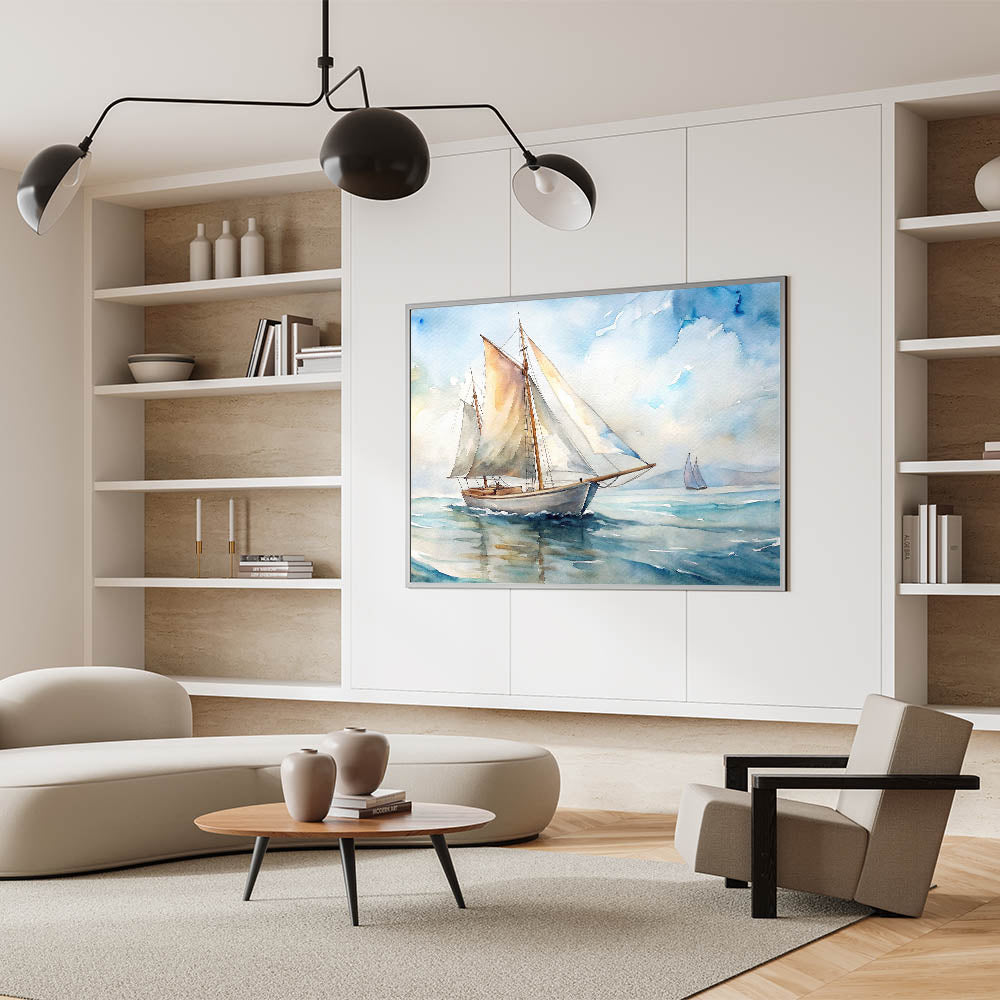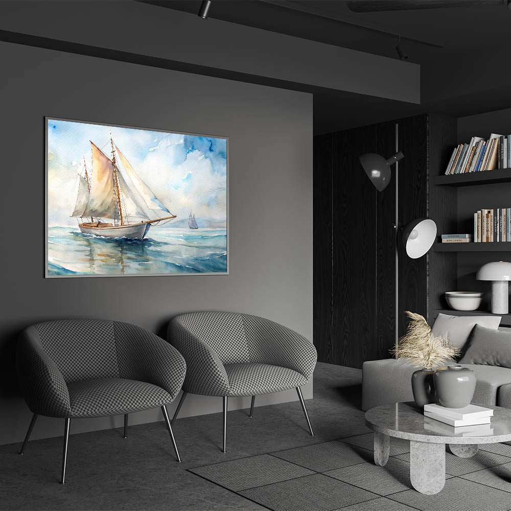 Embrace the refreshing beauty of the open sea with the "Ocean Breeze" wall art. This captivating piece features a sailboat gracefully navigating through gentle waves, brought to life in soft watercolor tones. The delicate blending of blues and greens in the sky and sea, combined with the warm, earthy hues of the boat, creates a harmonious scene that exudes calm and tranquility. This artwork is perfect for adding a touch of coastal charm to any room.