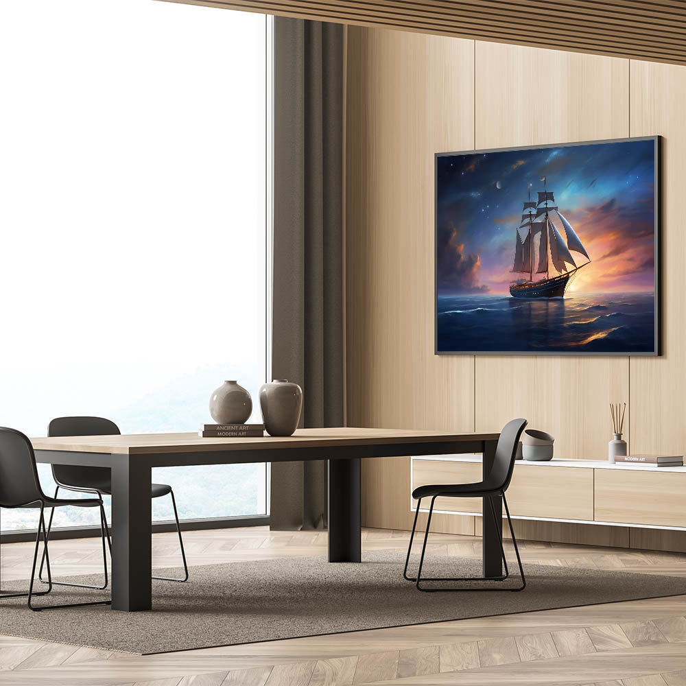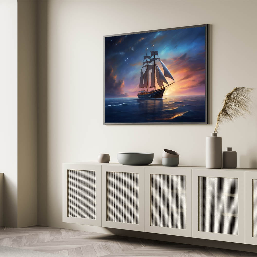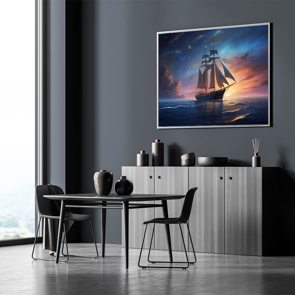 Whether you're drawn to the mysteries of the night sky or simply appreciate the tranquil beauty of the sea, the "Starlit Voyage" wall art is a perfect addition to your collection. Let the magic of a night sail beneath the stars transform your space.