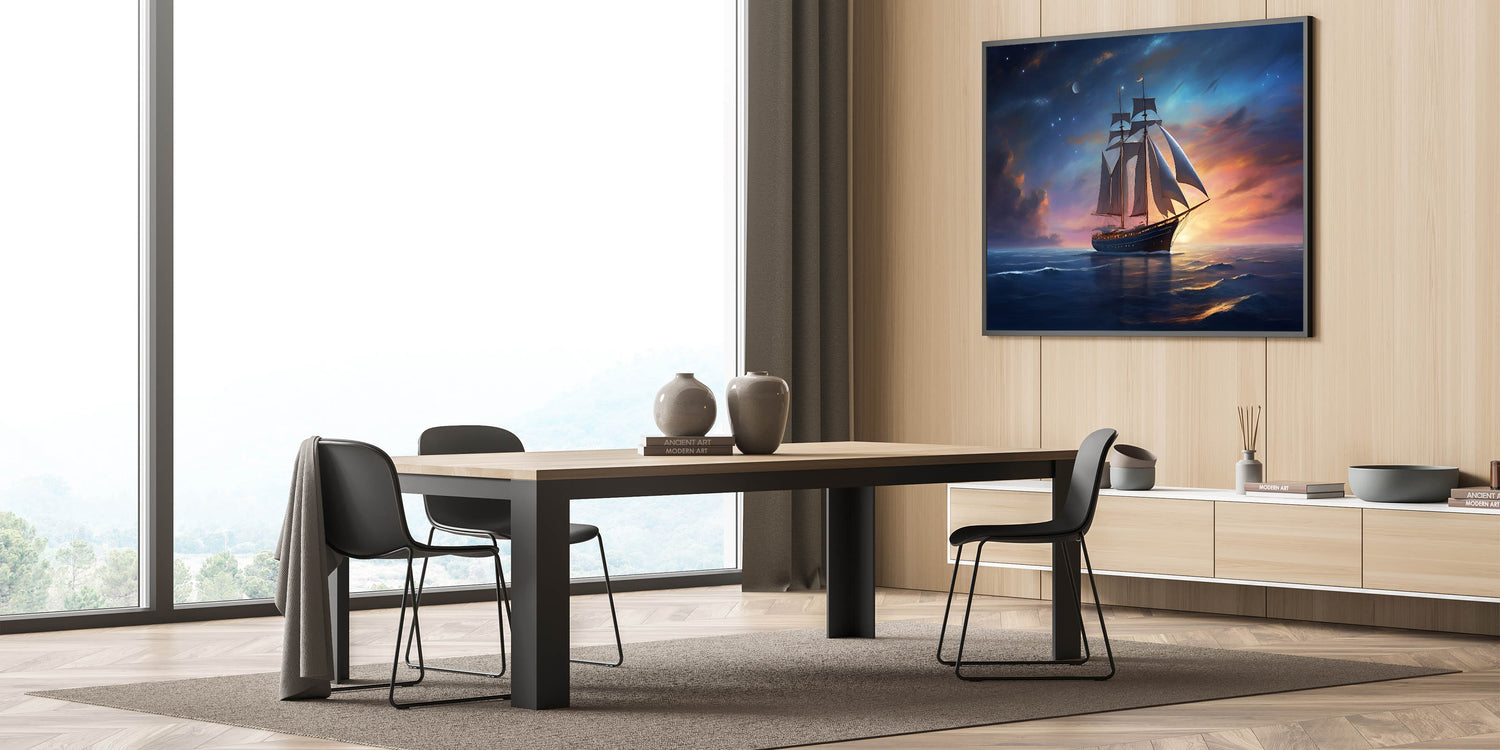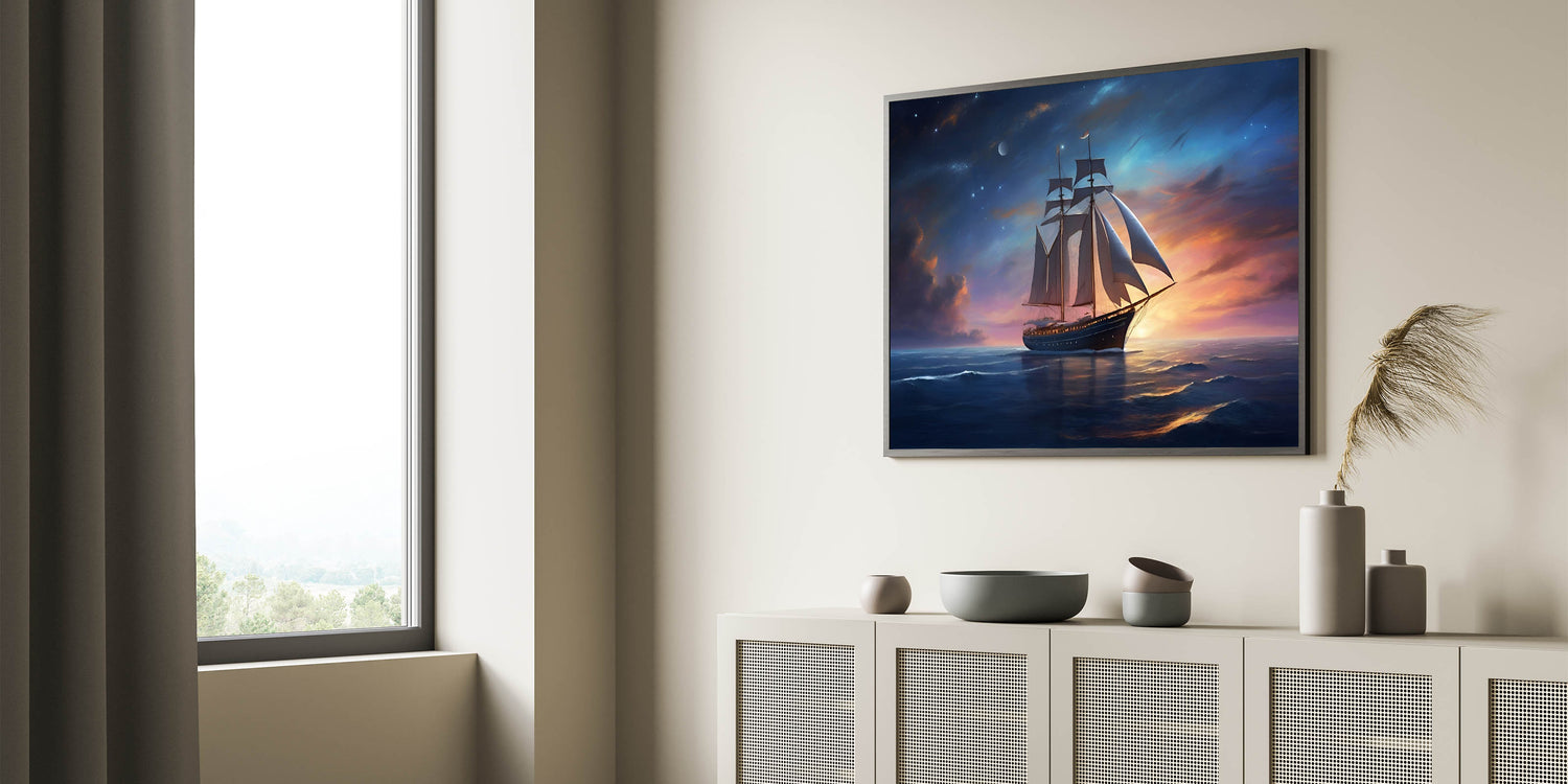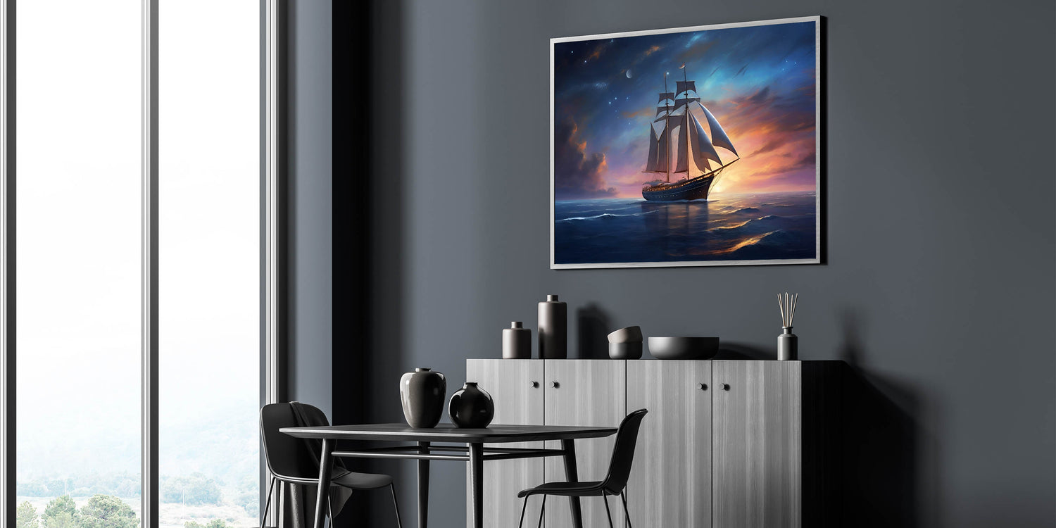 Whether you're drawn to the mysteries of the night sky or simply appreciate the tranquil beauty of the sea, the "Starlit Voyage" wall art is a perfect addition to your collection. Let the magic of a night sail beneath the stars transform your space.