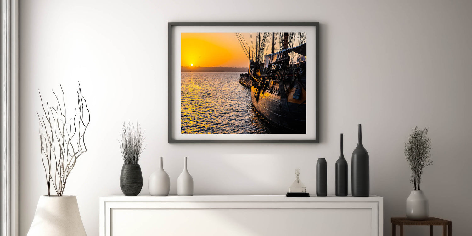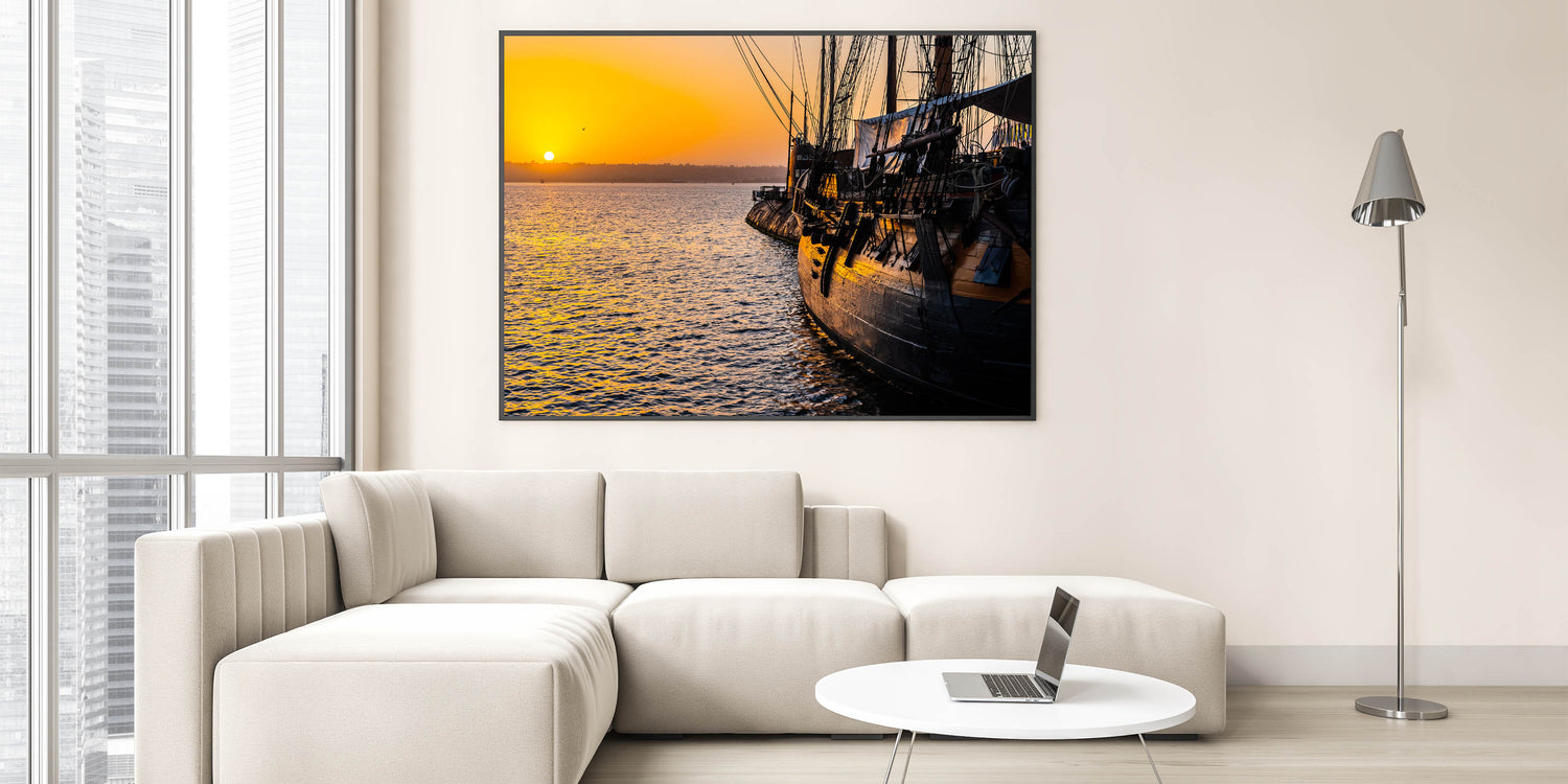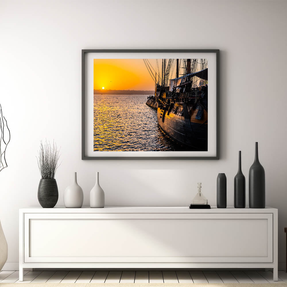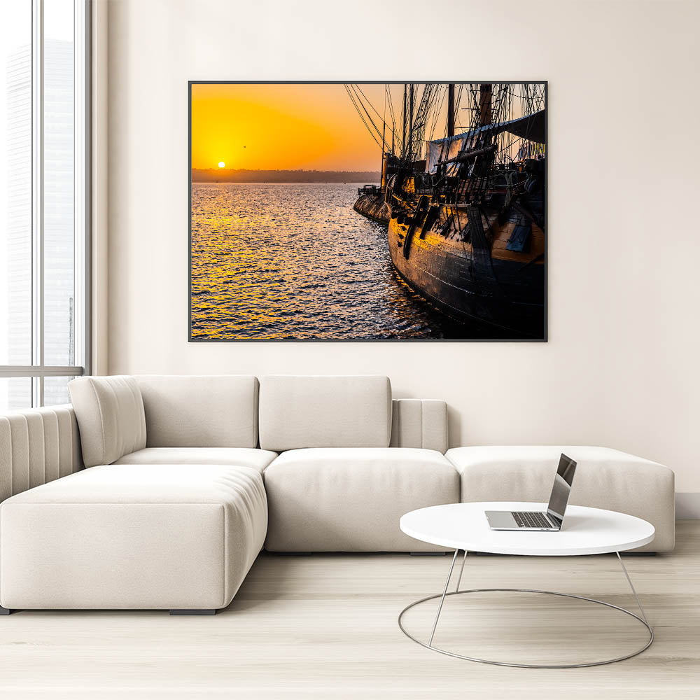 Capture the tranquil beauty of a harbor at sunset with this stunning sunset harbor ship wall art. This piece features a historic ship docked at a harbor as the sun sets in the background, casting a warm, golden glow over the water and the ship’s weathered wood. The serene and reflective atmosphere created by the vibrant sunset makes this artwork an ideal addition to any room with a nautical or maritime theme, bringing a sense of calm and history into your space.