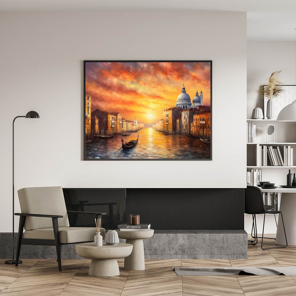 Capture the breathtaking beauty of a Venetian sunset with this stunning gondola wall art, featuring a vibrant sky ablaze with warm hues as a gondola glides through the tranquil waters of Venice. This Venice gondola print showcases the romantic and timeless charm of Italy’s most iconic city, where the historic architecture is bathed in the golden glow of the setting sun. The rich colors and dynamic composition make this artwork a perfect centerpiece for any room, adding warmth and elegance to your decor.