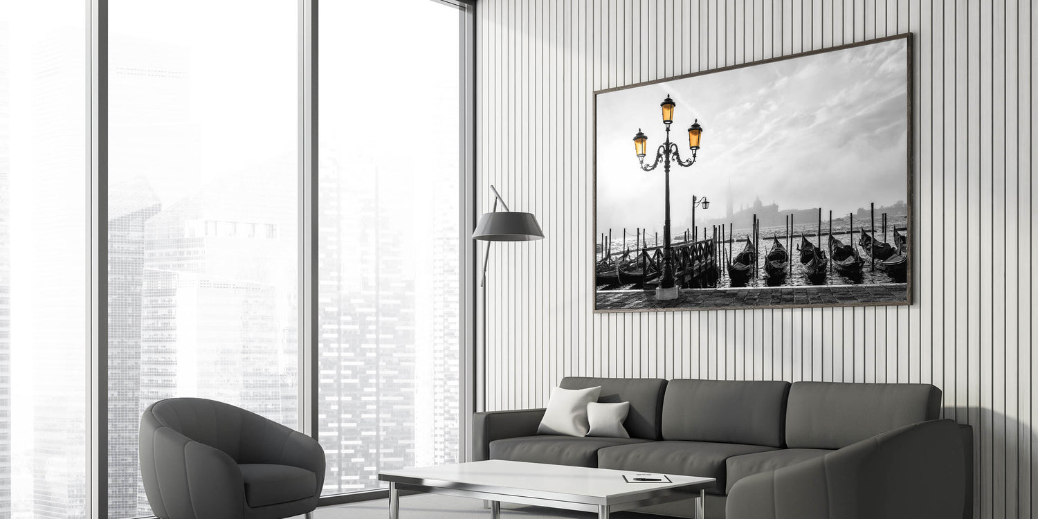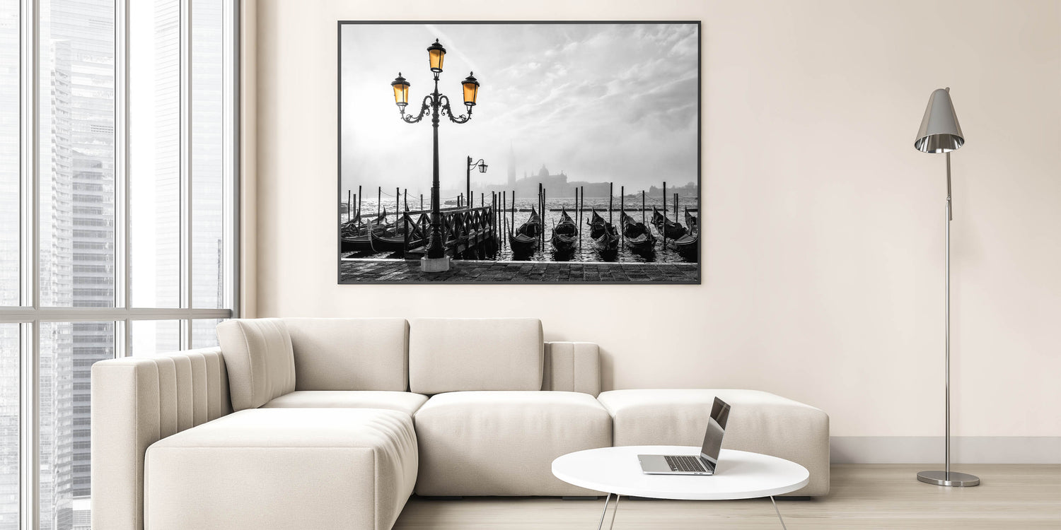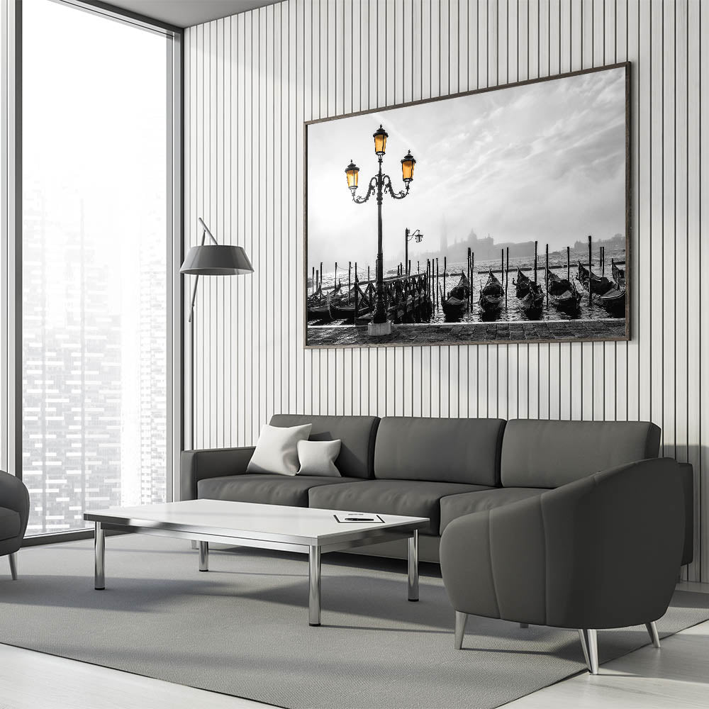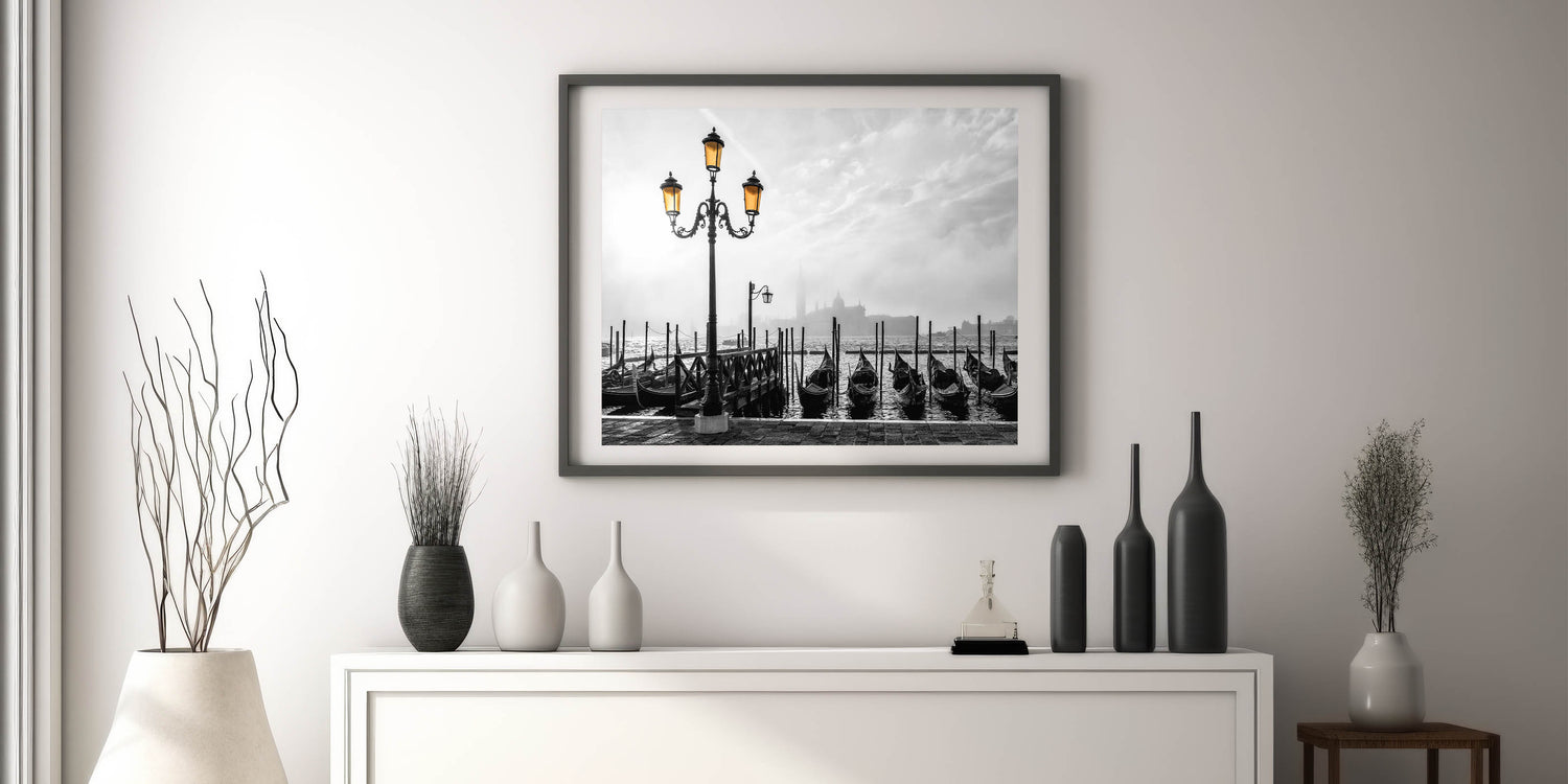 This Venice gondola artwork is perfect for those who appreciate the subtle beauty of black and white photography. The serene scene and elegant design make it a versatile addition to any decor, adding a touch of timeless Italian charm.