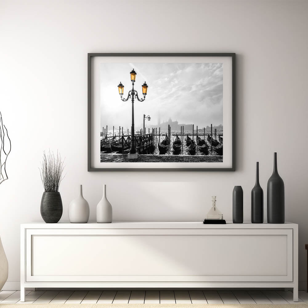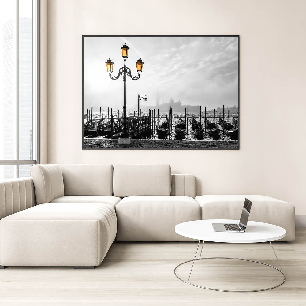 Add a touch of classic elegance to your decor with this striking black and white Venice gondola wall art. The image captures the timeless beauty of gondolas docked along the Venetian waterfront, with the city’s iconic architecture shrouded in mist in the background. The soft lighting from the vintage street lamps adds a warm, nostalgic glow to the scene, contrasting beautifully with the monochrome palette. This artwork is perfect for anyone looking to bring a sophisticated and serene atmosphere into their home.