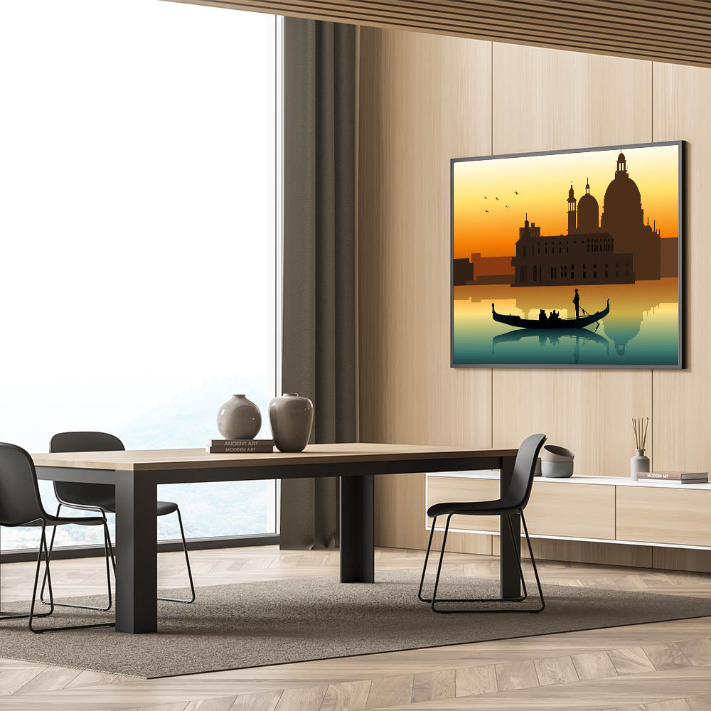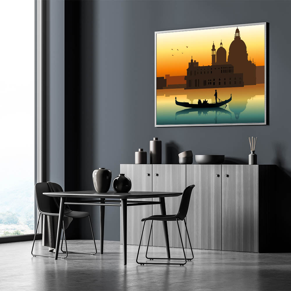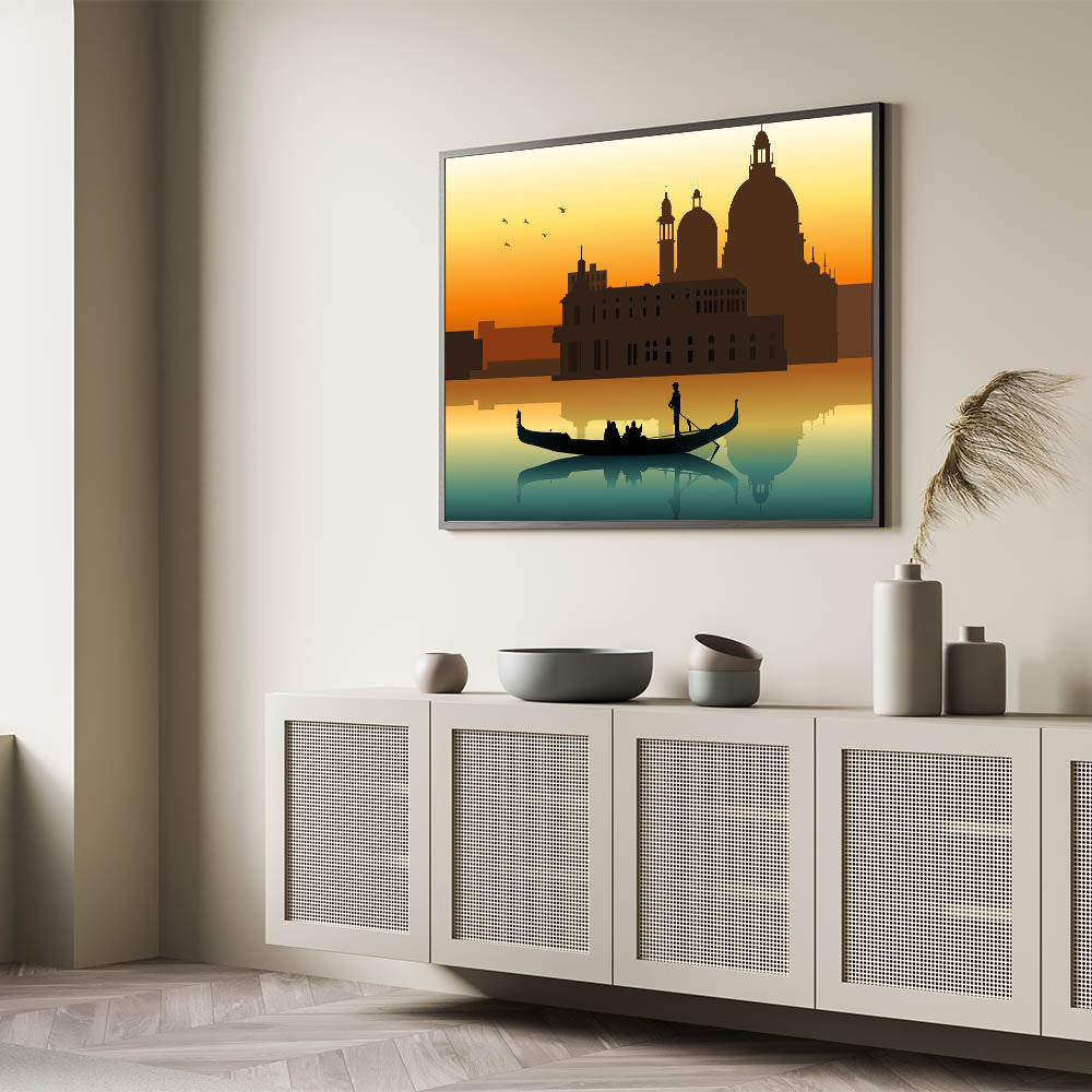 Immerse yourself in the enchanting beauty of Venice with this captivating gondola silhouette wall art. This piece showcases a serene sunset over the Venetian canals, where the dark silhouette of a gondola glides smoothly through the calm waters. The rich hues of the sunset create a mesmerizing contrast, making this artwork a stunning addition to any space that seeks to evoke the romance and mystery of Italy’s most famous city.