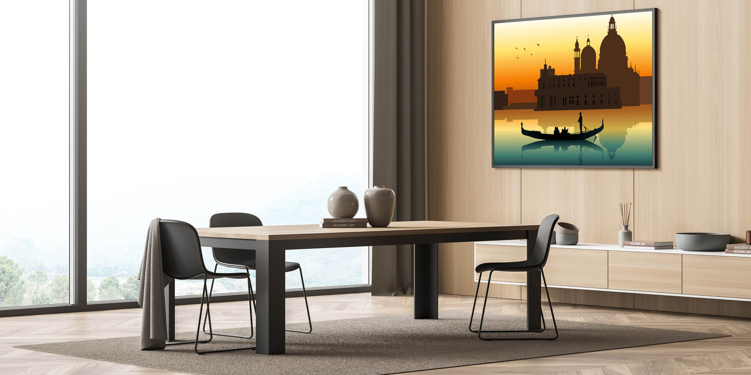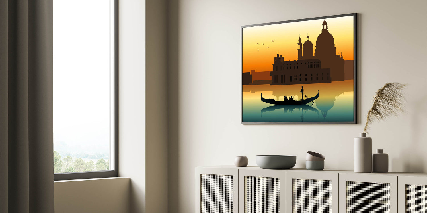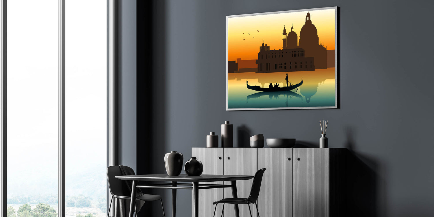 Immerse yourself in the enchanting beauty of Venice with this captivating gondola silhouette wall art. This piece showcases a serene sunset over the Venetian canals, where the dark silhouette of a gondola glides smoothly through the calm waters. The rich hues of the sunset create a mesmerizing contrast, making this artwork a stunning addition to any space that seeks to evoke the romance and mystery of Italy’s most famous city.