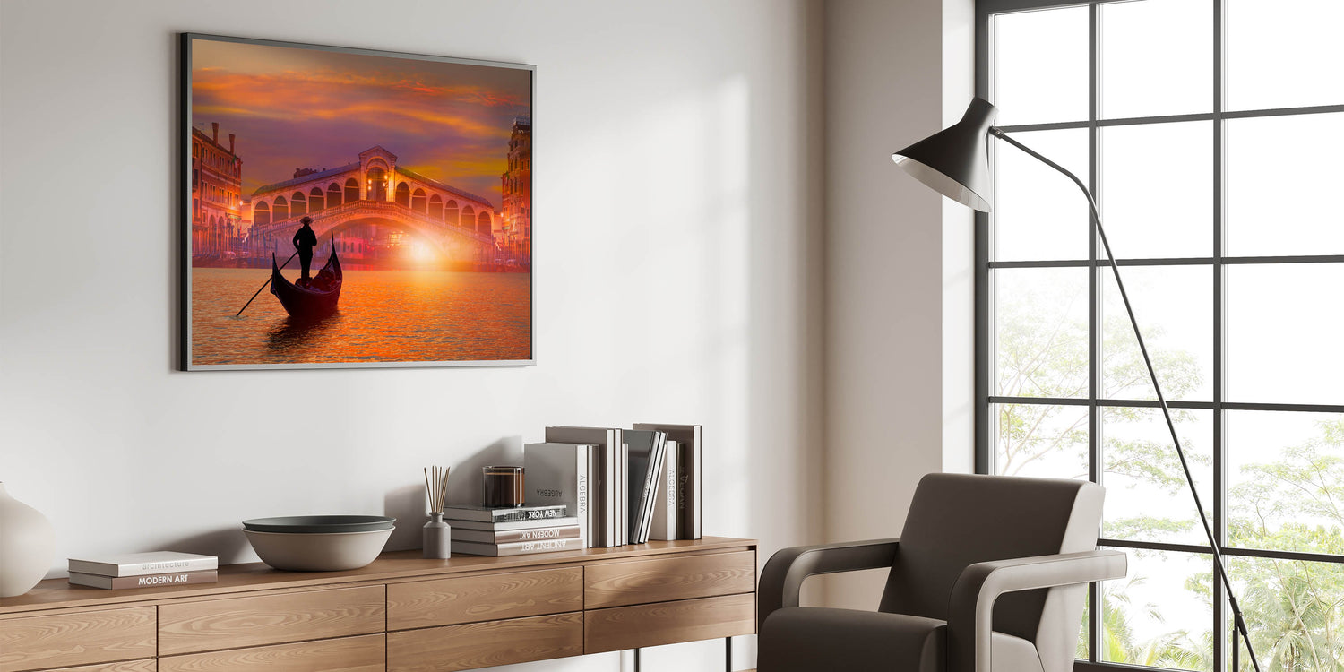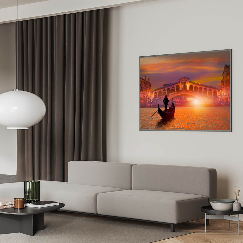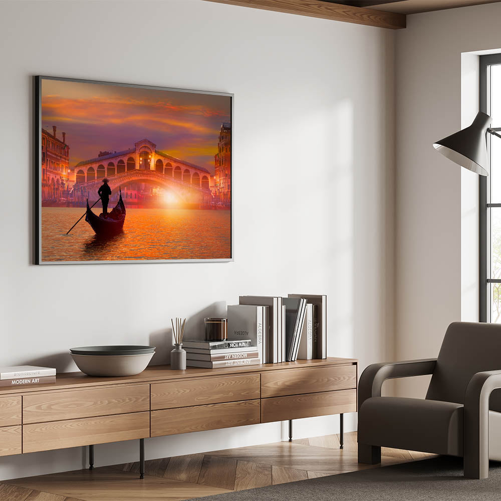 This Venice gondola artwork is perfect for those who love the romance and history of Italy. The glowing sunset and iconic Venetian architecture make this piece a standout addition to any room.