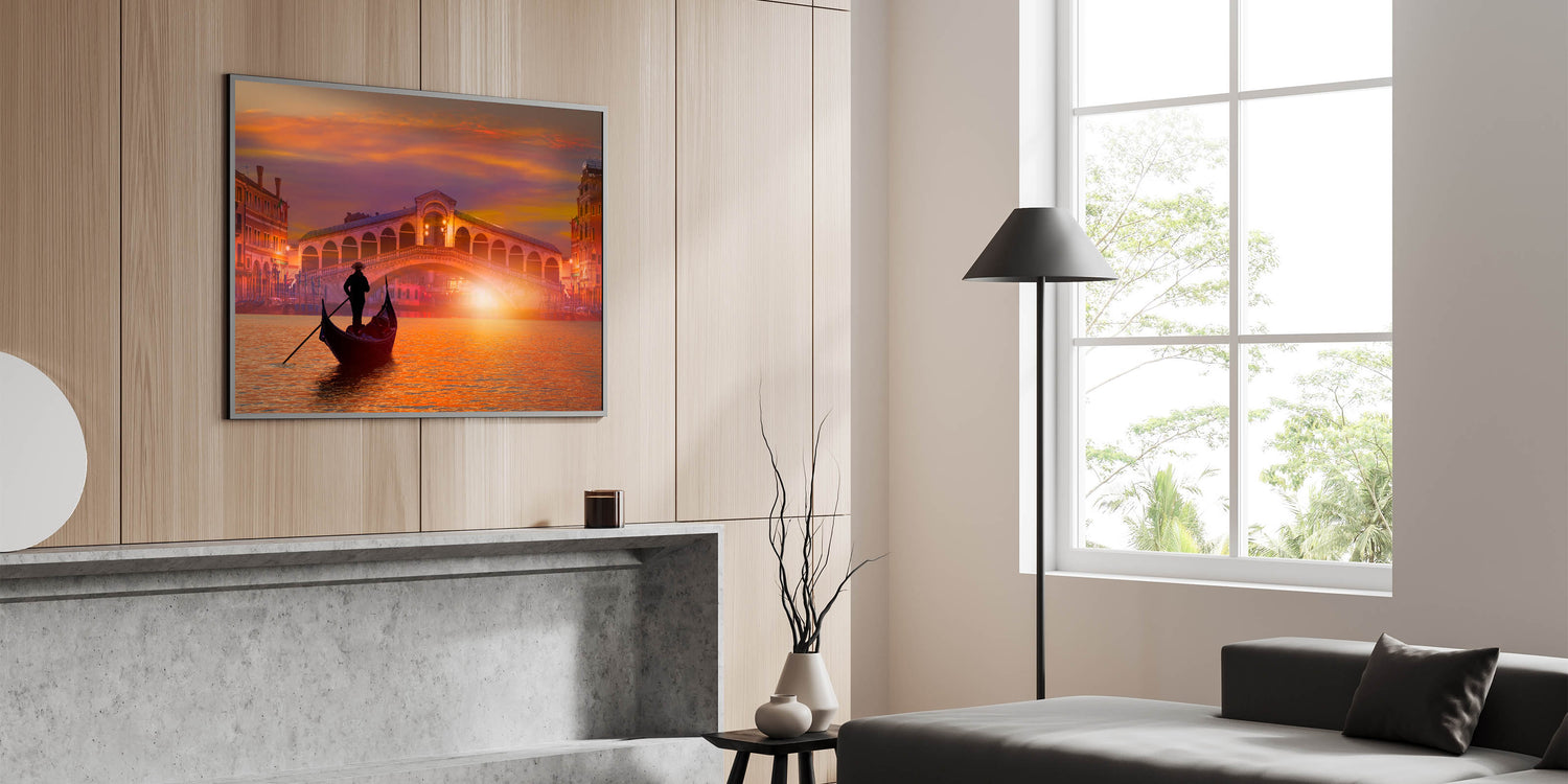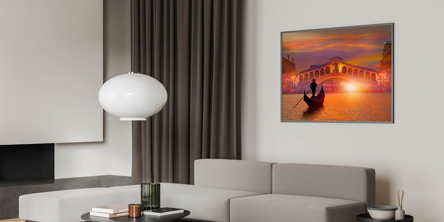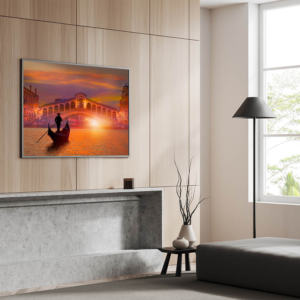 This Venice gondola artwork is perfect for those who love the romance and history of Italy. The glowing sunset and iconic Venetian architecture make this piece a standout addition to any room.