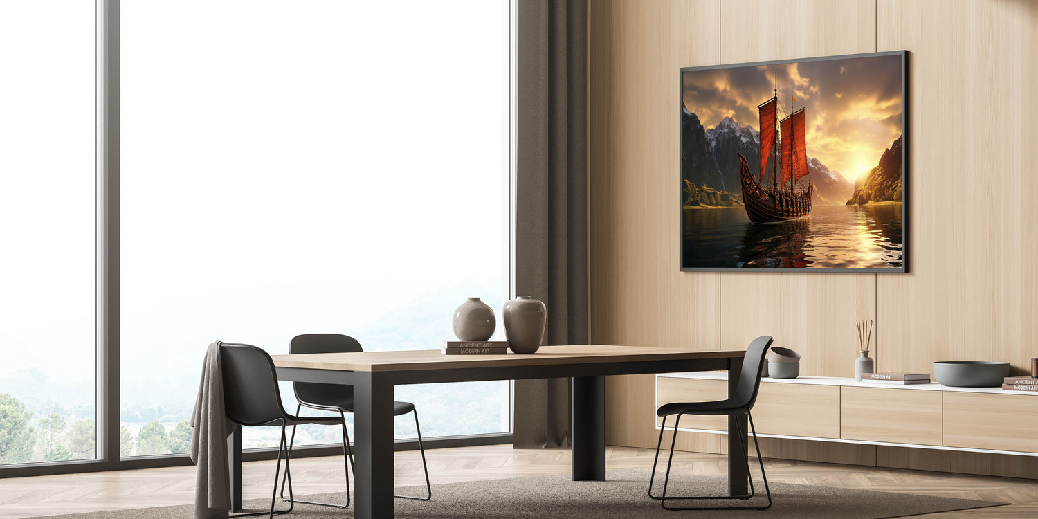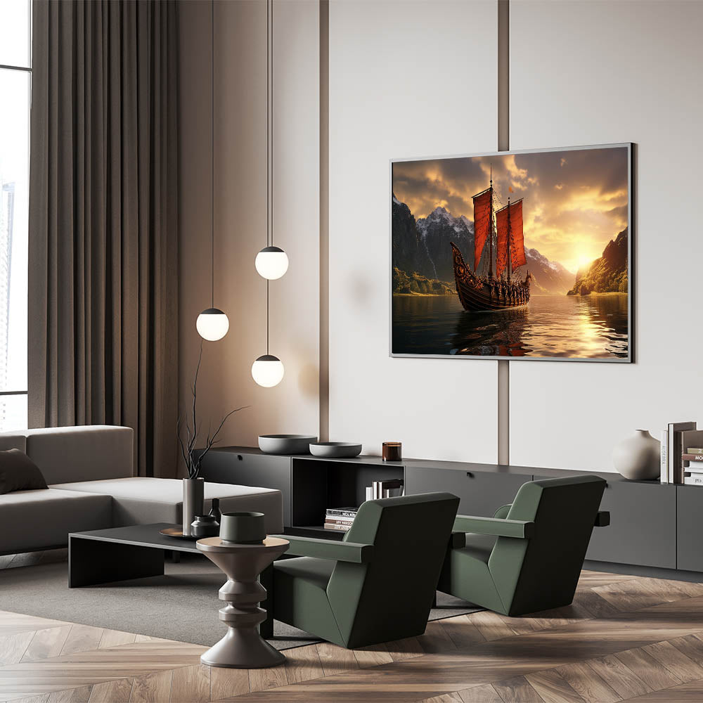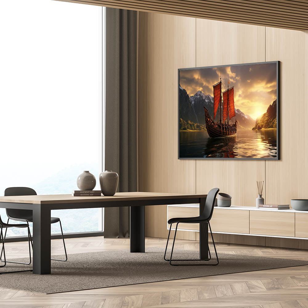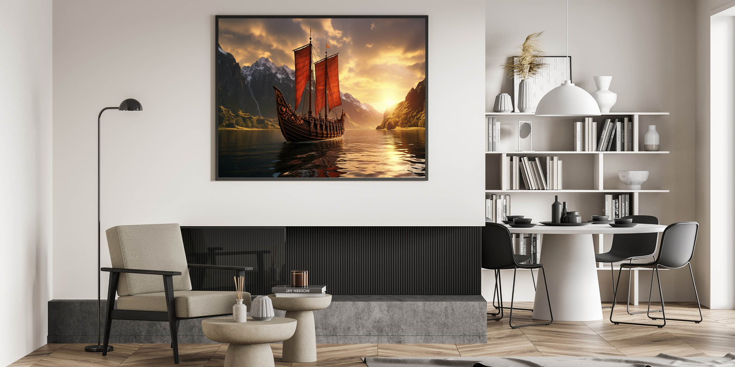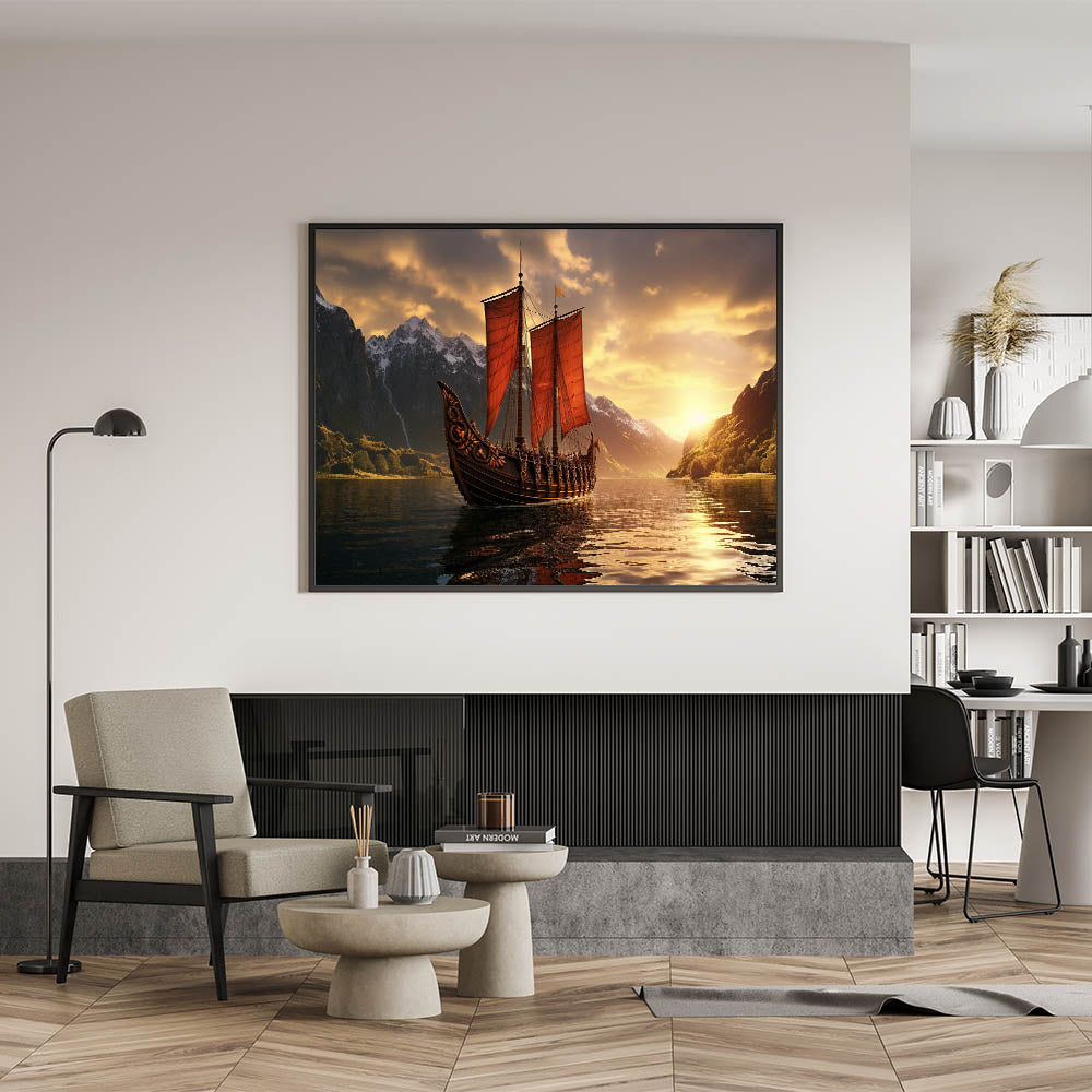 Set sail into the heart of history with this epic depiction of a Viking longship at sunset. This striking artwork captures the powerful silhouette of a Viking ship with its majestic red sails glowing in the golden light of the setting sun, as it navigates through serene waters surrounded by towering, rugged mountains. The attention to detail in the ship's ornate carvings and the dramatic landscape creates a sense of adventure and grandeur, making it a perfect piece for those who admire the rich history of the Vikings. Available in various formats, including stretched canvas, framed canvas, and acrylic glass, this artwork brings a touch of epic storytelling to any room.